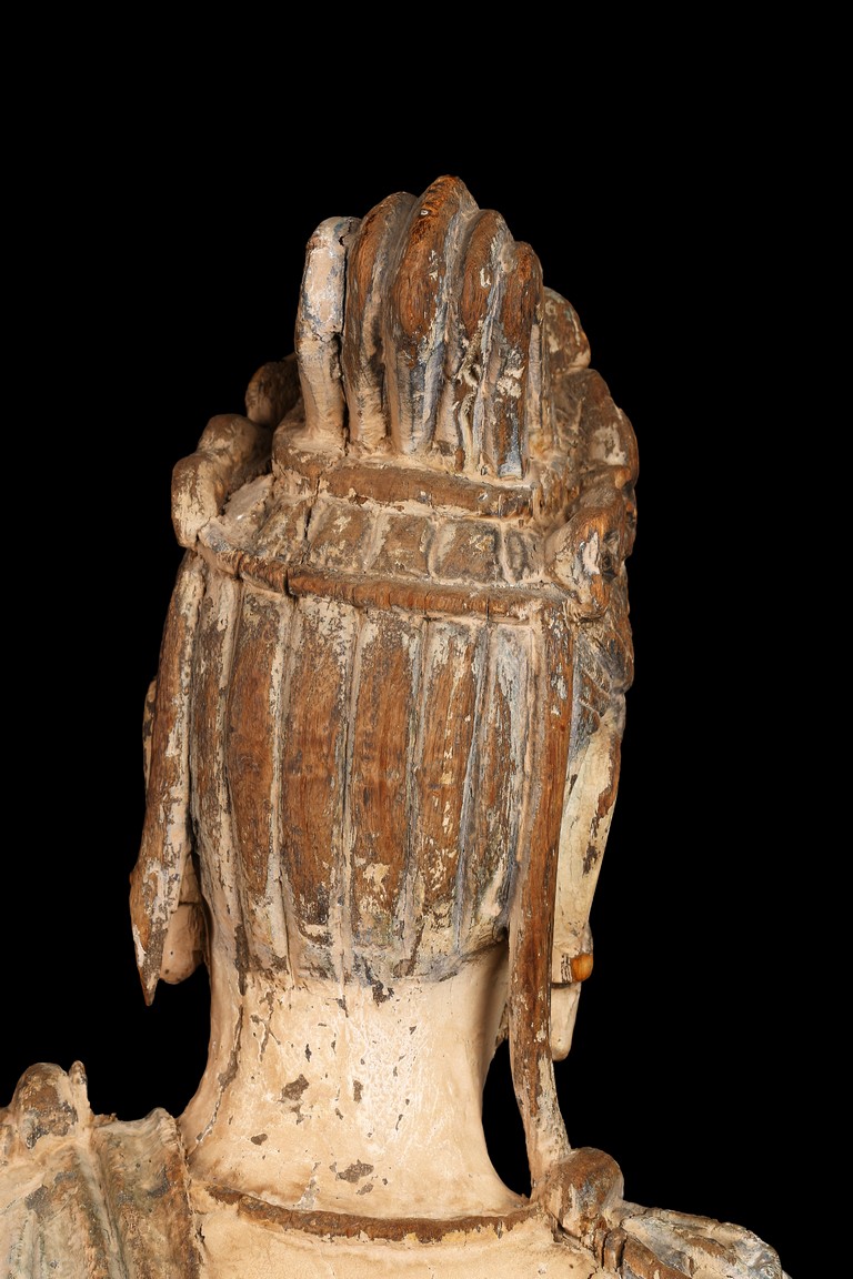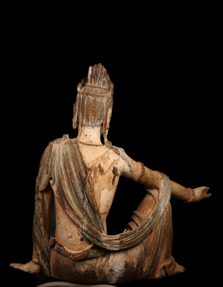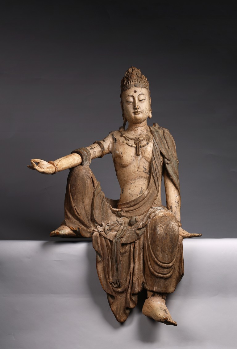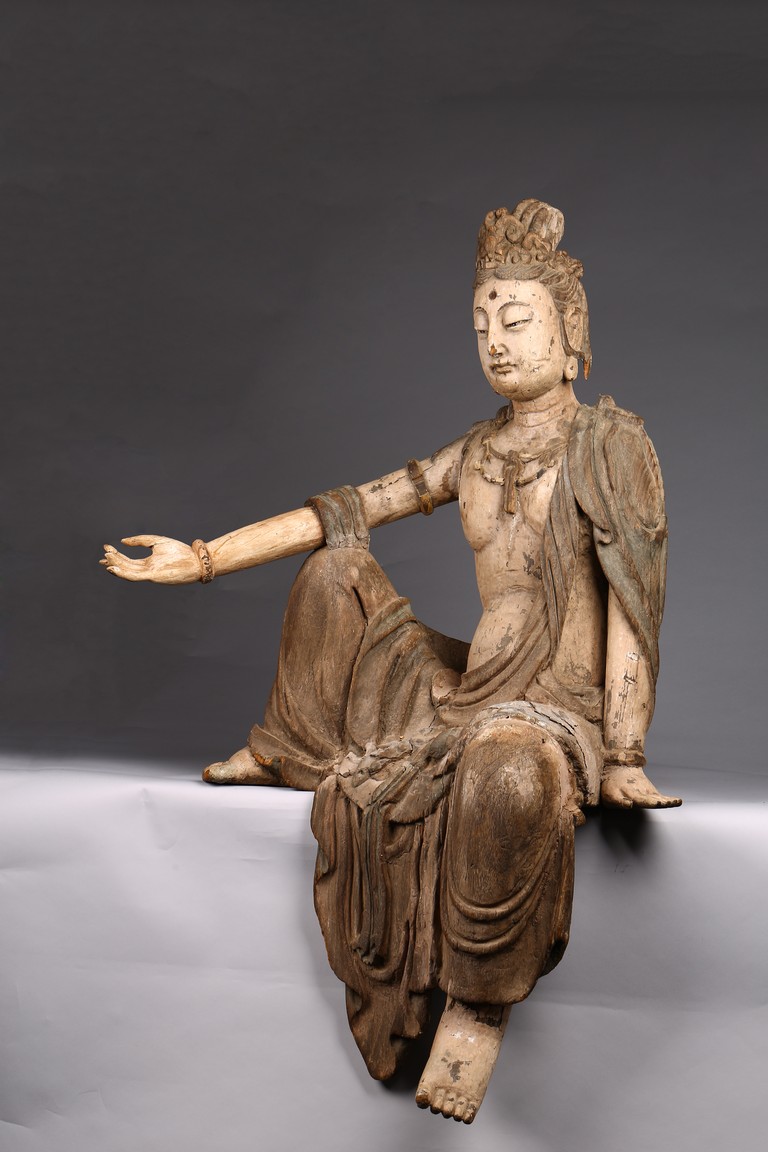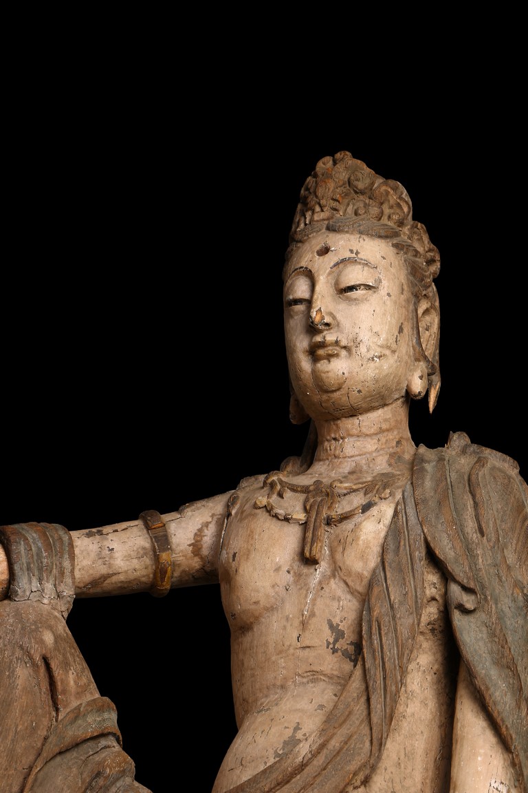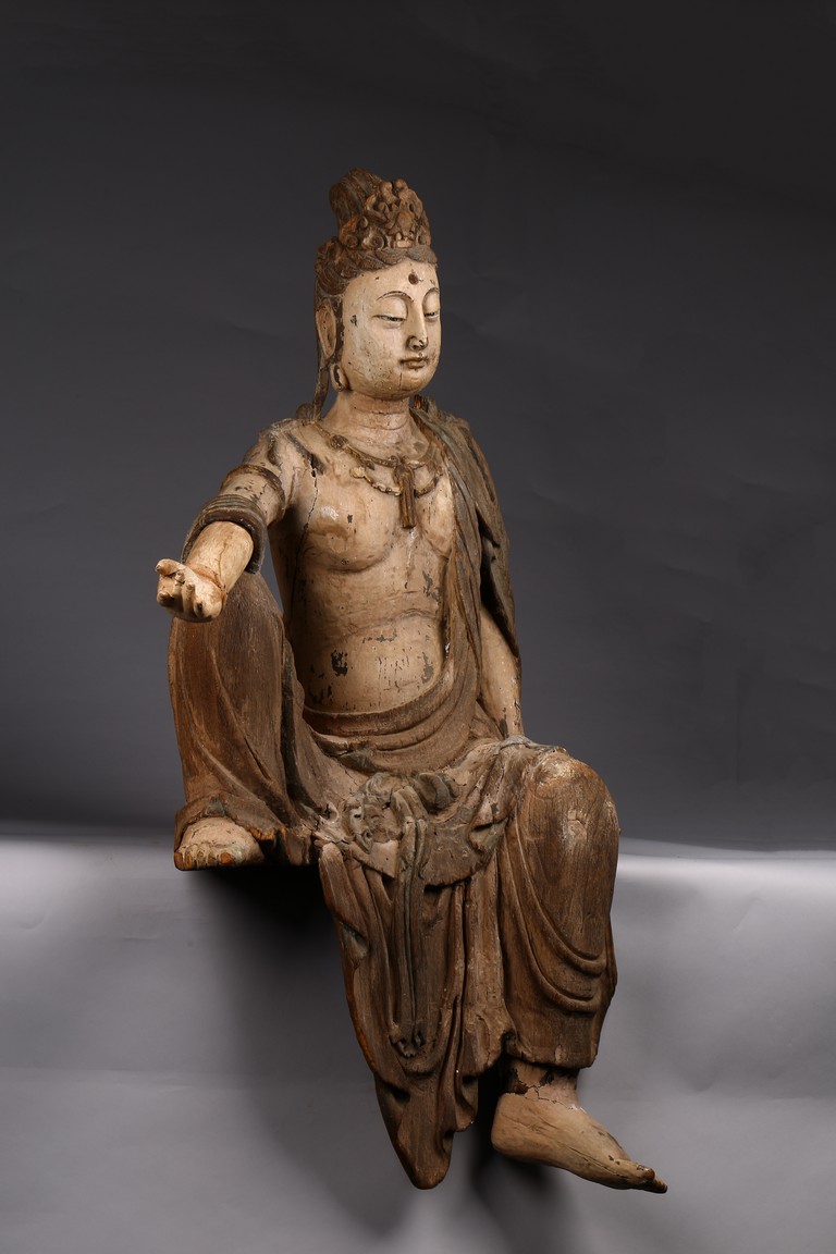 Carved seated in rajalilisana with the right arm rested on the raised right knee, wearing a dhoti open at the chest to reveal an elaborate necklace, the shoulders draped with a shawl, the face with a benevolent expression beneath the hair piled up into a high chignon. Song Dynasty period.