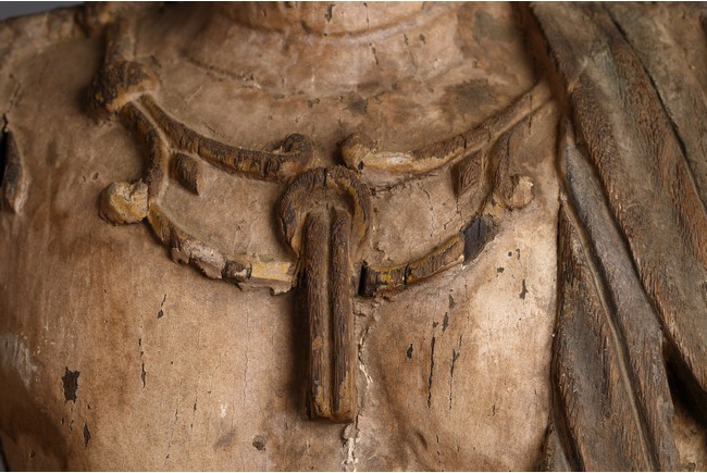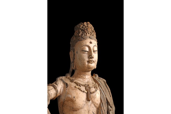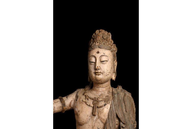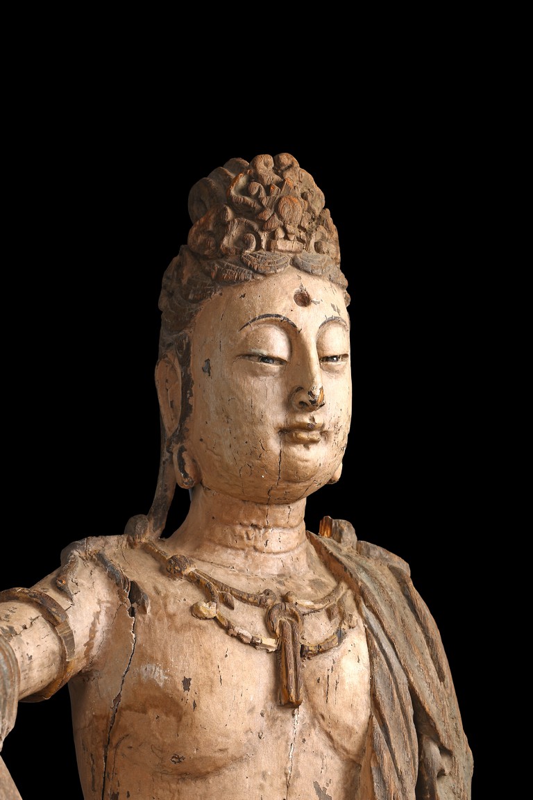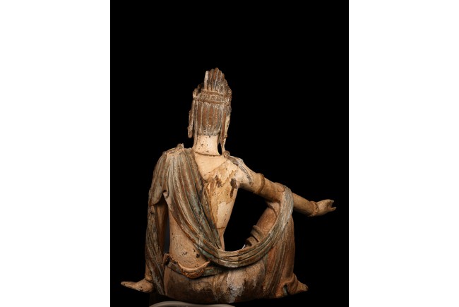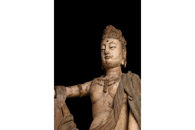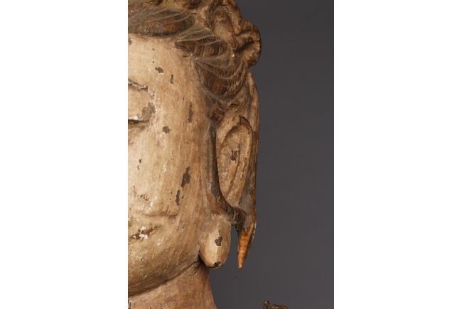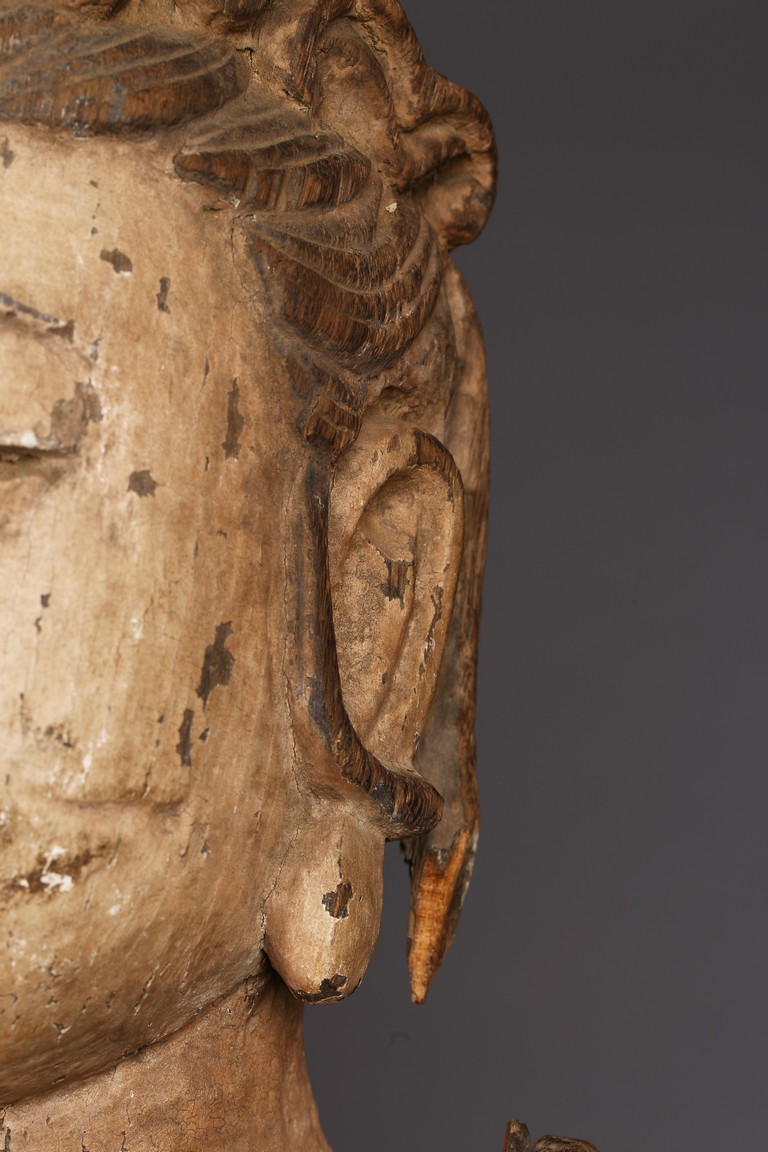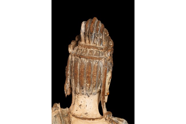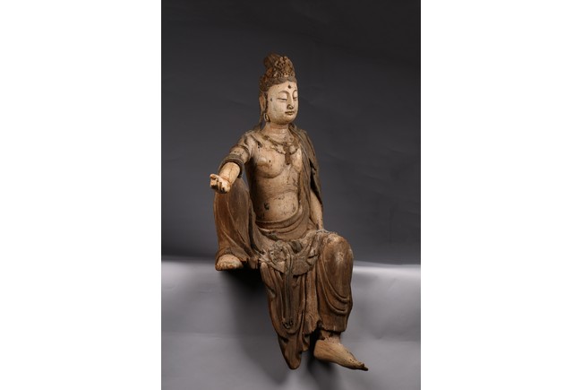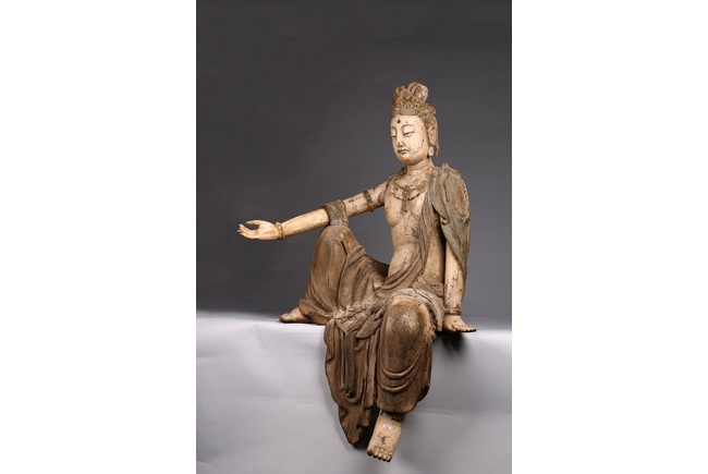 Carved seated in rajalilisana with the right arm rested on the raised right knee, wearing a dhoti open at the chest to reveal an elaborate necklace, the shoulders draped with a shawl, the face with a benevolent expression beneath the hair piled up into a high chignon. Song Dynasty period.