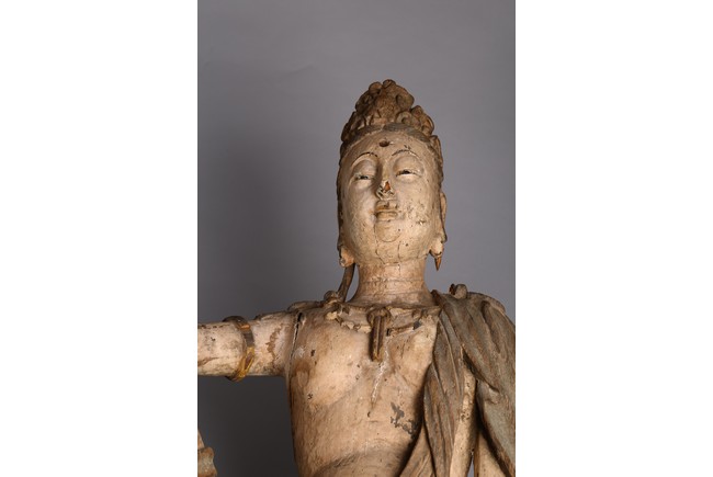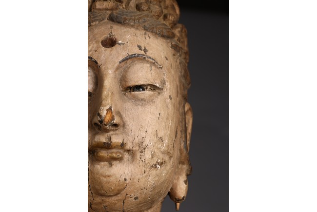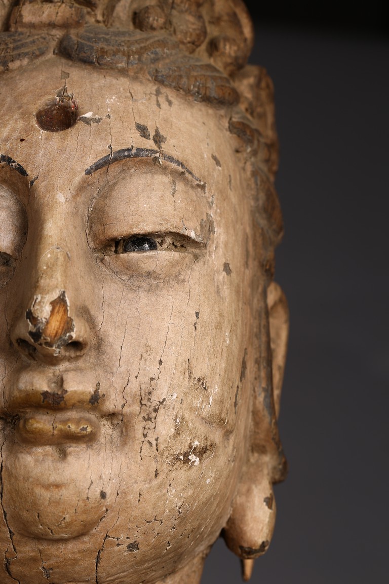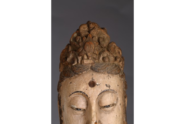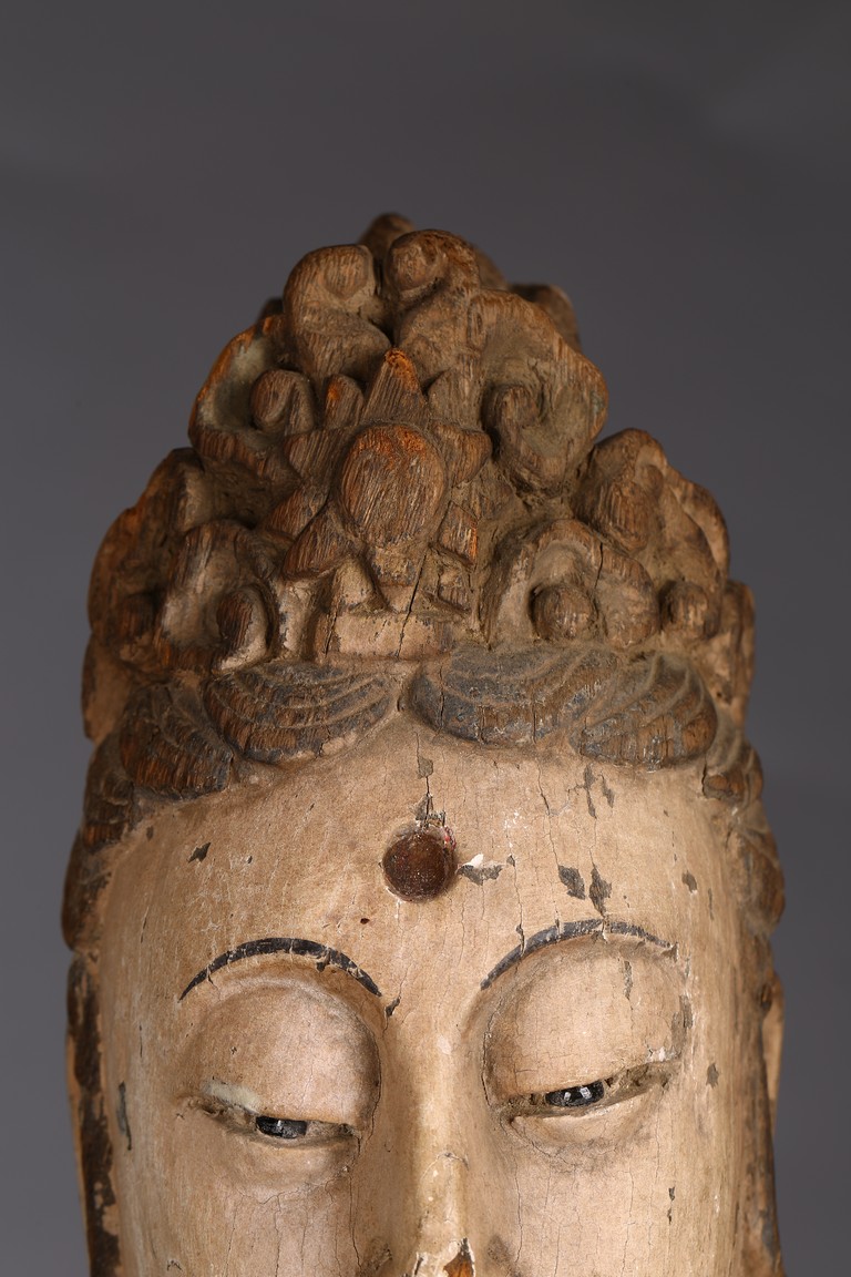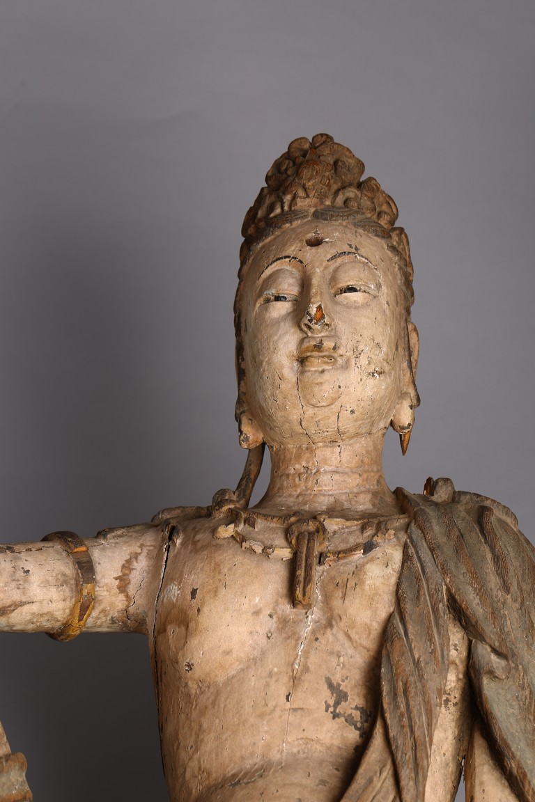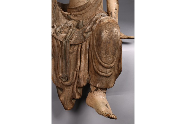 Reference: Please refer to a similar Guanyin carving, sold for 458,500 GBP, at Sotheby's London in March 2013, Lot 89. Provence: Property from an important private collection, Beverly Hills, California 自在觀音,被認為是觀世音菩薩三十三種化身之一,代表著面容俊美、姿態典雅的觀音形象。在諸多大乘經典,如《楞嚴經》、《法華經》、《華嚴經》中,都有關於其的記述、可見信仰之廣泛。宋代的藝術、美學、科技、人文等,均為前所未有的歷史高峰。宋代開始,全國各地寺院木構造像興起,取代此前隋唐的主流石窟,木雕於新興雕像領域之中獨領風騷,綻放異彩。本件宋代木雕觀音呈自在式坐姿,肌體語言強烈,手腳張力,由靜生動。梳高髮髻,柳眉鳳目,櫻唇瑤鼻,含笑睇視,容貌姣好。其左腿盤曲、右膝弓立;左手撐地、右臂置於左膝之上;目視遠方,姿態自在而超逸,軀體充滿了動人的柔和感與生命活力,既表現了觀音菩薩內在的宗教氣質,又體現了宋人特有的思想信仰和審美情趣,保存至今,十分難得。 參考: 倫敦蘇富比 2013年5月 拍品號89 成交價458,500 GBP 來源:洛杉磯比佛利山莊重要私人收藏