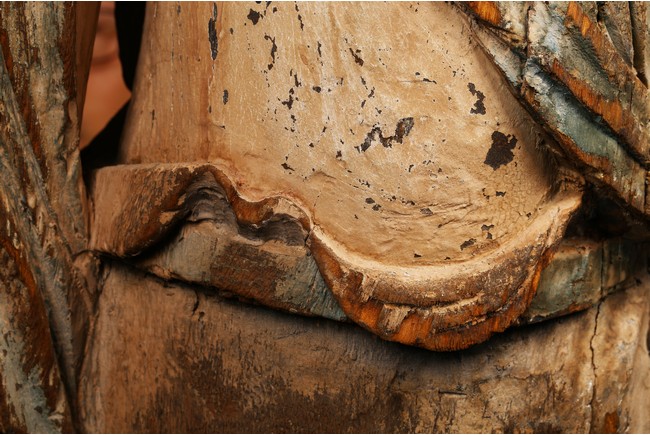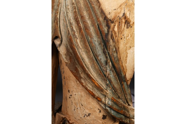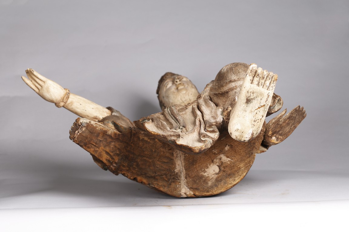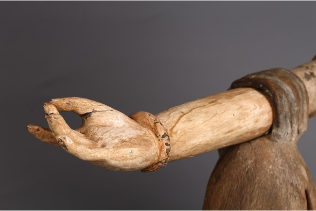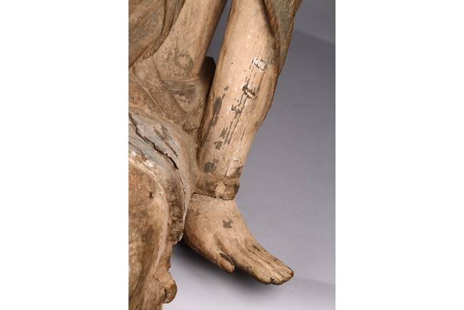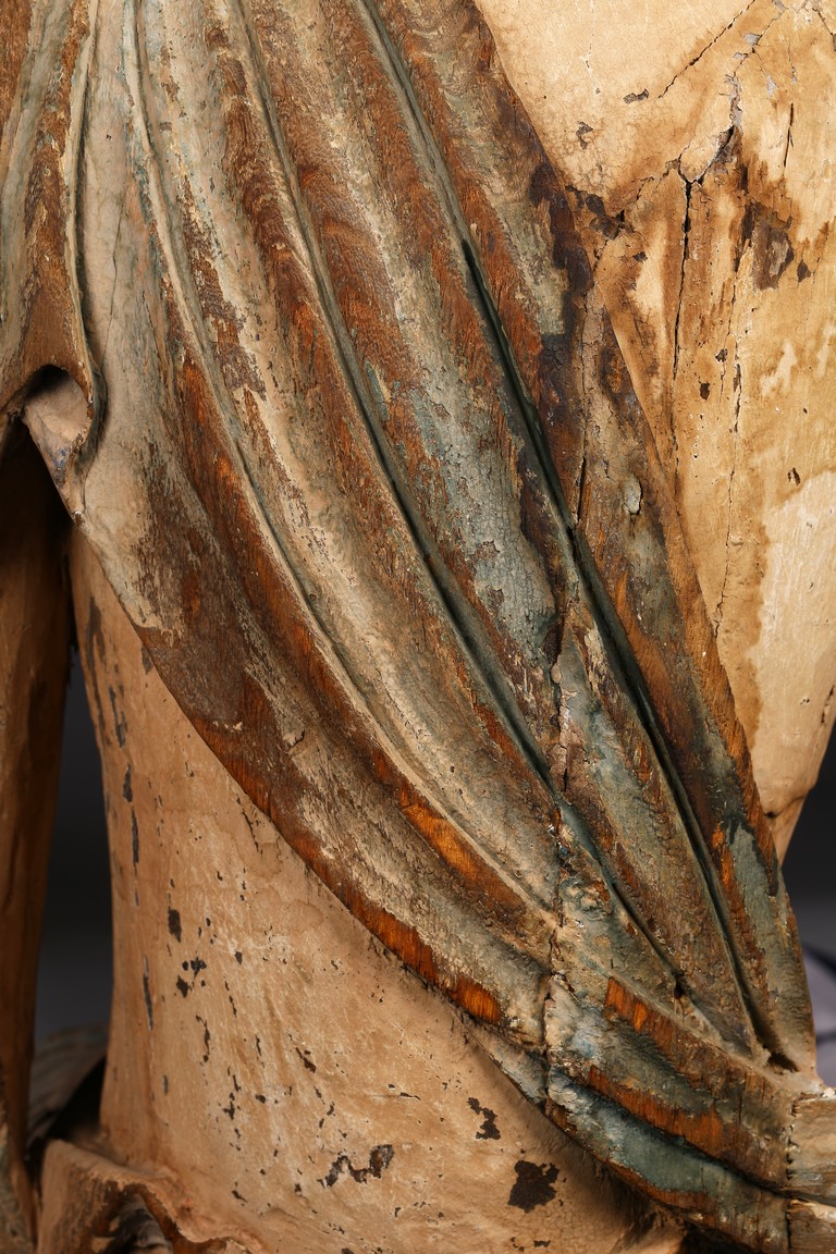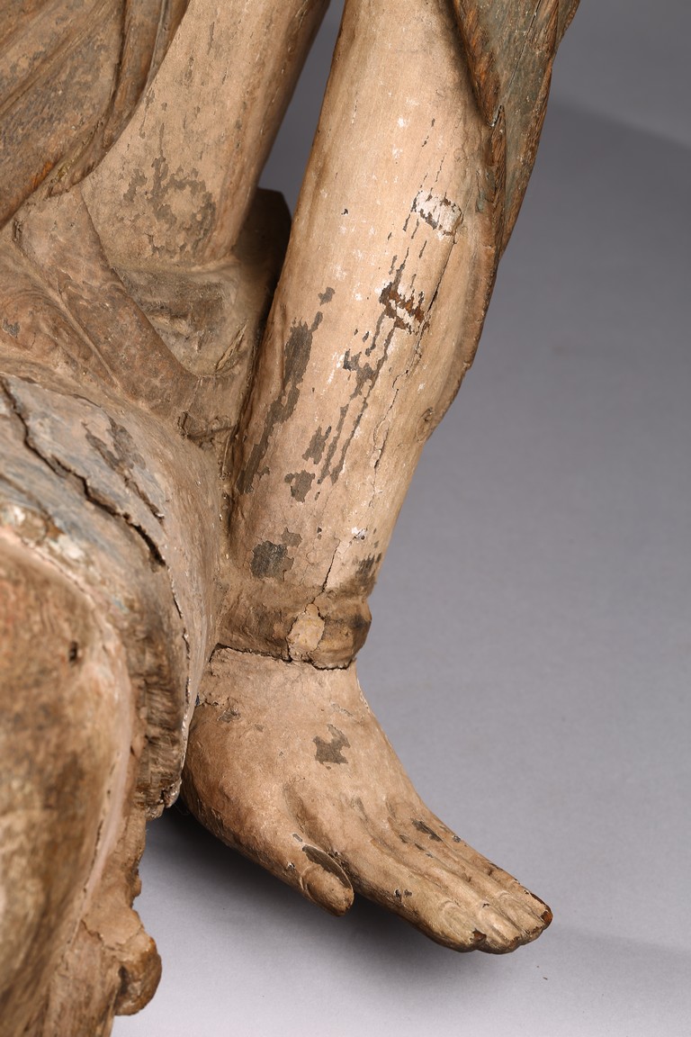 Reference: Please refer to a similar Guanyin carving, sold for 458,500 GBP, at Sotheby's London in March 2013, Lot 89. Provence: Property from an important private collection, Beverly Hills, California 自在觀音,被認為是觀世音菩薩三十三種化身之一,代表著面容俊美、姿態典雅的觀音形象。在諸多大乘經典,如《楞嚴經》、《法華經》、《華嚴經》中,都有關於其的記述、可見信仰之廣泛。宋代的藝術、美學、科技、人文等,均為前所未有的歷史高峰。宋代開始,全國各地寺院木構造像興起,取代此前隋唐的主流石窟,木雕於新興雕像領域之中獨領風騷,綻放異彩。本件宋代木雕觀音呈自在式坐姿,肌體語言強烈,手腳張力,由靜生動。梳高髮髻,柳眉鳳目,櫻唇瑤鼻,含笑睇視,容貌姣好。其左腿盤曲、右膝弓立;左手撐地、右臂置於左膝之上;目視遠方,姿態自在而超逸,軀體充滿了動人的柔和感與生命活力,既表現了觀音菩薩內在的宗教氣質,又體現了宋人特有的思想信仰和審美情趣,保存至今,十分難得。 參考: 倫敦蘇富比 2013年5月 拍品號89 成交價458,500 GBP 來源:洛杉磯比佛利山莊重要私人收藏