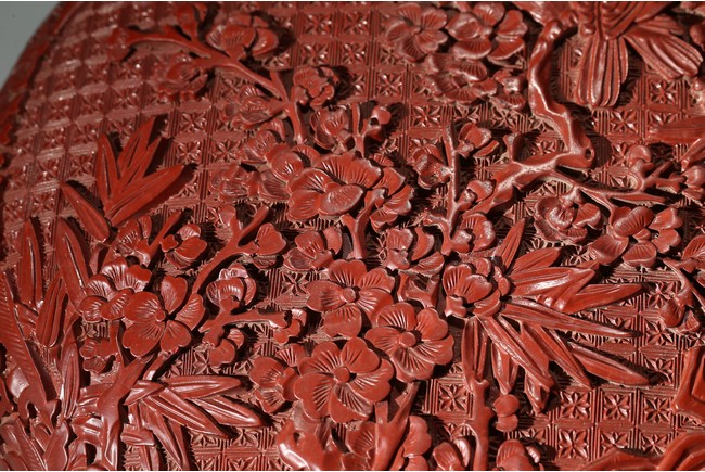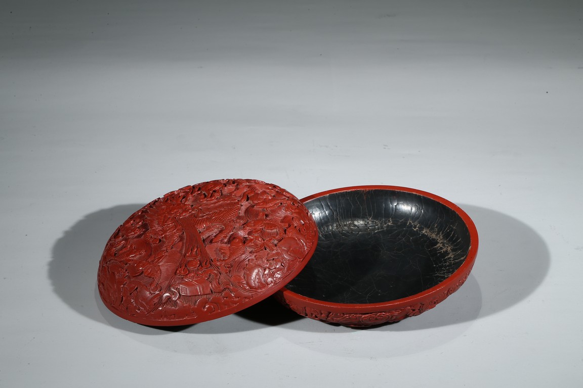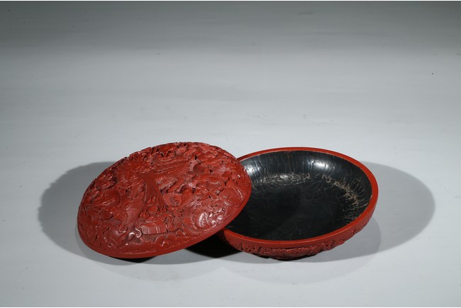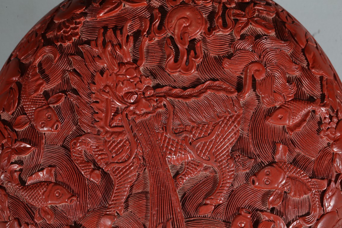 蓋盒為圓形,子母口,器底下凹成圈足,造型周正,樣式美觀。通體髹朱漆,漆色紅潤,蓋面雕有雙獅戲繡球、鯉魚飛躍紋樣。雙獅毛髮隨風飄逸,威風凜凜,自由嬉戲;鯉魚張嘴飛躍於海水之上。整幅畫面呈現祥瑞之情。