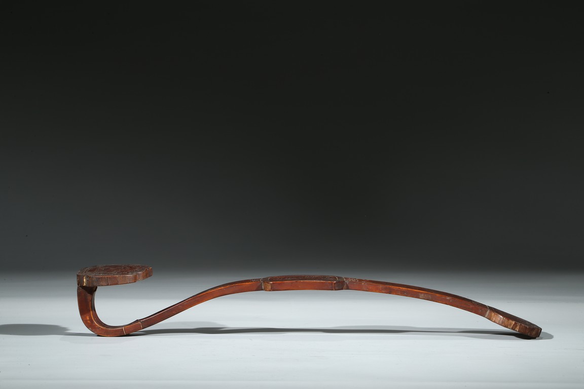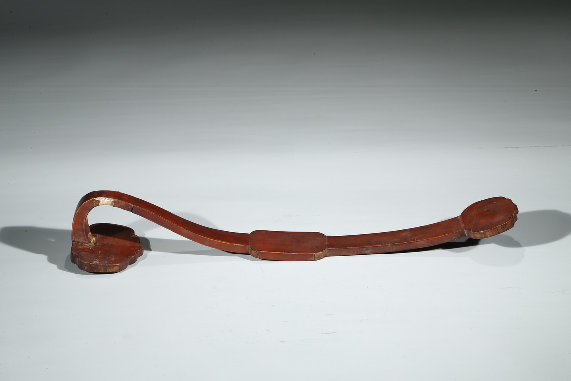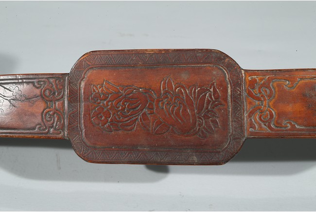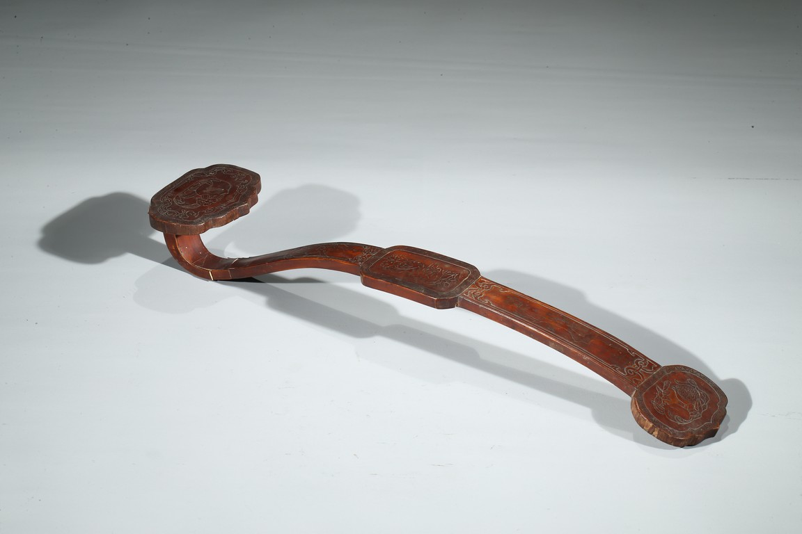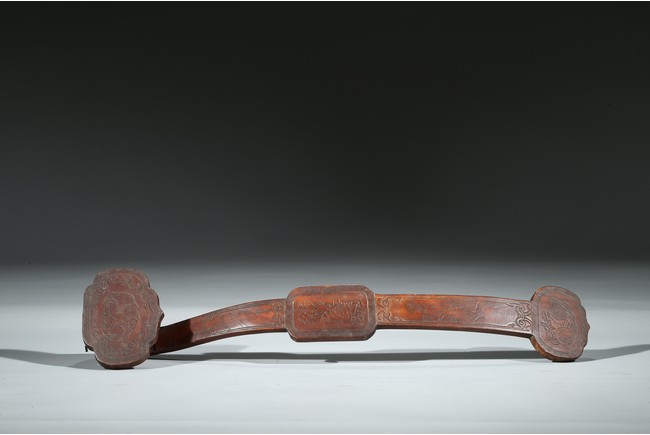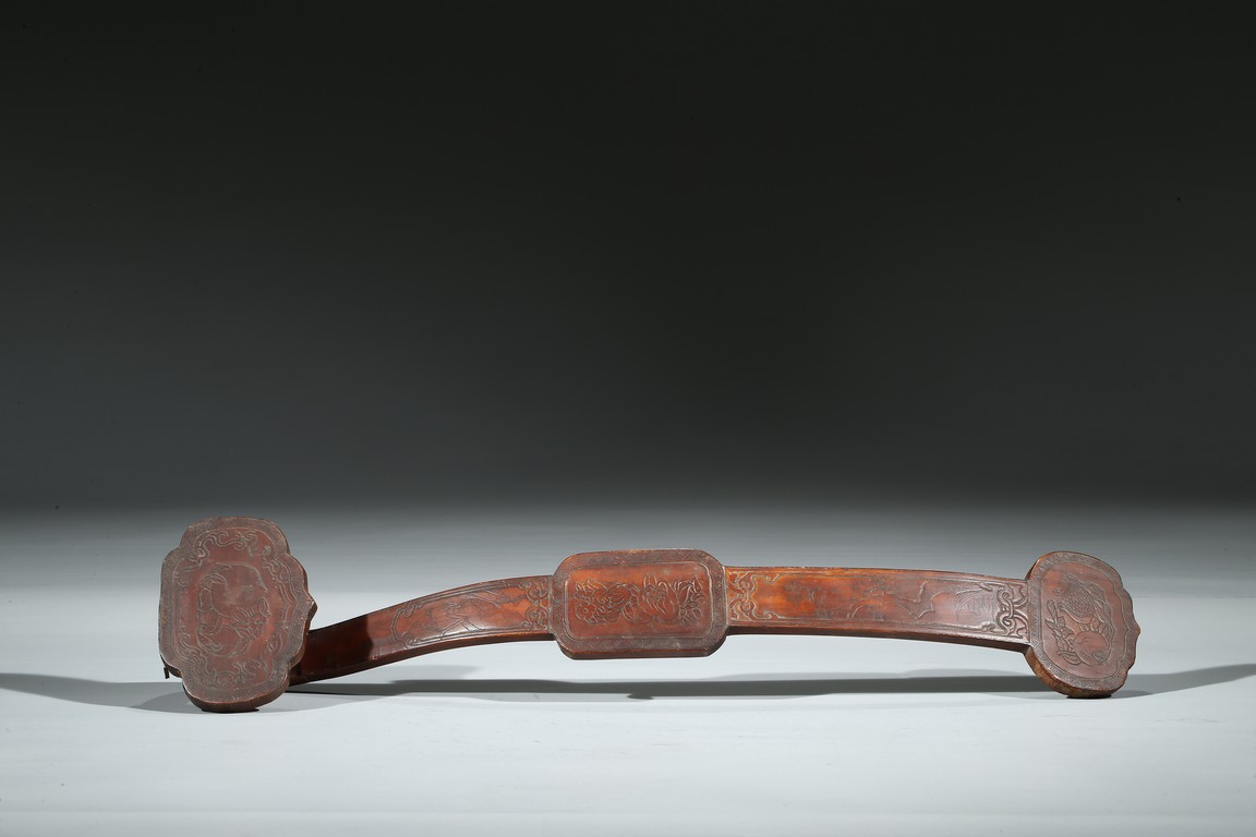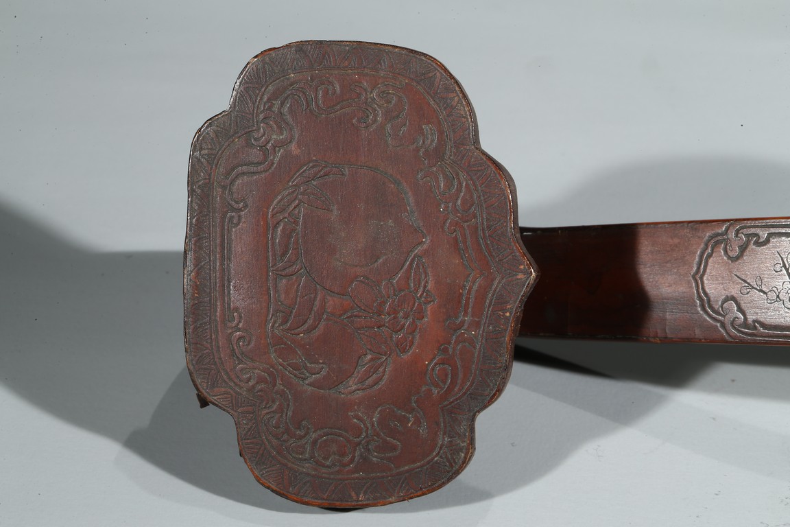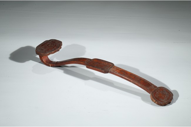 取竹為材,選材講究,長柄如意,靈芝雲形,色紅褐,包漿醇厚,採用貼簧工藝,選材講究,彎曲流暢,線條優美。陰刻壽桃、梅花、佛手、松樹、石榴,雕琢精細,生動優美。