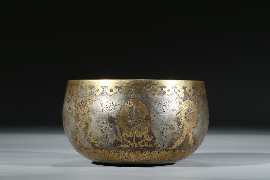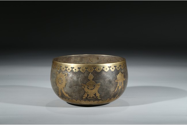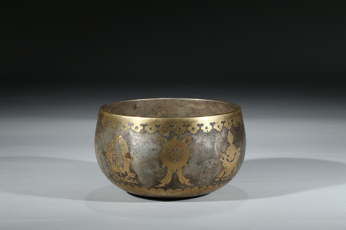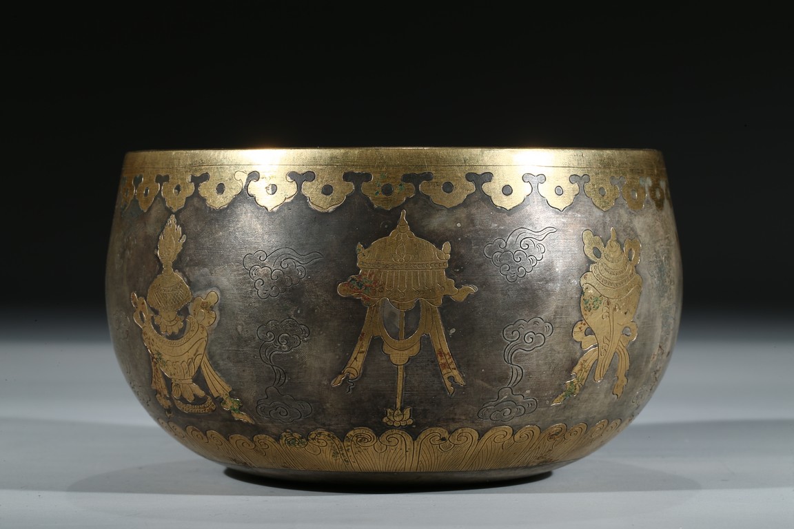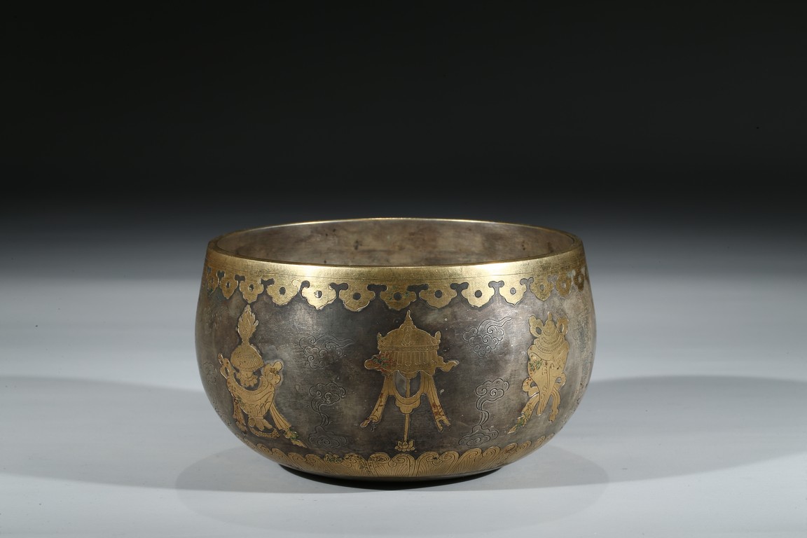 The exterior finely inlaid in gold to depict the eight buddhist motif, set between ruyi heads around the mouth and upright leaves around the base. Qing Dynasty period.