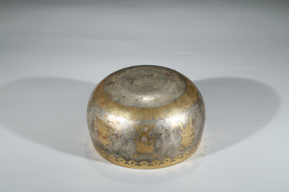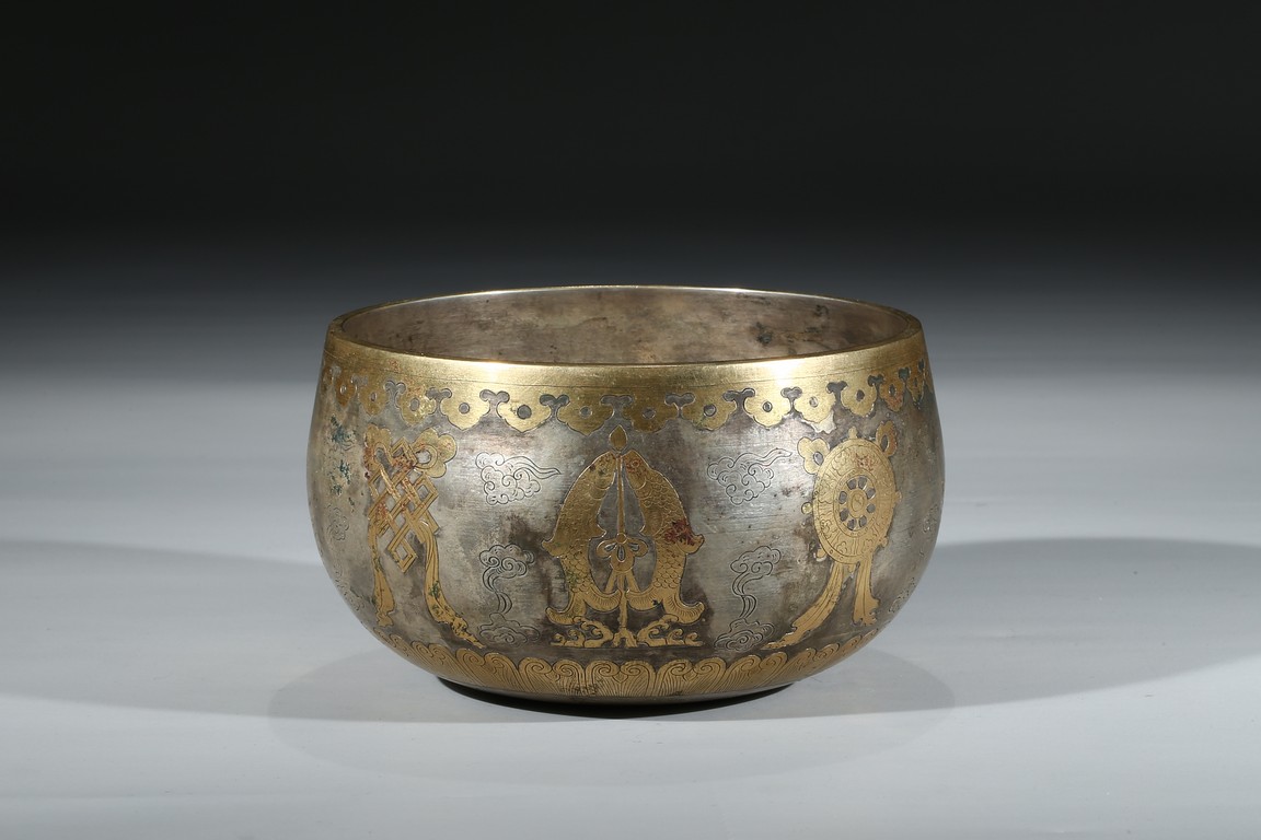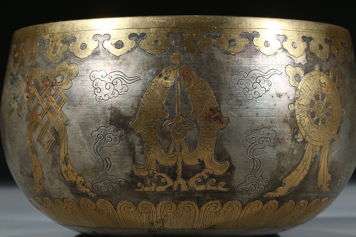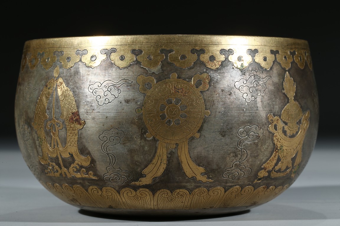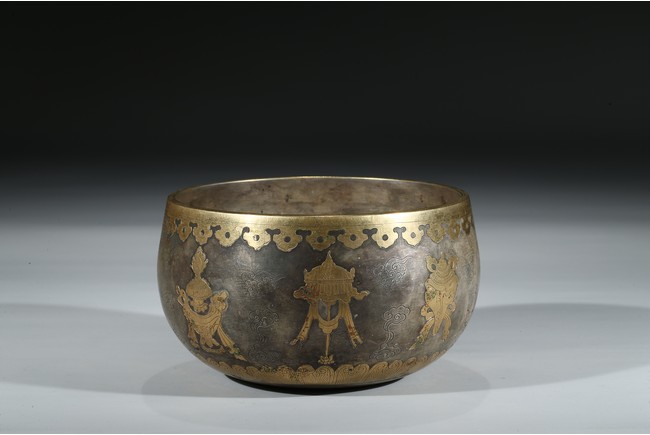 The exterior finely inlaid in gold to depict the eight buddhist motif, set between ruyi heads around the mouth and upright leaves around the base. Qing Dynasty period.