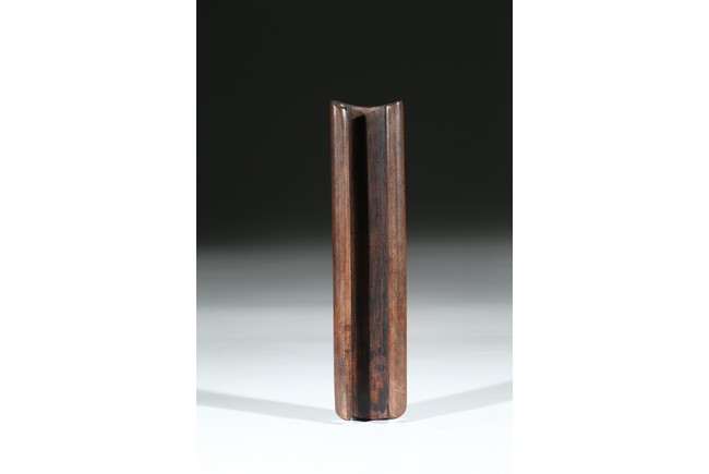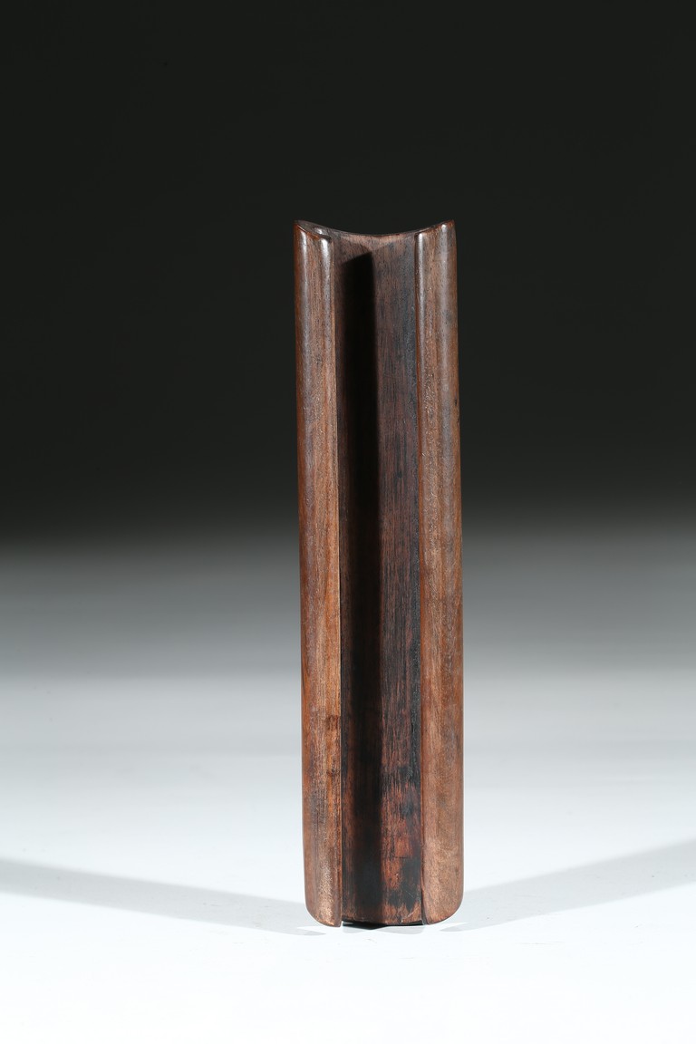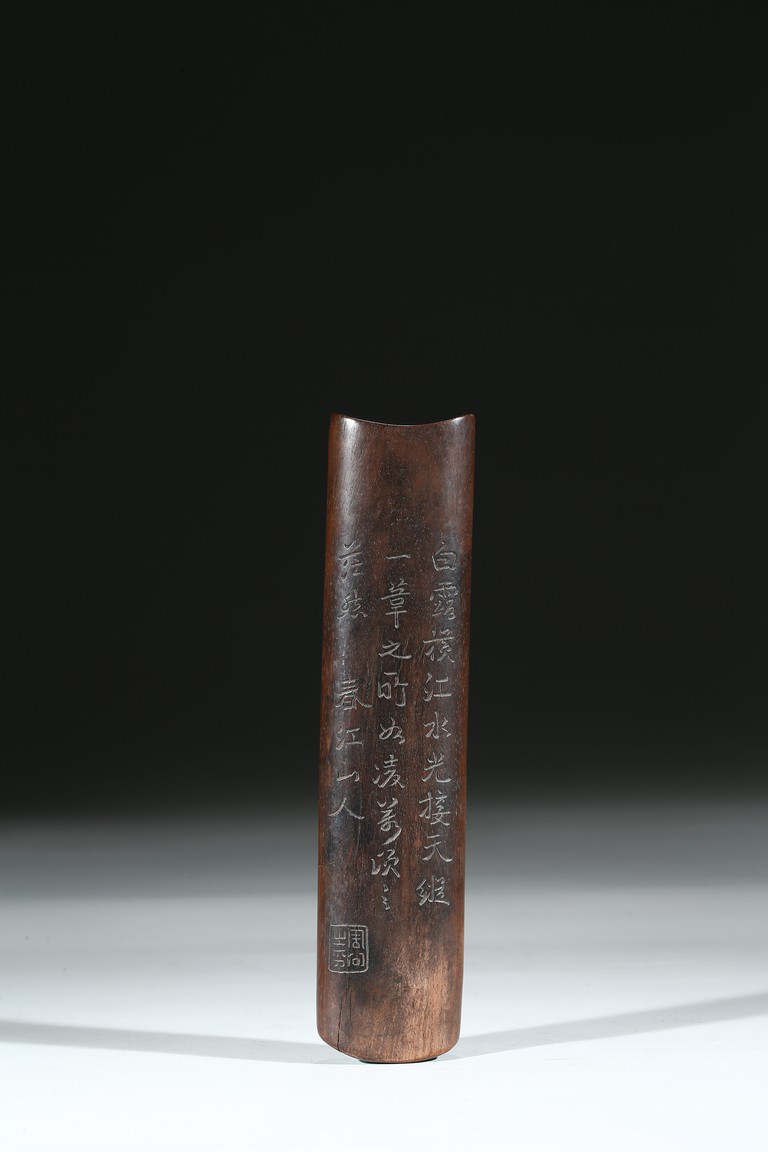 此臂擱硬木製成,表麵包漿渾厚自然,色呈紅褐,濃郁潤澤,紋理清晰,古樸美觀。陰刻詩文,“春江山人”王玘,字席珍,號春江,嘉定人,善篆刻。筆鋒犀利,刀工深厚。臂擱選料考究,清新雅緻,契合於“文質彬彬”的文人情懷,為文房雅玩之佳器。