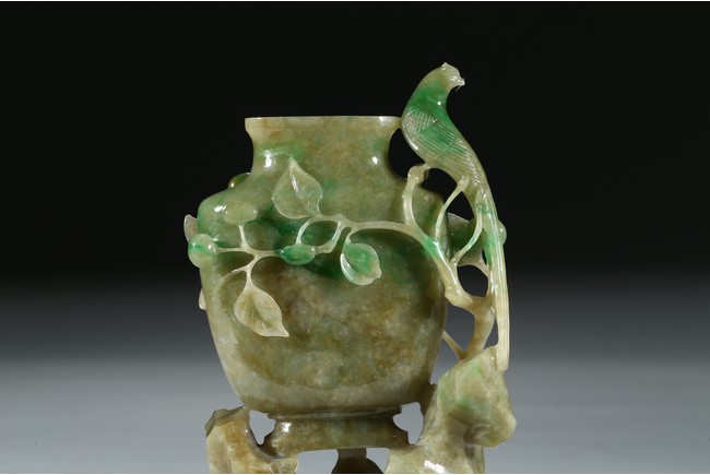 整器以翡翠為材,用料質佳,翠色青綠,瑩潔溫潤。採用立體圓雕、透雕手法,雕制鳳鳥、扁瓶、山石。鳳鳥姿態生動,造型於華麗之中現莊重之感。飛立於枝頭之上,枝葉繁複茂密。整件作品構思極為精巧,渾然一體,造型優美華麗。帶硬木底座。