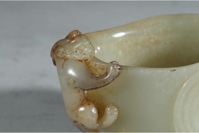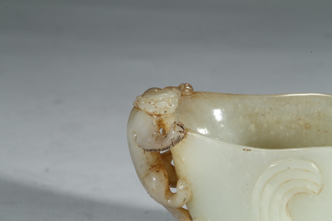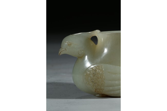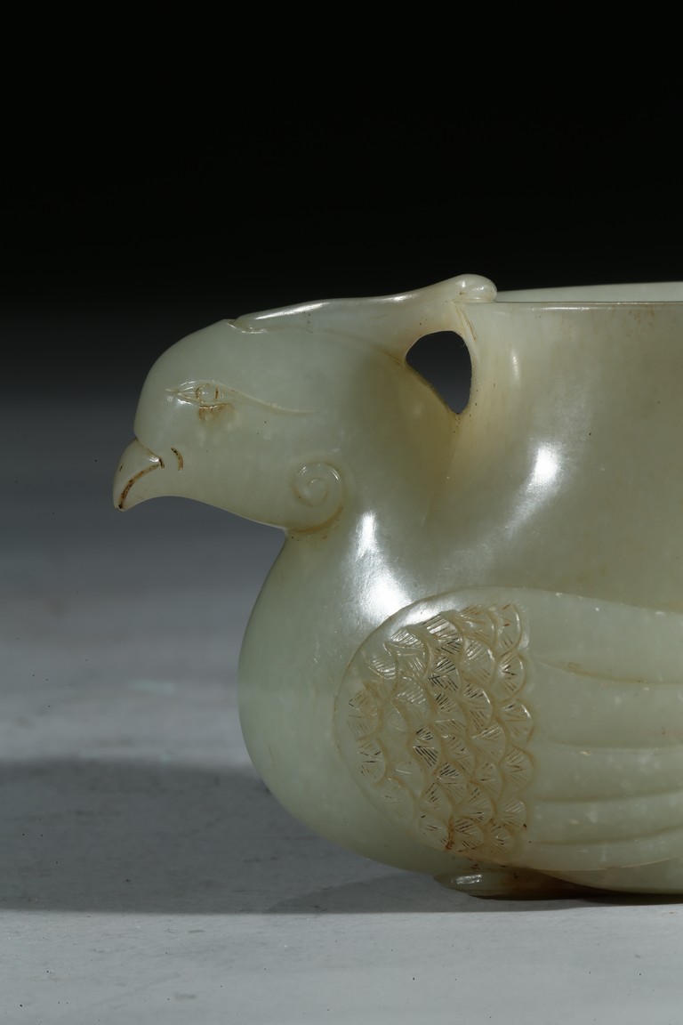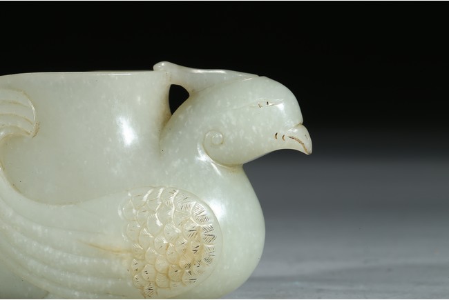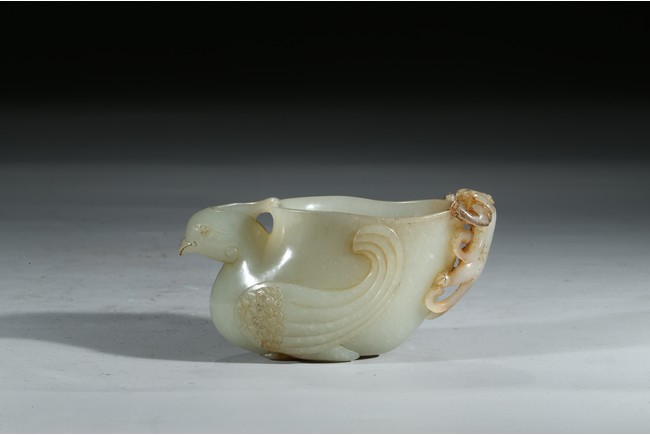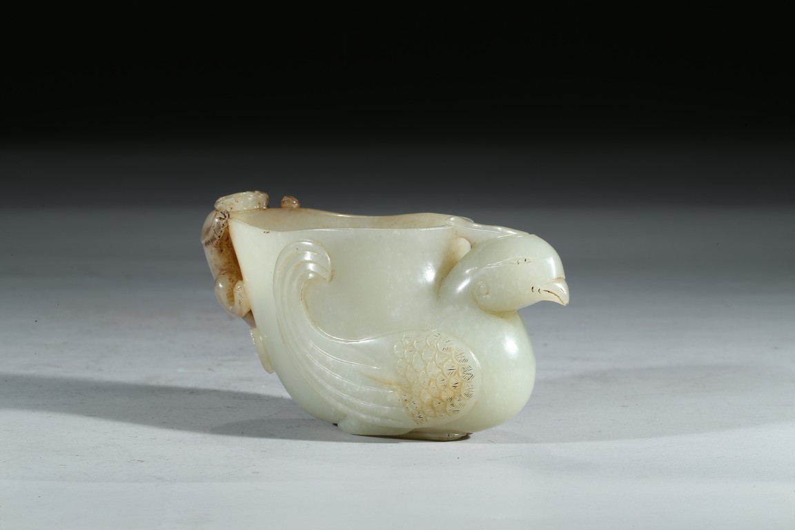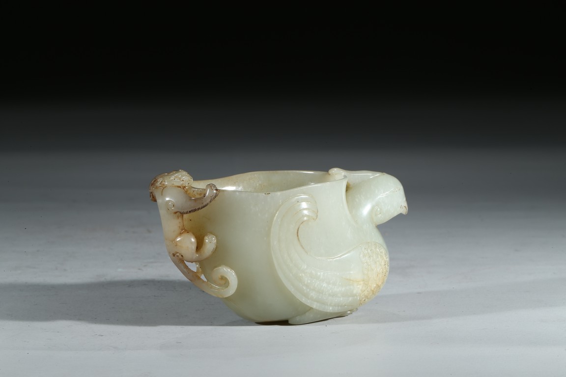 The cup modelled in the form of a seated phoenix supporting a large vase with a sinuous chilong clambering on the other side. Mid-Qing Dynasty period.