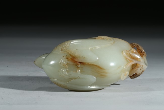 天雞系傳說中的神鳥,率天下之雞報曉。此器天雞昂首挺立,雙翅貼體,背馱圓口瓶,意欲凌霄直上,瓶與雞身巧妙融為一體,造型簡練。有一螭龍攀附其上,三角形臉,腰身細長,肩部拱起,健壯有力,極具動感。整器雕工精細,活靈活現。