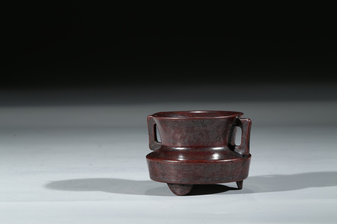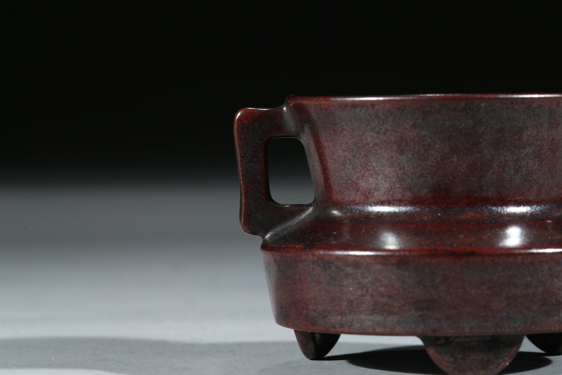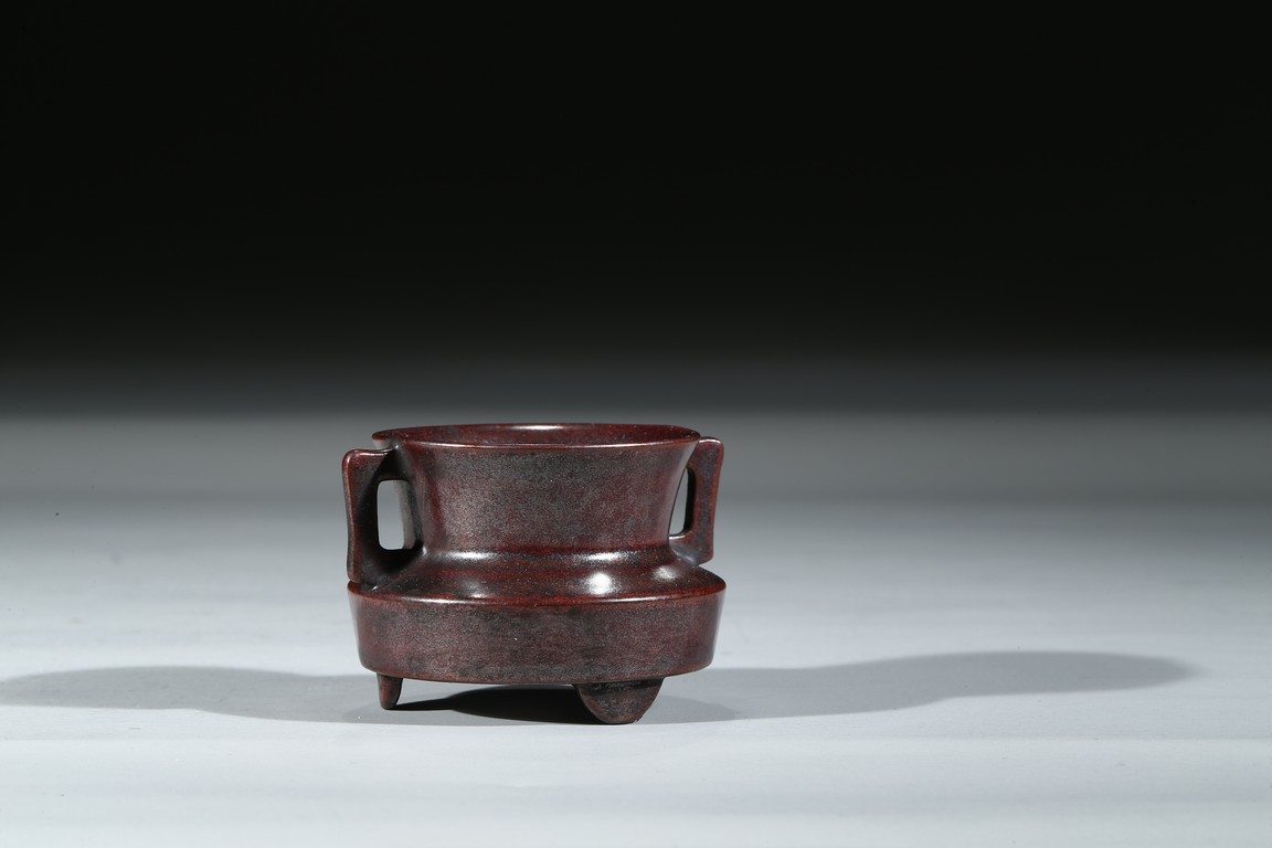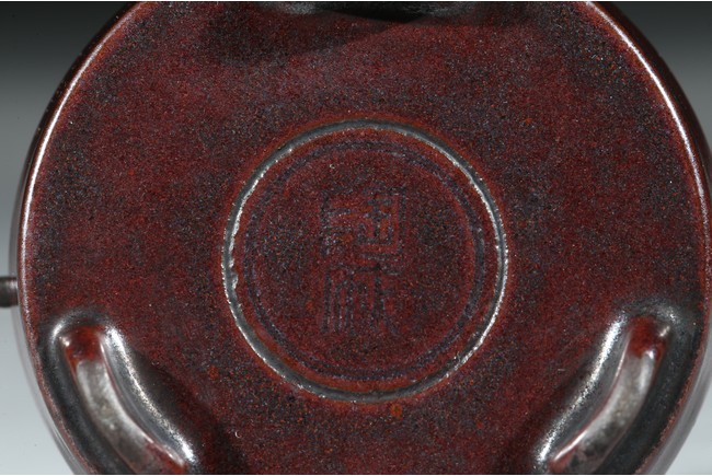 Rising from three short feet, body with two handles, overall suffused with reddish purple glaze, base with two character mark.