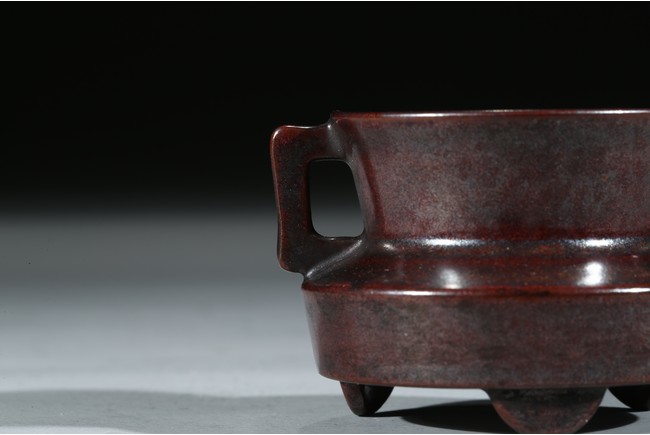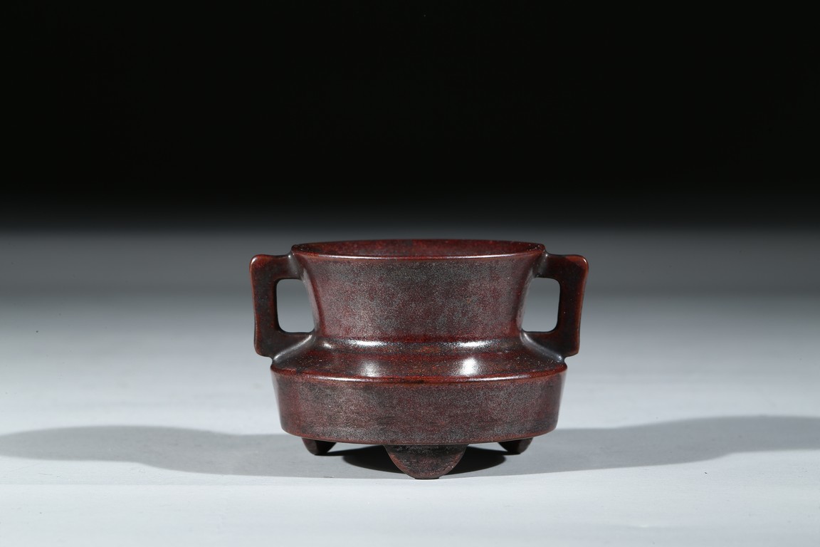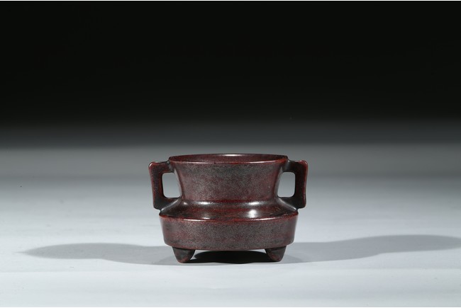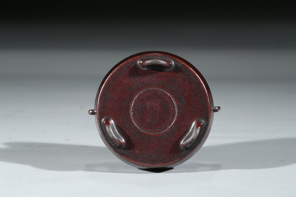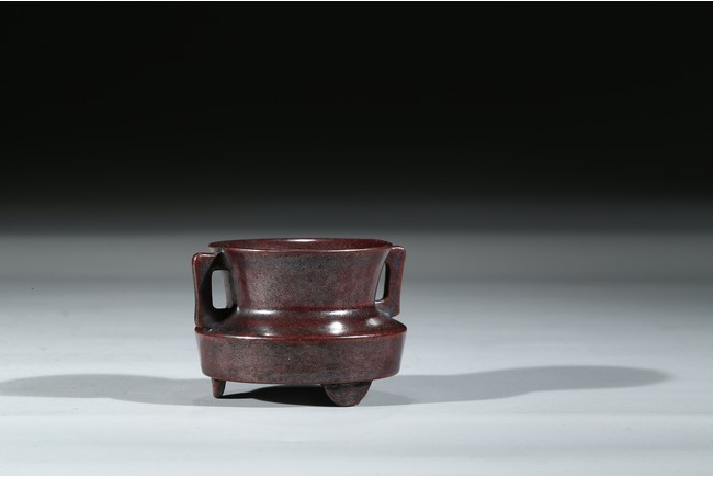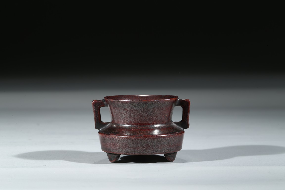 Rising from three short feet, body with two handles, overall suffused with reddish purple glaze, base with two character mark.