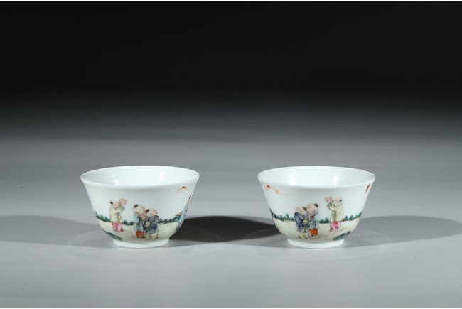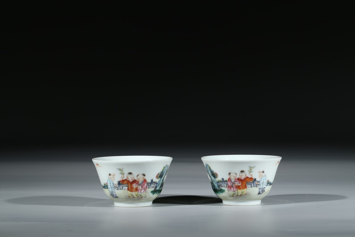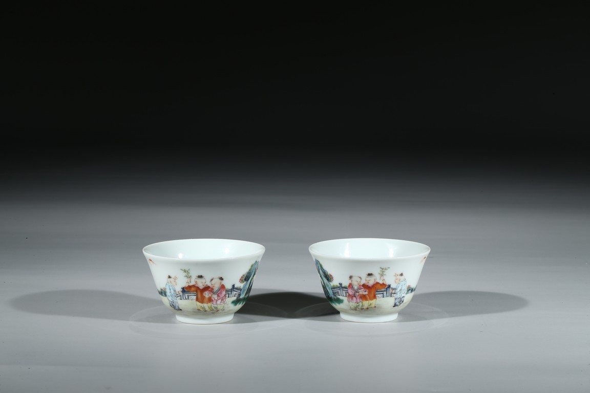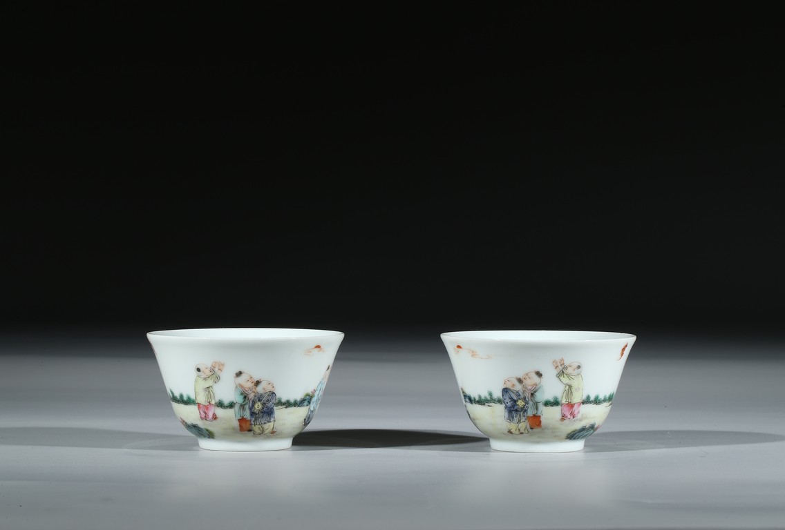 Each of 'U'-shape with everted rim, finely enamelled around the exterior with boys dressed in loose outfits holding peach and watching the clouds in a backyard setting, the base inscribed with six character 'Qianlong' mark. Qing Dynasty period.