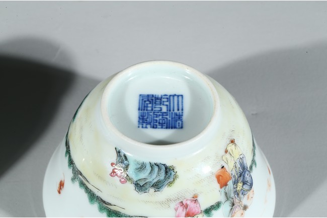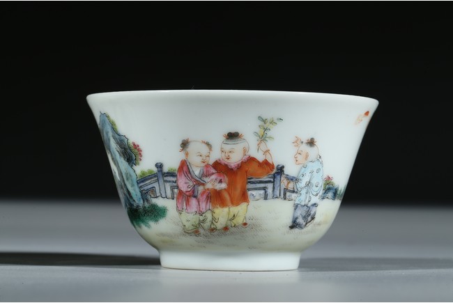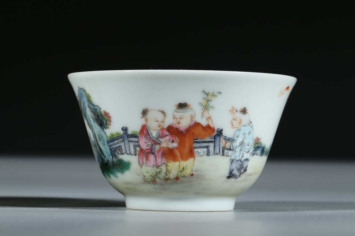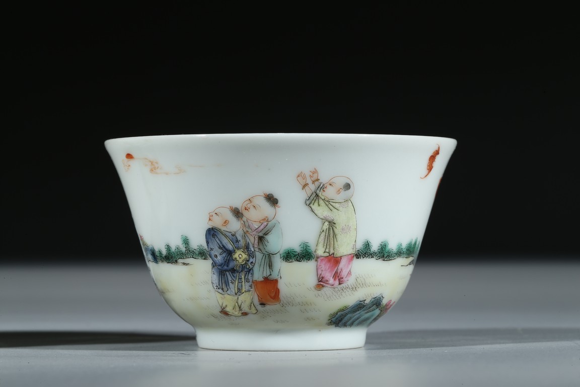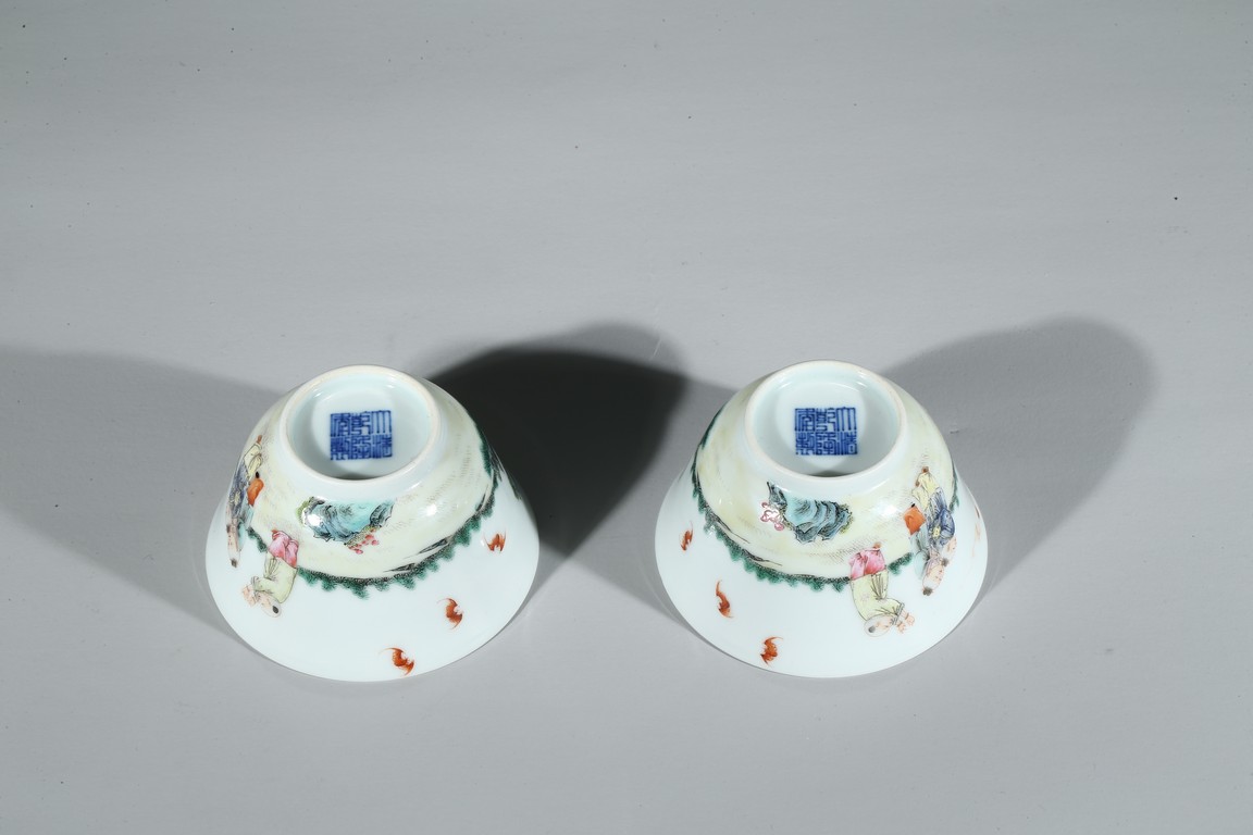 Each of 'U'-shape with everted rim, finely enamelled around the exterior with boys dressed in loose outfits holding peach and watching the clouds in a backyard setting, the base inscribed with six character 'Qianlong' mark. Qing Dynasty period.