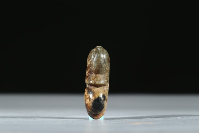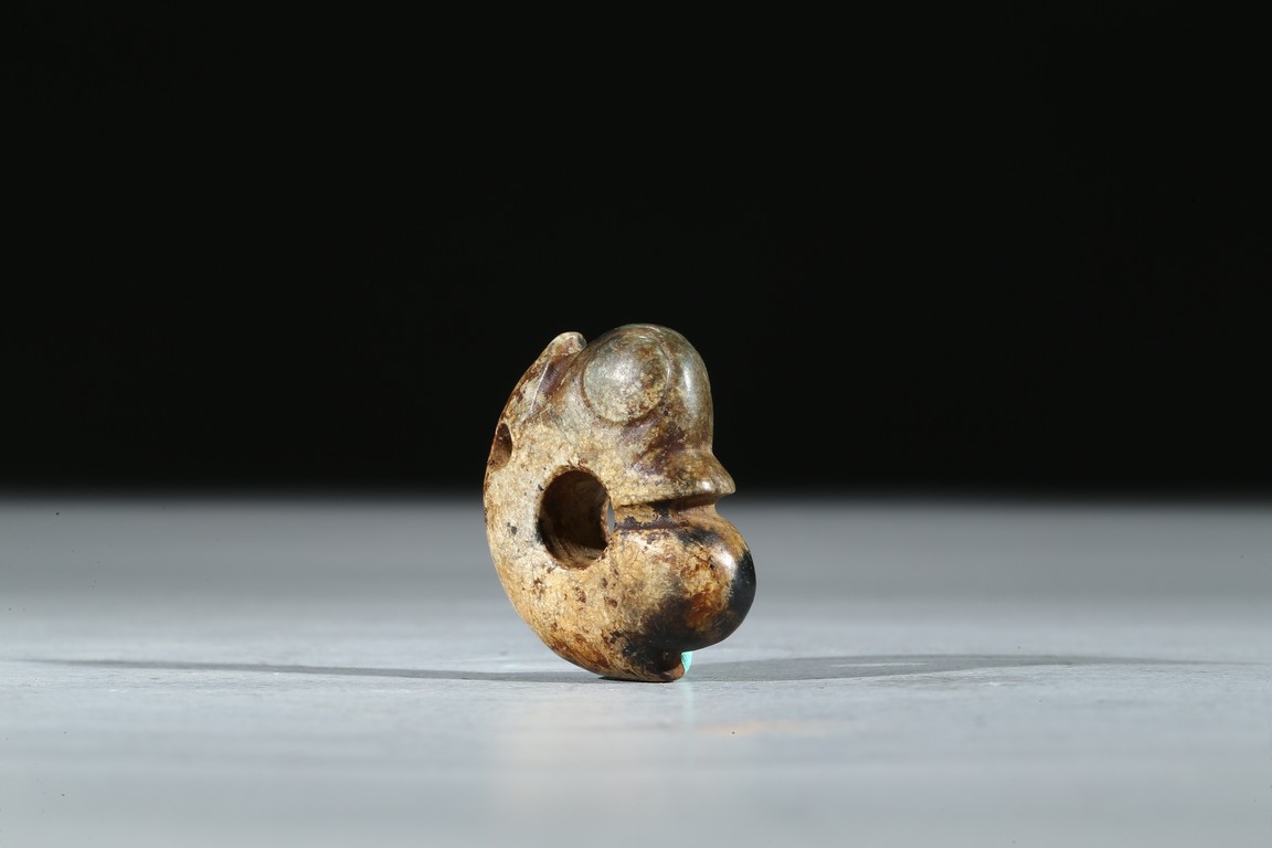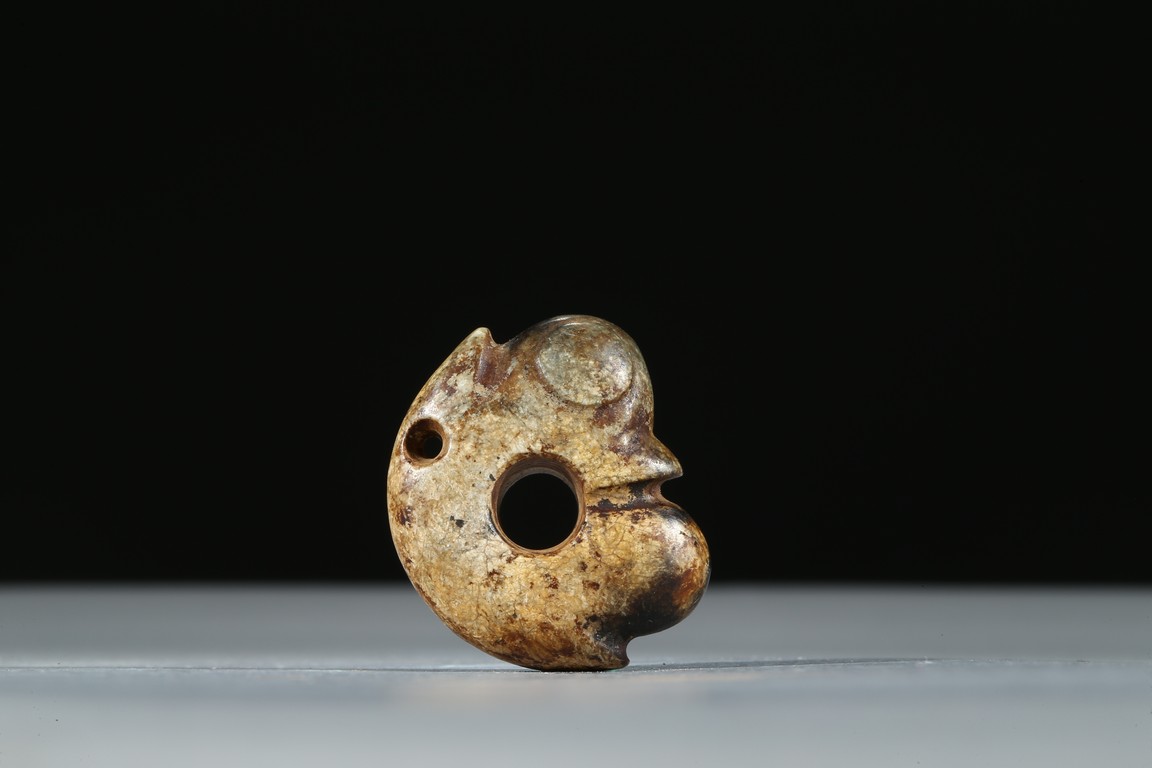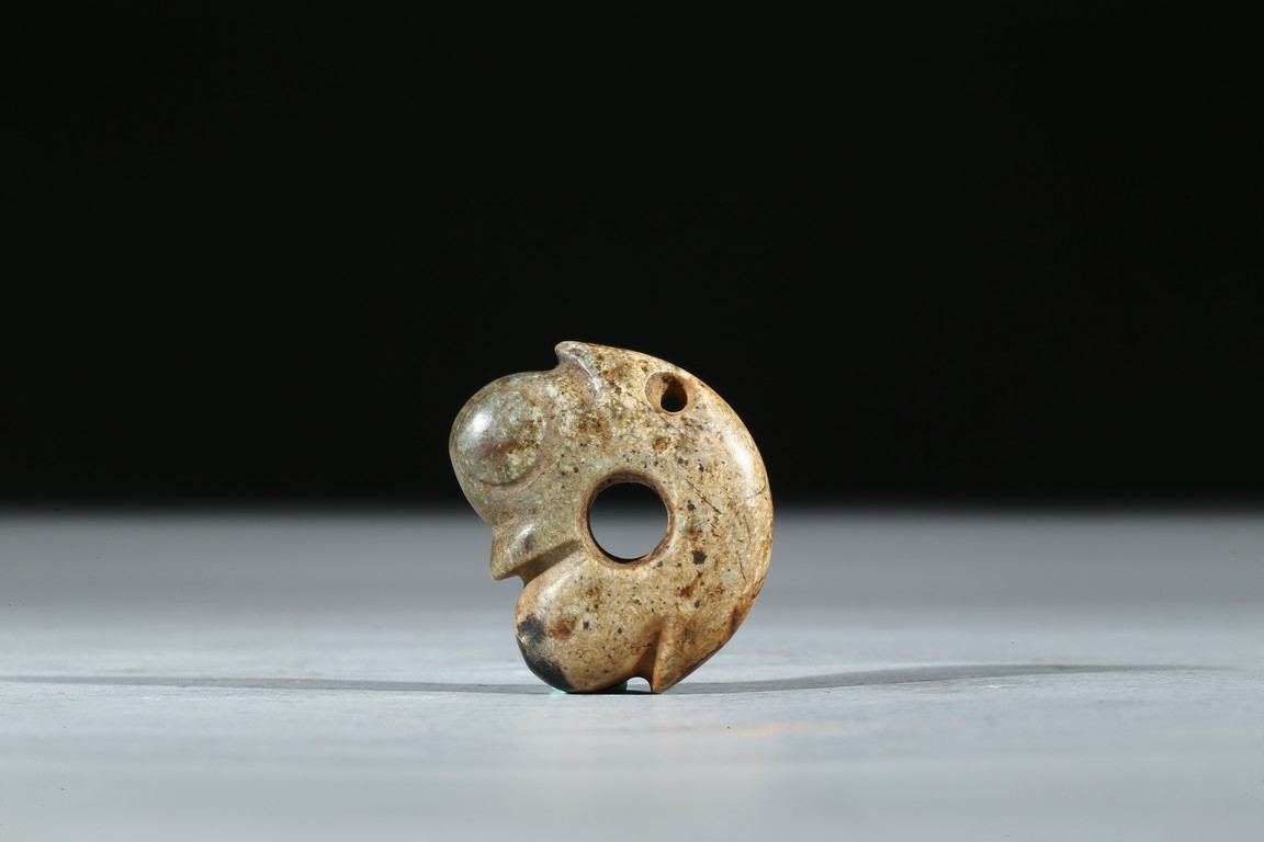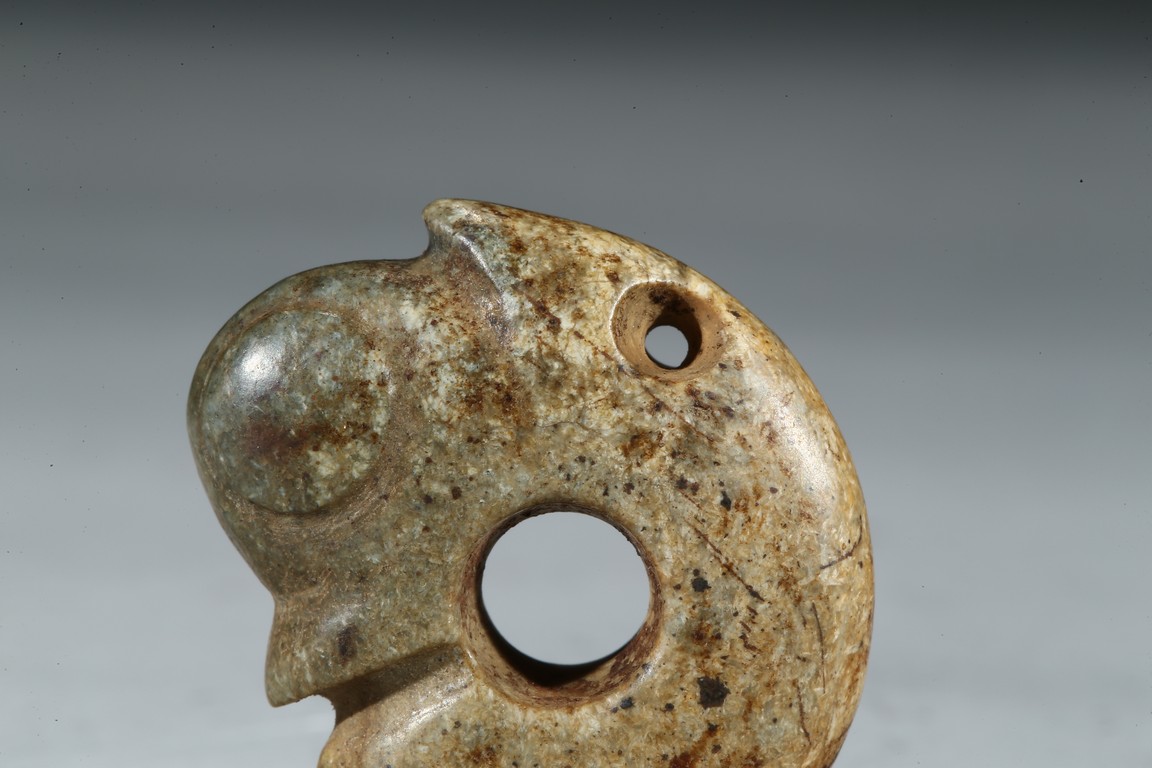 The coiled mythical beast is modelled with 'pig' head and 'dragon' body, pierced with two circular apertures. Possibly Hong Shan culture and neolithic period.