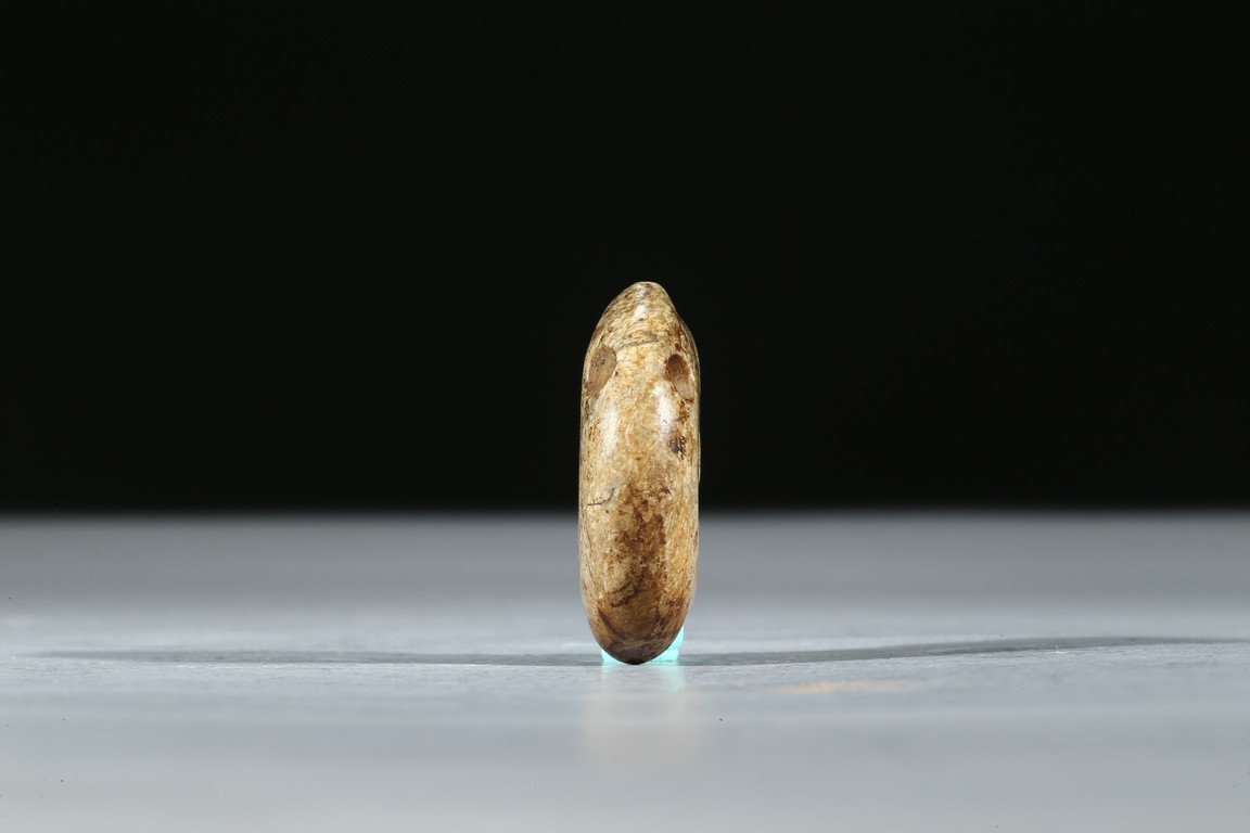 Provenance: Property from a private collection, San Francisco 豬龍肥首大耳,身體首尾相連,成團狀捲曲,背部對鑽圓孔,面部以陰刻線表現眼圈,嘴部前伸上噘,整器似豬的胚胎尾銜接如環形的玉豬龍。其較多地保留了豬的形象,可能是“豬乃龍象”這一古諺的最早源頭。整體捲曲呈“C”形,剛勁有力,顯現騰雲駕霧的動感。玉豬龍形象是紅山文化的典型器,是用以代表神靈和先祖的圖騰物。 來源:三藩市私人藏家收藏