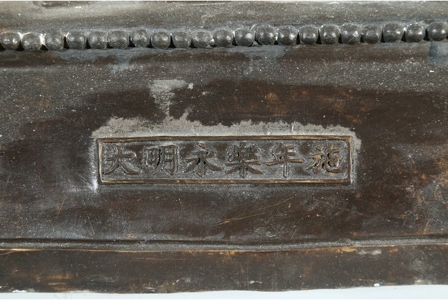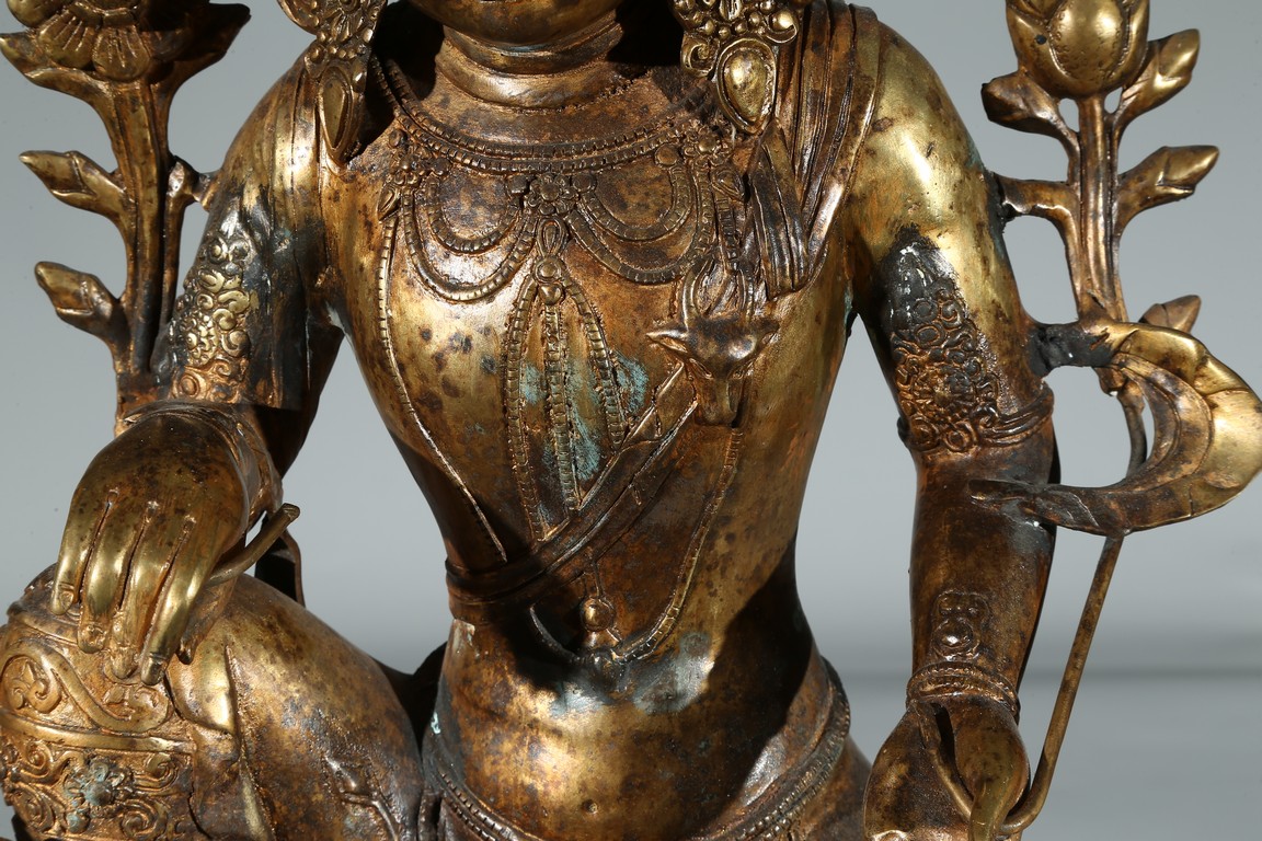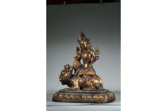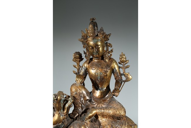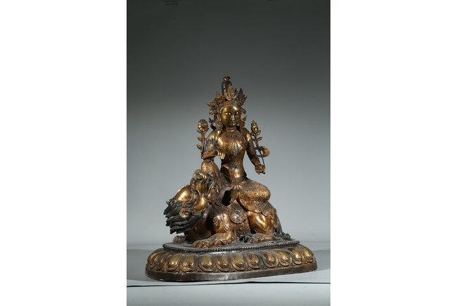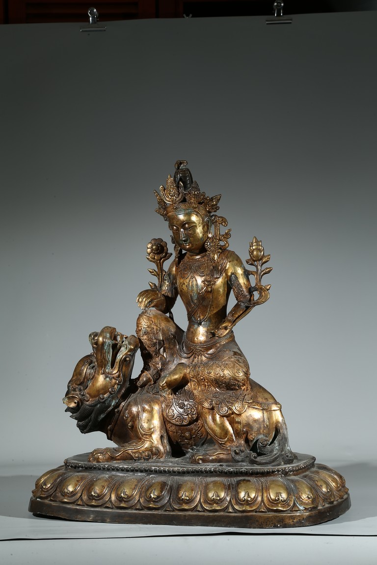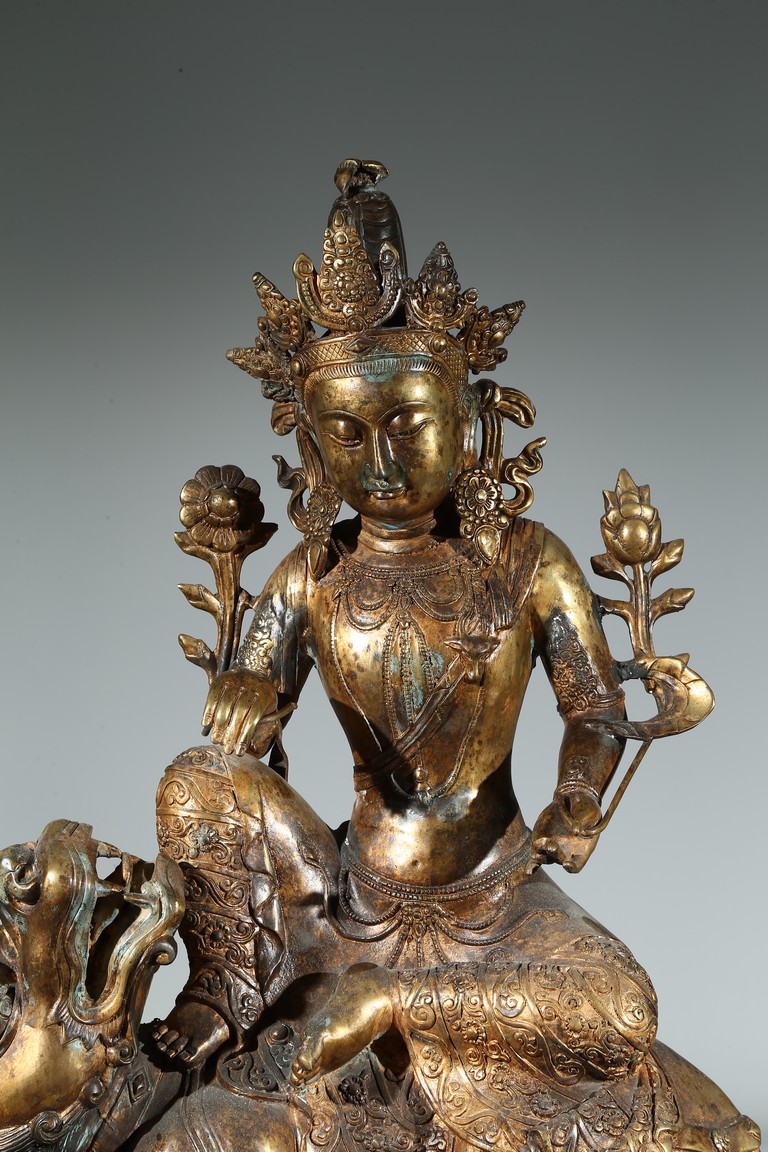 此尊頭戴花冠,髮髻高束,寶繒飄拂於耳際,尾端飾有寶珠。面龐豐腴,雙目垂俯,相容慈悲和熙。菩薩裝束,身著天衣綢裙,佩戴瓔珞釧環。兩莖蓮花順肩而上,齊肩綻放。遊戲坐姿,安住於迴首怒吼的獅背上,下承覆蓮座。獅子怒目圓睜,蓄勢待發,極具震撼力,體現了佛法至高無上的尊嚴。