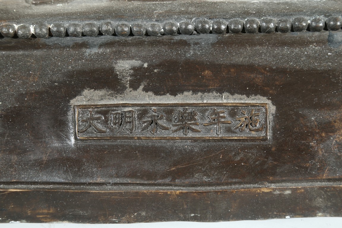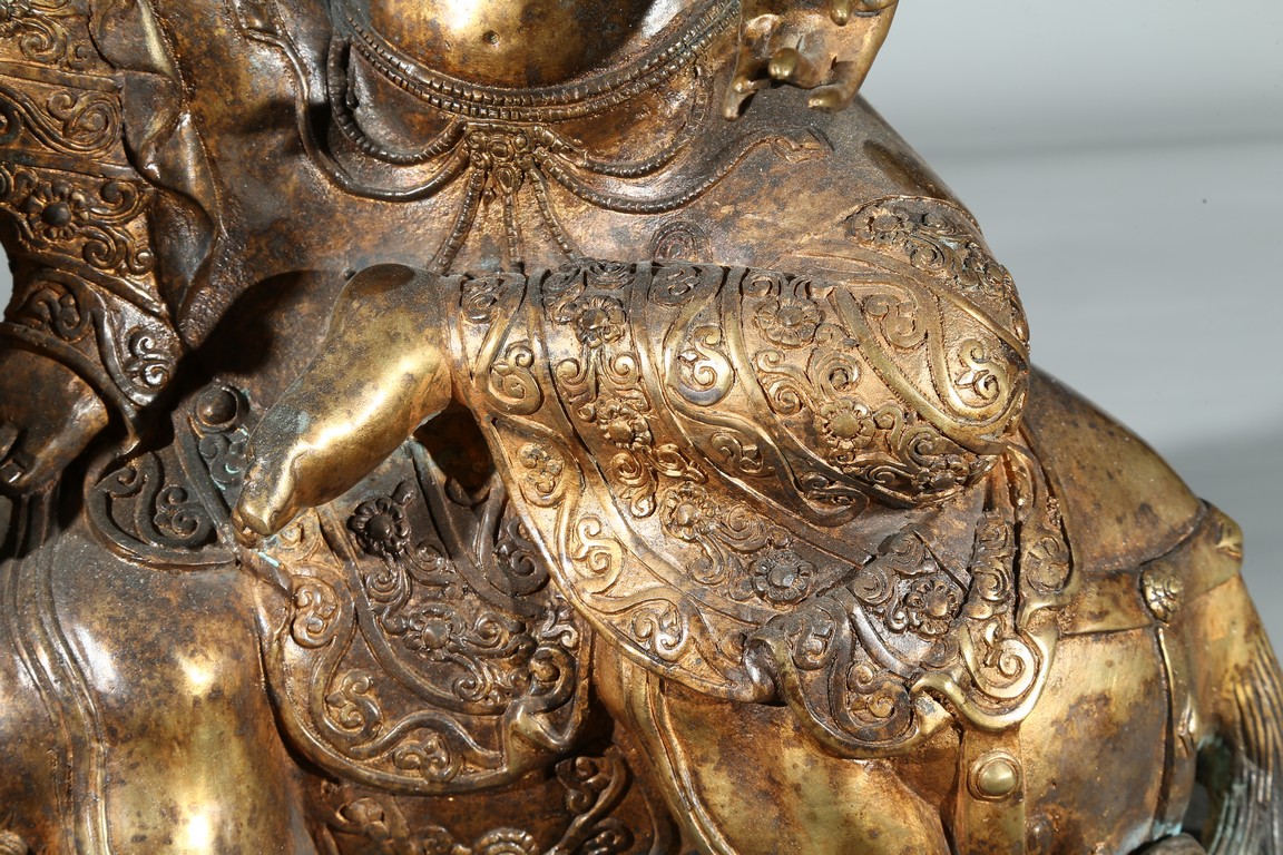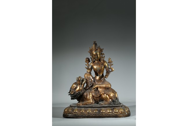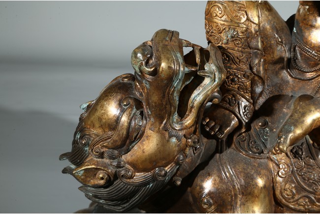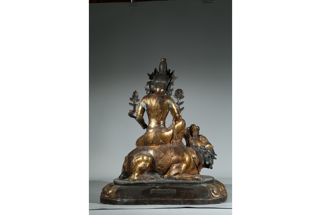 Figure is cast depicting manjushri seated on a recumbent lion with its head turned backwards. The figure is depicted elaborately jewelled and with hair fashioned in a high chignon.