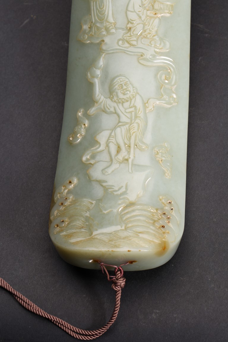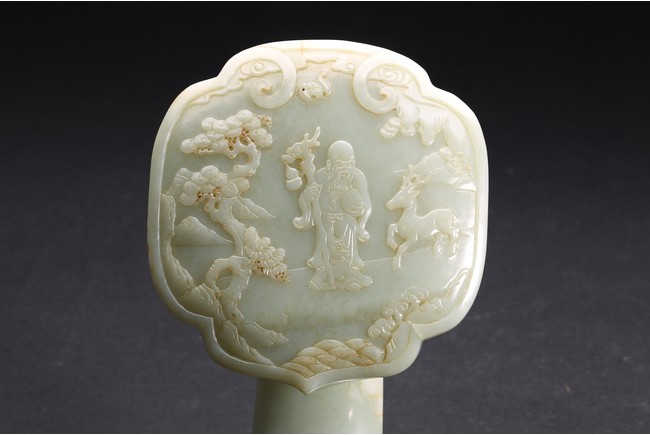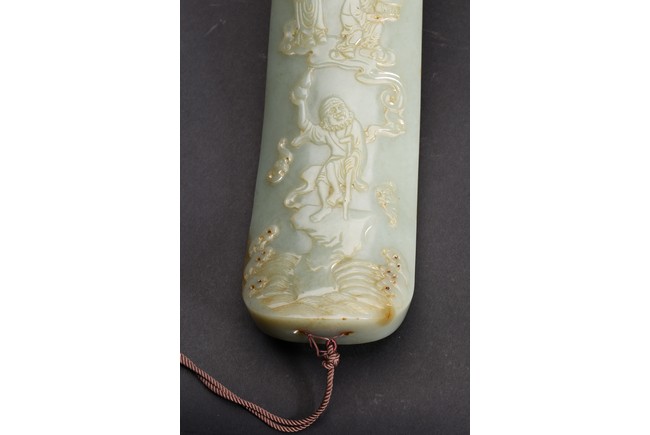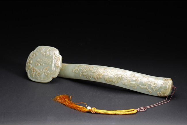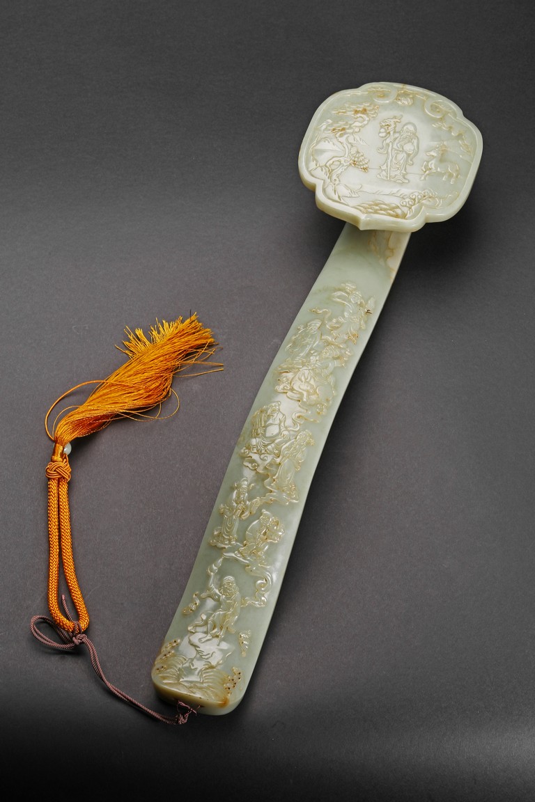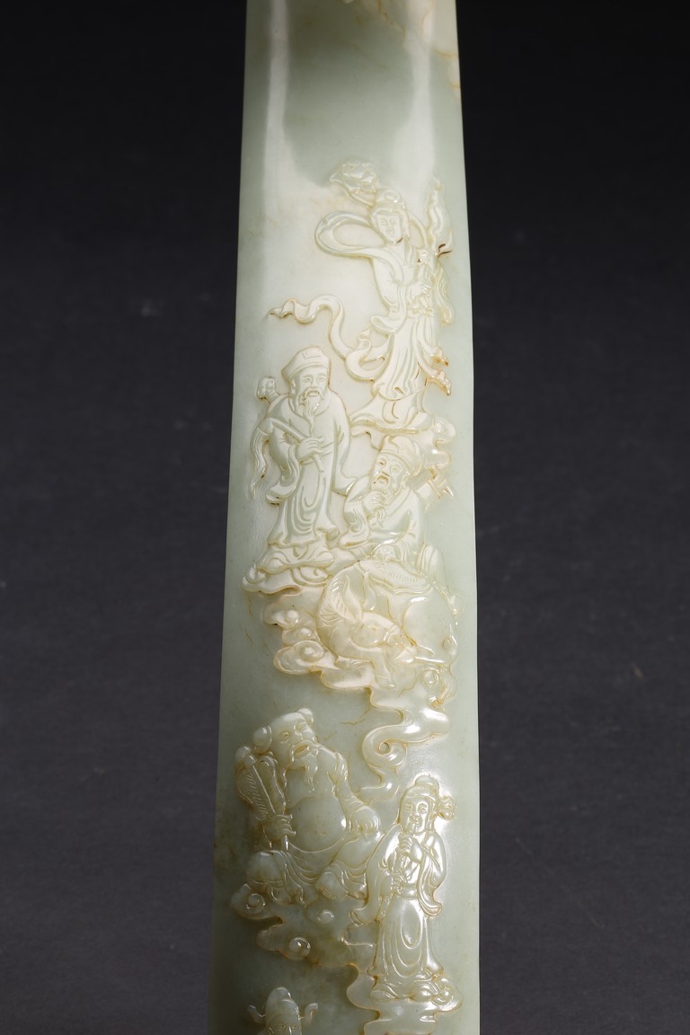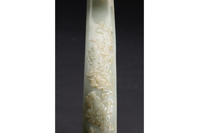 The ruyi-shaped head carved with the shoulao with deer under pine tree in a mountain setting, the shaft carved in shallow relief to depict the eight immortals standing upon auspicious clouds; the reverse inscribed in gilt with Imperial poem and with one seal mark. Qing Dynasty period.