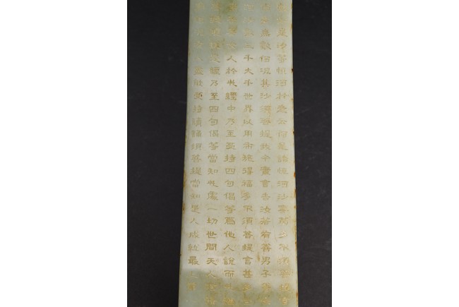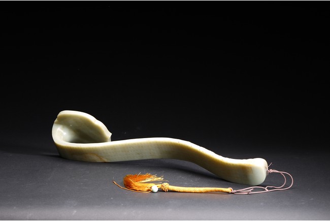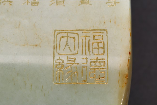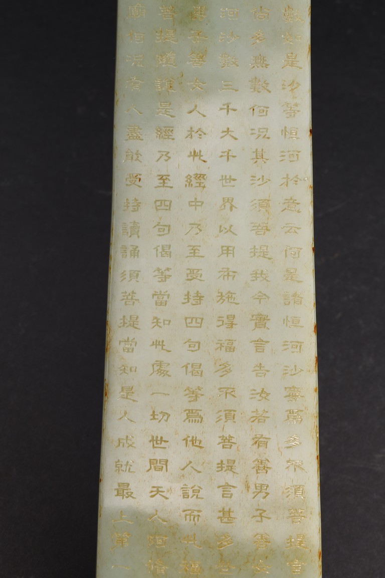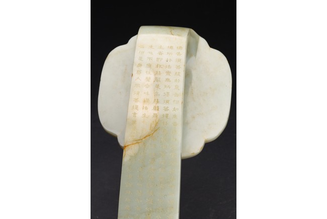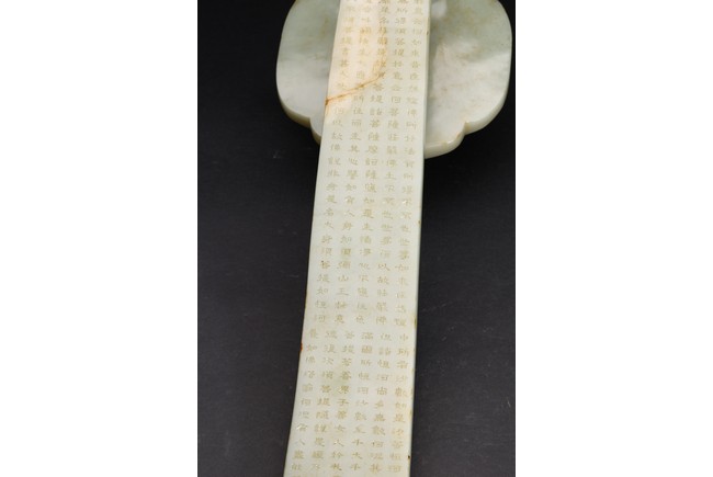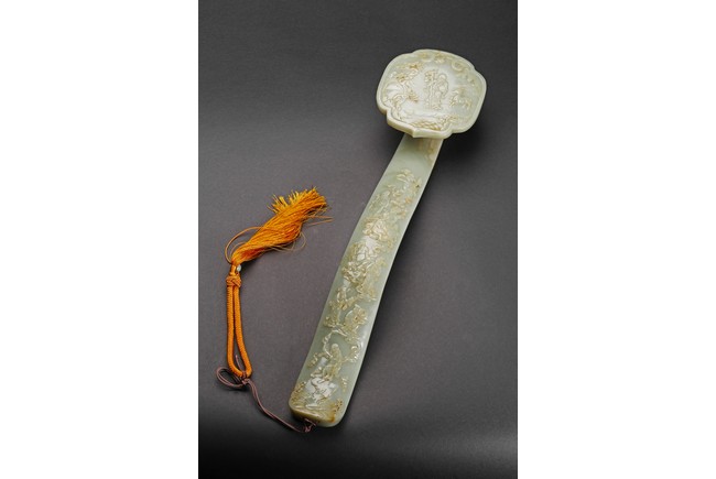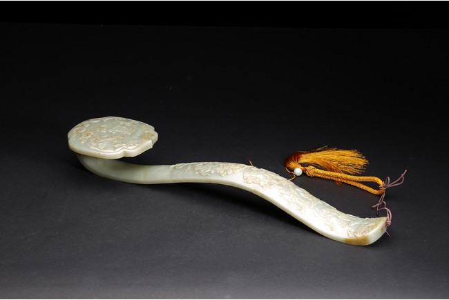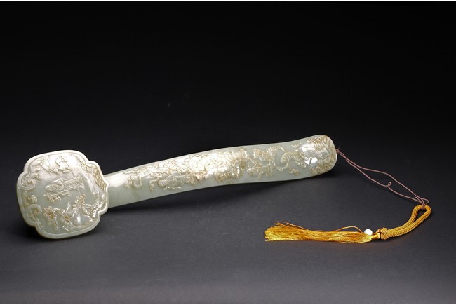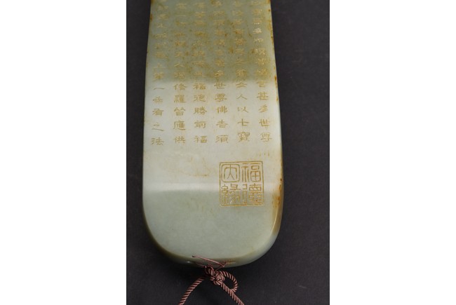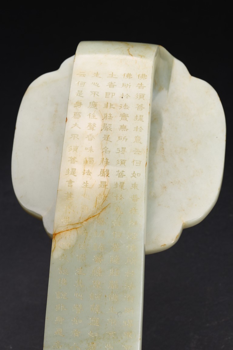The ruyi-shaped head carved with the shoulao with deer under pine tree in a mountain setting, the shaft carved in shallow relief to depict the eight immortals standing upon auspicious clouds; the reverse inscribed in gilt with Imperial poem and with one seal mark. Qing Dynasty period.