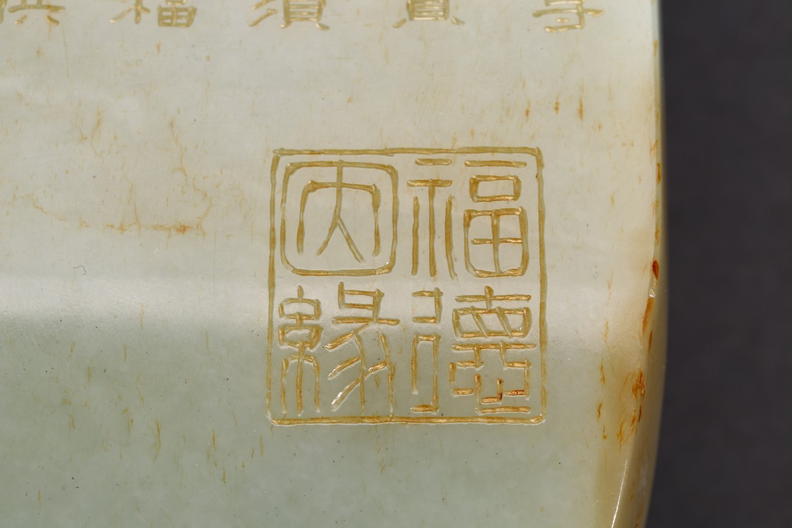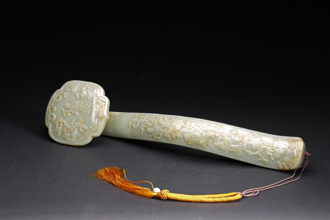 Provenance: Property from an important Southern California collection 如意大約出現於戰國之時,又稱“搔杖”。南北朝對此物的俗稱謂不同。目前所見的古代如意,多為明清所制,而以清代為最多。此拍品玉料碩大,選料講究,雕工精細,佈局精巧,所雕八仙人物栩栩如生,如意背面所刻詩文層次分明寓意深遠,包漿古潤,厚實,為典型清代官宦人家所收藏之器物。 來源: 南加州重要私人藏家提供