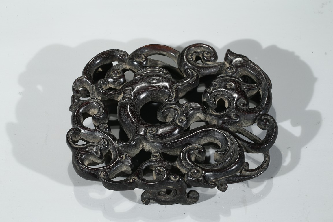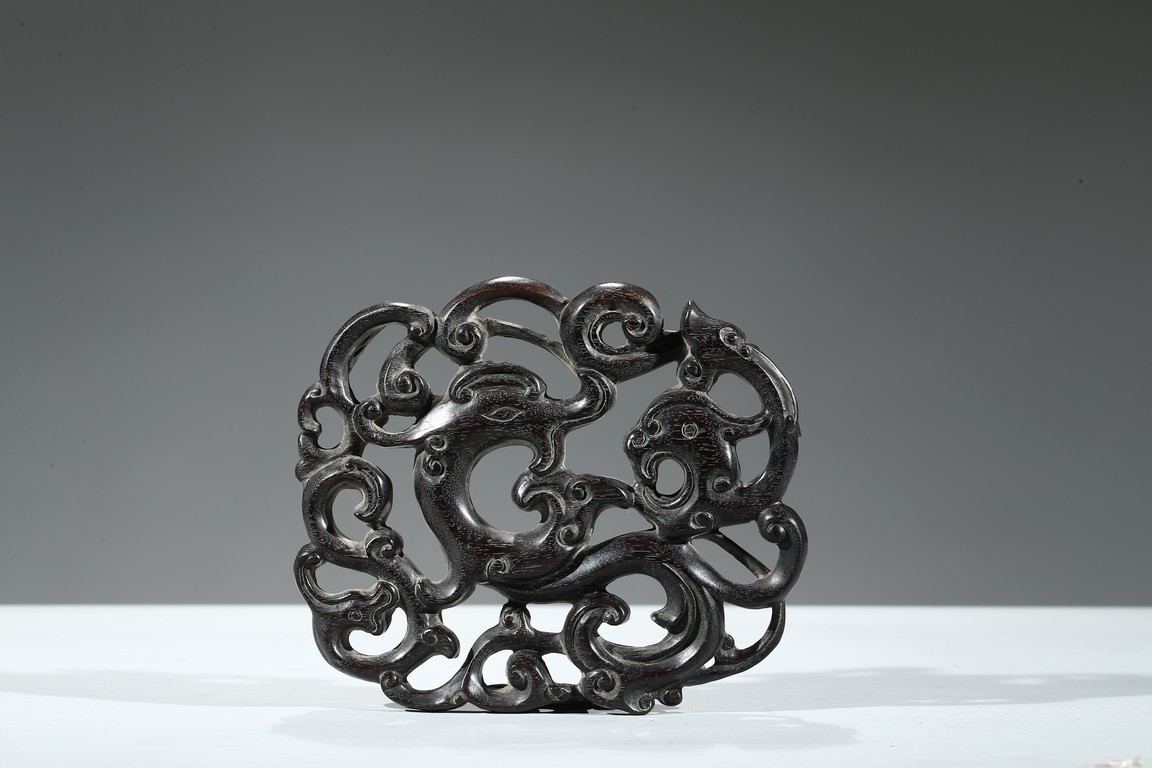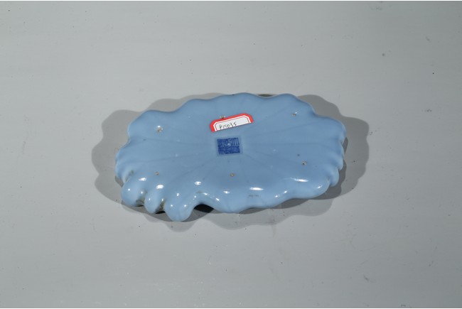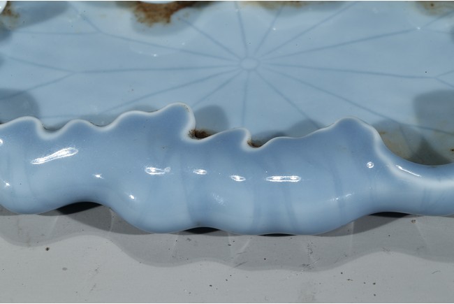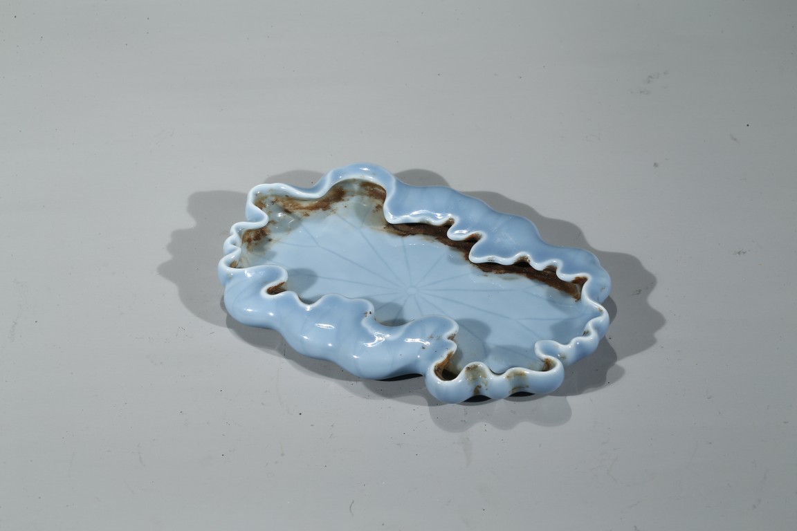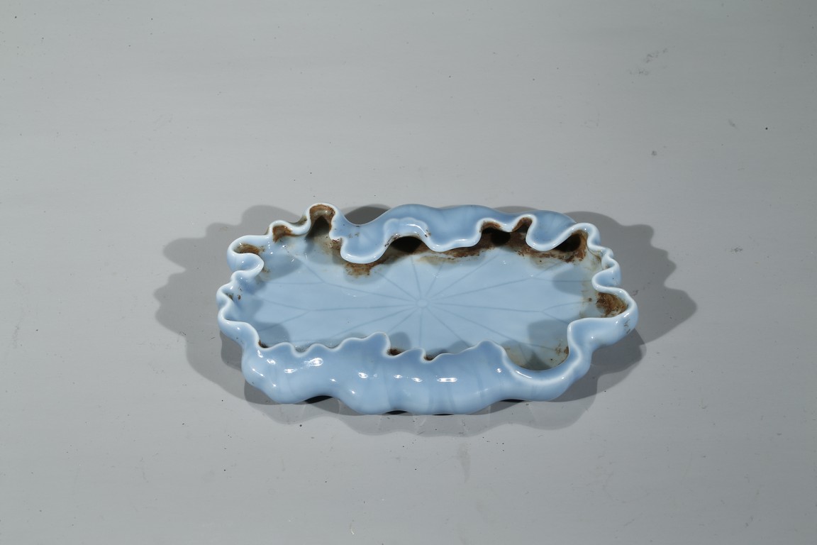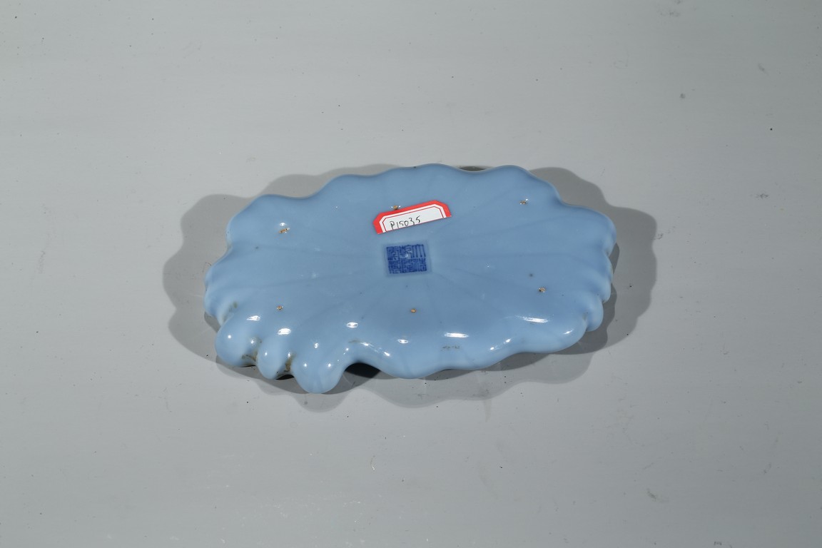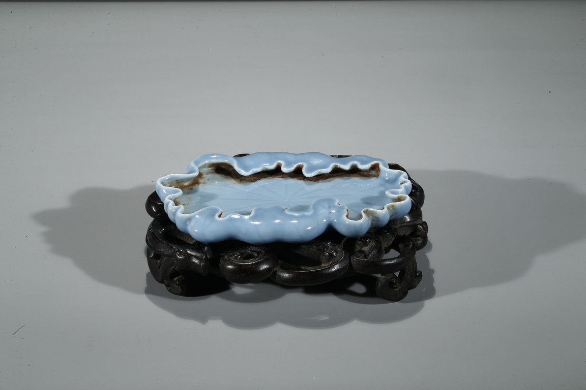 通體飾天藍釉,作荷葉形,器形小巧。荷葉邊緣翻捲,合圍成筆舔之形,設計奇巧 舒緩自如,逸散著一種流動的韻律。葉脈線條清晰,纖細,若隱若現,更賦動感,別有一番情趣。 大清乾隆年制 款識。配硬木座 。