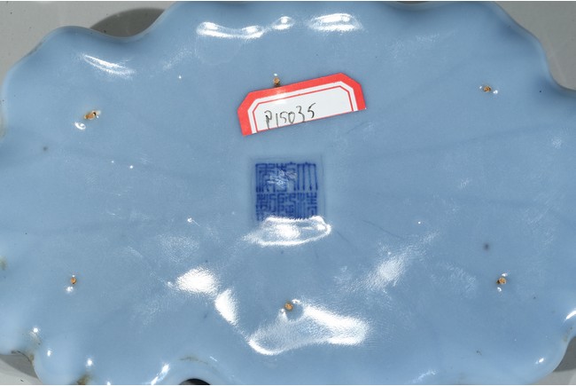 Modelled in the form of furled lotus-leaf, overall suffused with sky blue glaze, base inscribed with six character Qianlong mark, fitted with an openwork hardwood stand. Qing Dynasty period.
