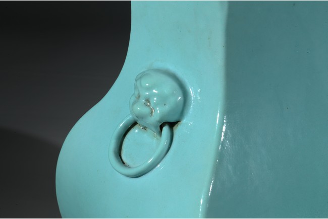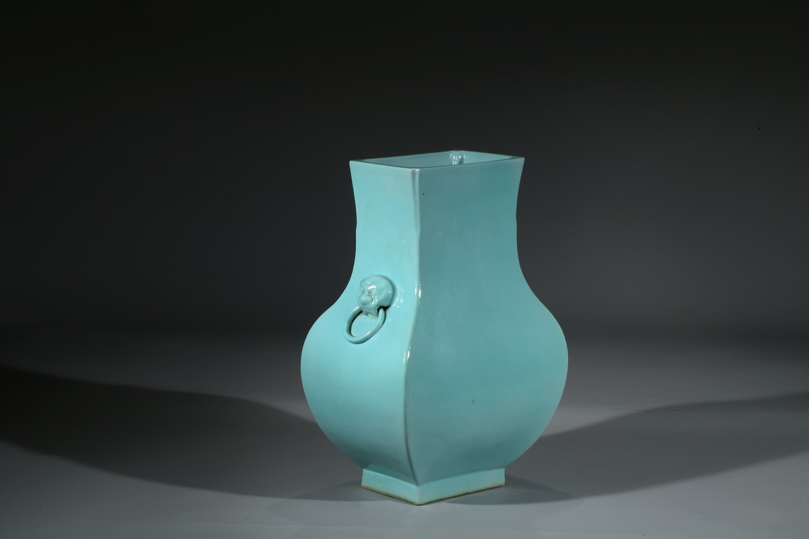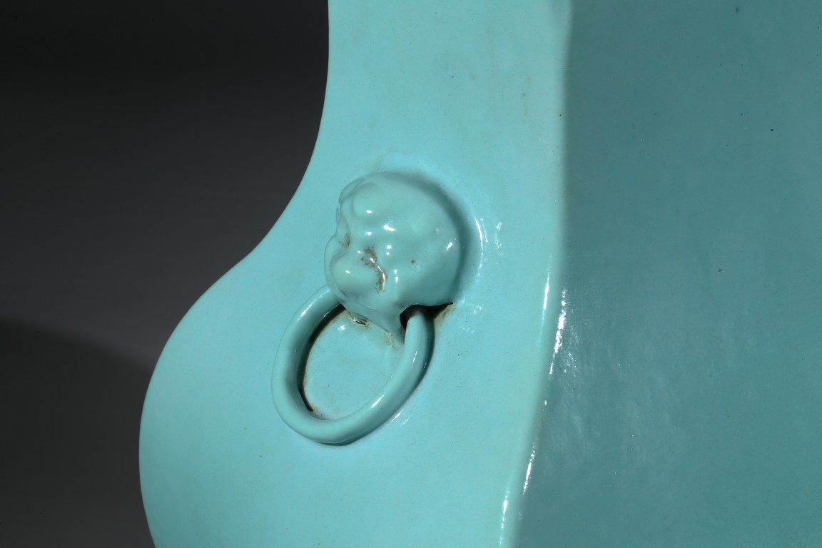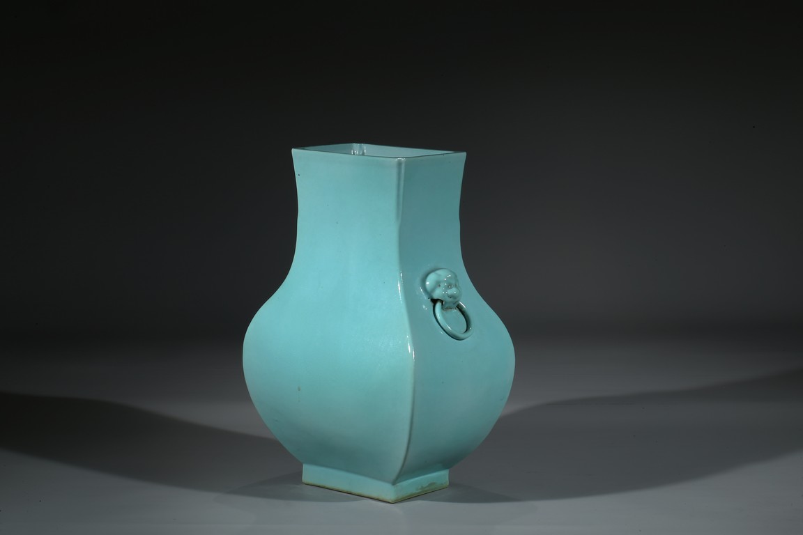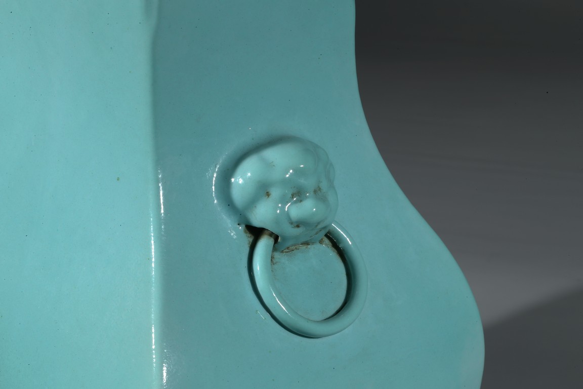 Of square section, the rounded sides rising from a tall spreading foot to a waisted neck and straight rim, with two moulded lion mask-ring handles to the shoulder, overall suffused in turquoise green glaze, base with seal stamp. Qing Dynasty period.