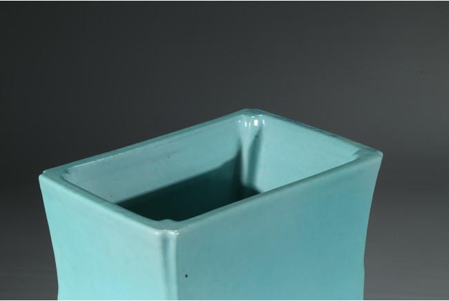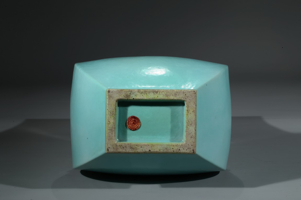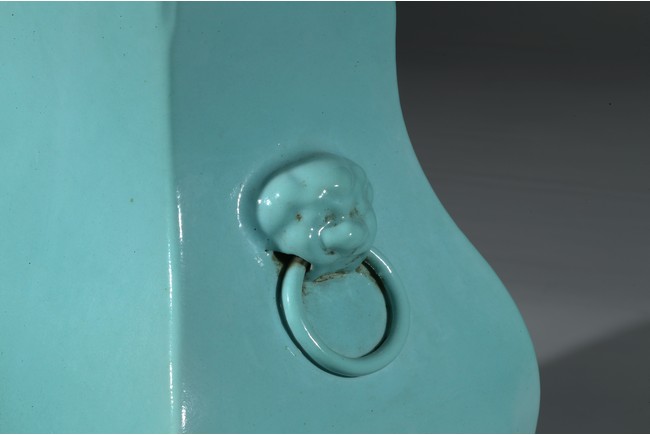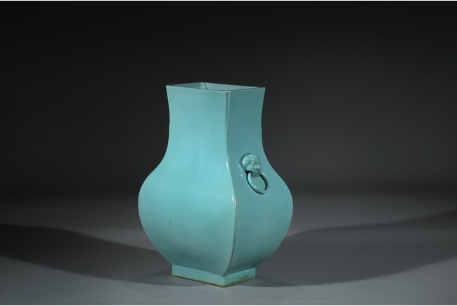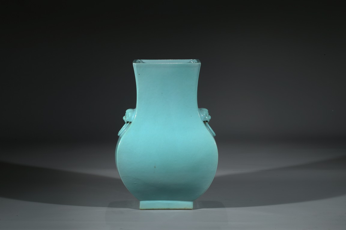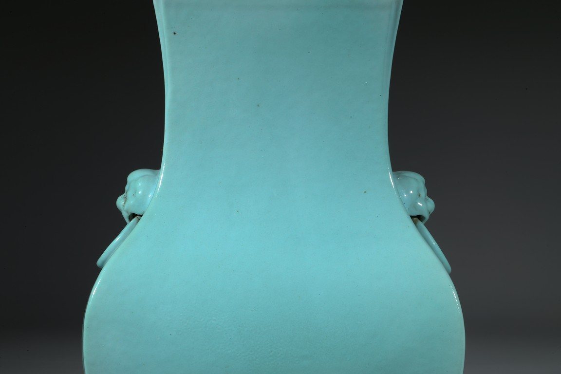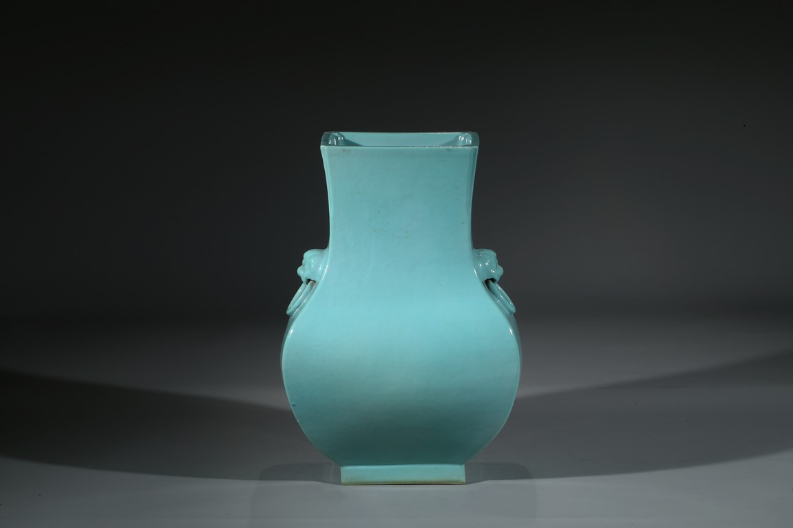 Of square section, the rounded sides rising from a tall spreading foot to a waisted neck and straight rim, with two moulded lion mask-ring handles to the shoulder, overall suffused in turquoise green glaze, base with seal stamp. Qing Dynasty period.
