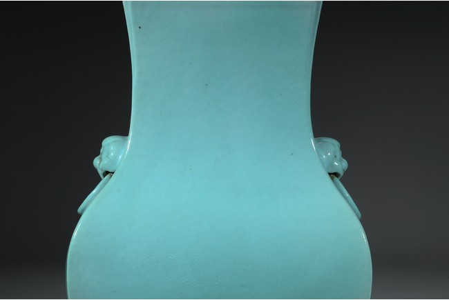 Provenance: Property from a private collection, San Francisco 雍、乾兩朝,單色瓷品多仿古器。本瓶如是,意取上古青銅壺形,此類形製為官窯藝匠首創。本品尊貴端莊,造型恢弘古雅,雙獸耳,通體敷施粉青釉,淡雅嬌嫩、瑩潤如玉,極見勻淨雅靚之致,深為其輕逸媚人之風韻所折服。細觀本品,器形碩大,線條秀美流暢,莊重雅觀,釉色寧靜潤潔,光亮柔美。 來源:三藩市私人藏家收藏