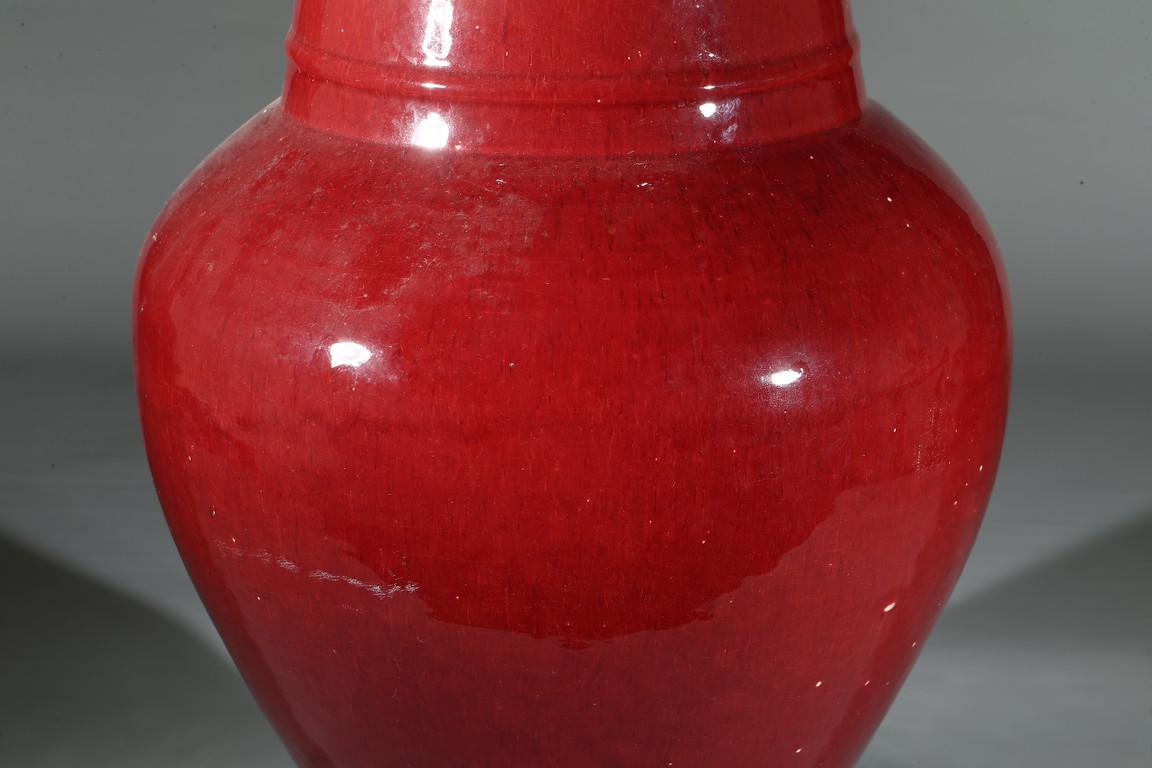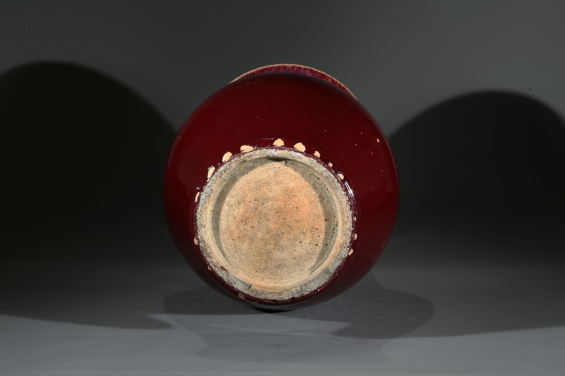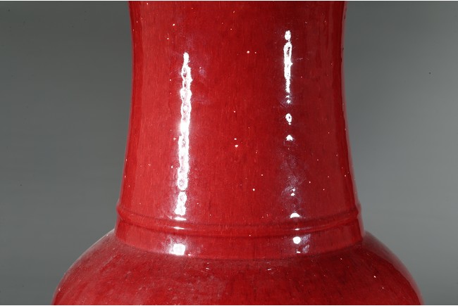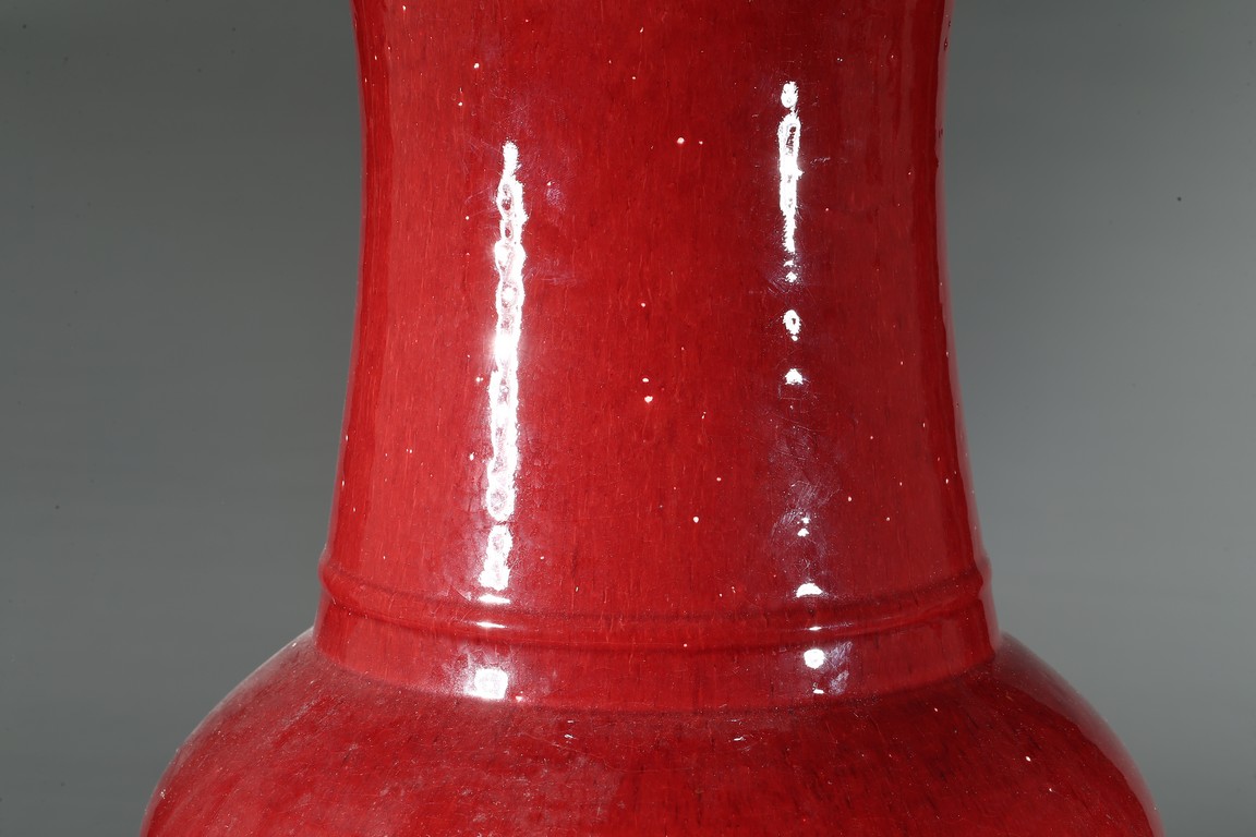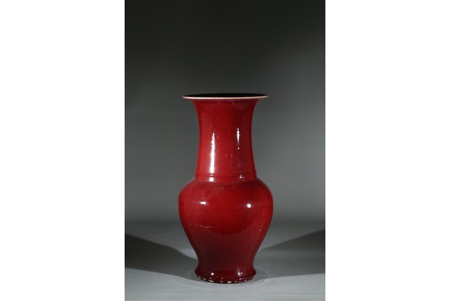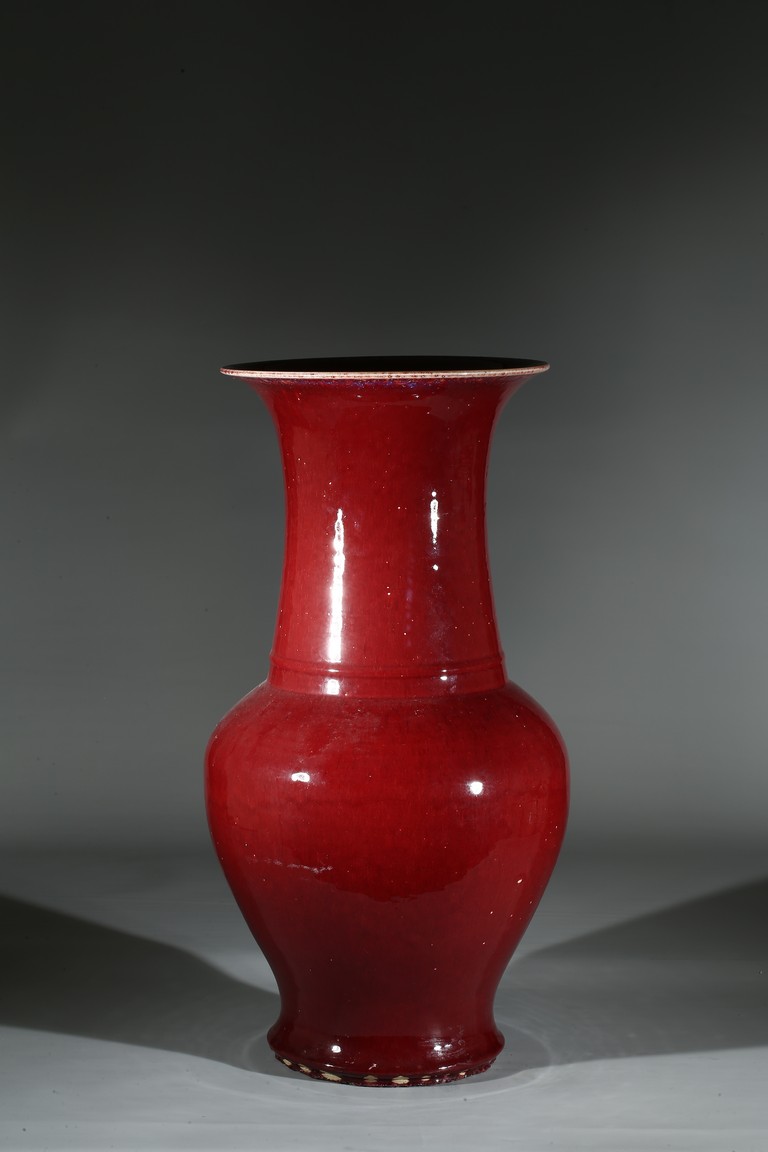 撇口,束頸,豐肩,鼓腹,其下漸斂,外壁施郎窯紅釉,釉質堅致細膩,其愈下而紅色愈濃重。整器造型秀美端莊,釉色鮮麗,技藝精湛,堪稱佳品。