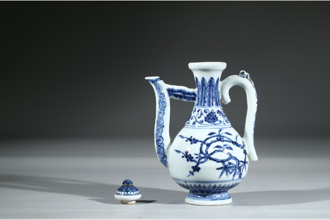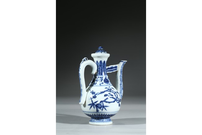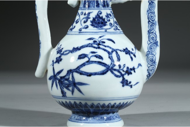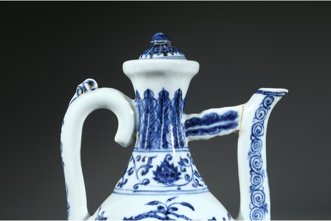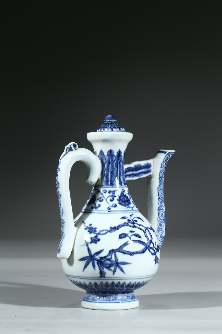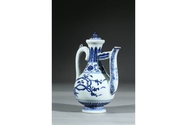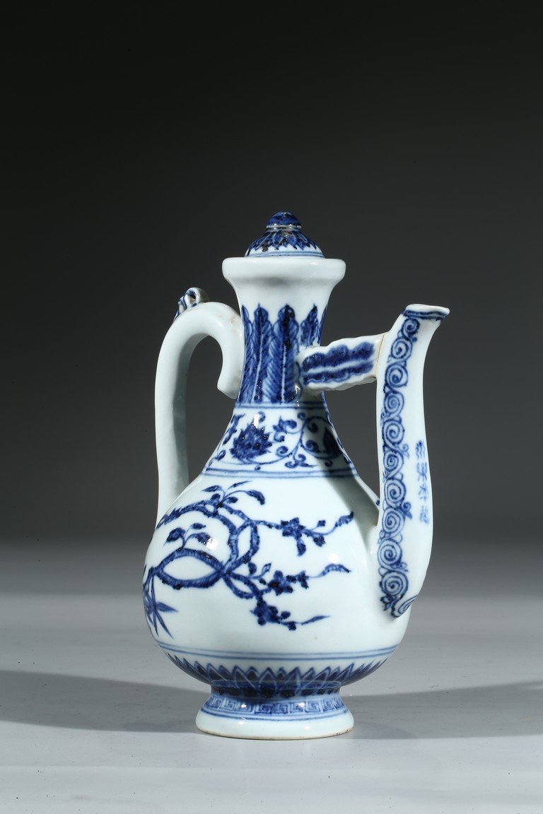 永樂一朝窯事興盛,成就卓越,上承宋元,下啟康乾,創新發明極多,器類式樣之豐富,釉色裝飾之廣泛,為此前所未經見,其中青花一門極負盛名,深得後世推崇。本品為永樂青花執壺之翹楚,以紋飾罕見而著稱。其壺身呈玉壺春瓶式樣,腹一側設長彎流,流與頸之間以雲形板連接美觀實用,設計巧妙。器型線條複雜多變,雍容秀美。通體以青花繪就,層次豐富,佈局得宜,毫無繁縟之感。其青花凝重妍麗,蒼雅雄勁,一如水墨,所繪諸花筆觸細膩,氣韻流暢,盡現永樂御瓷纖巧柔美之風姿。
