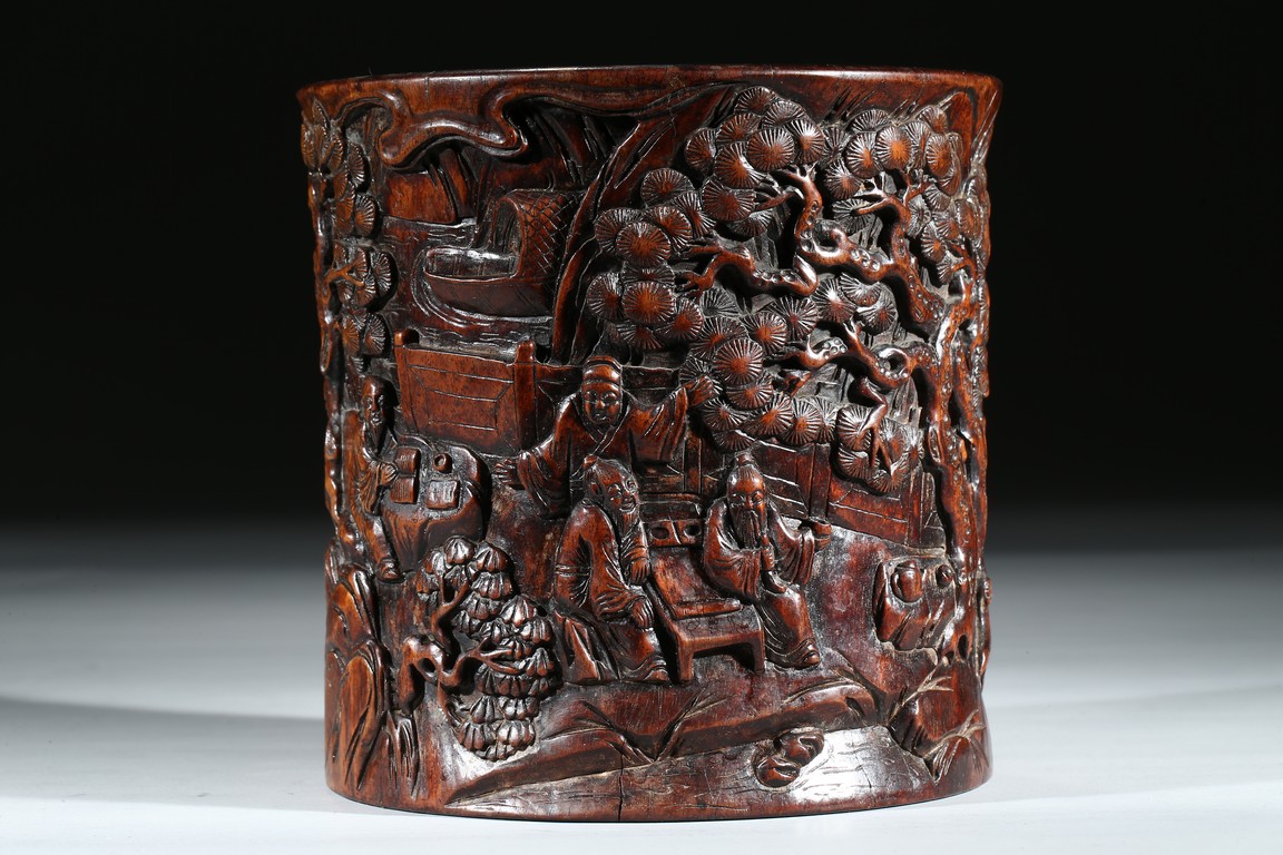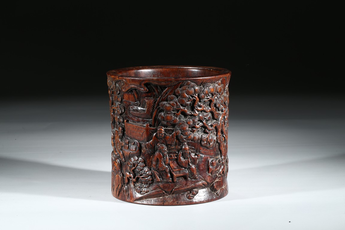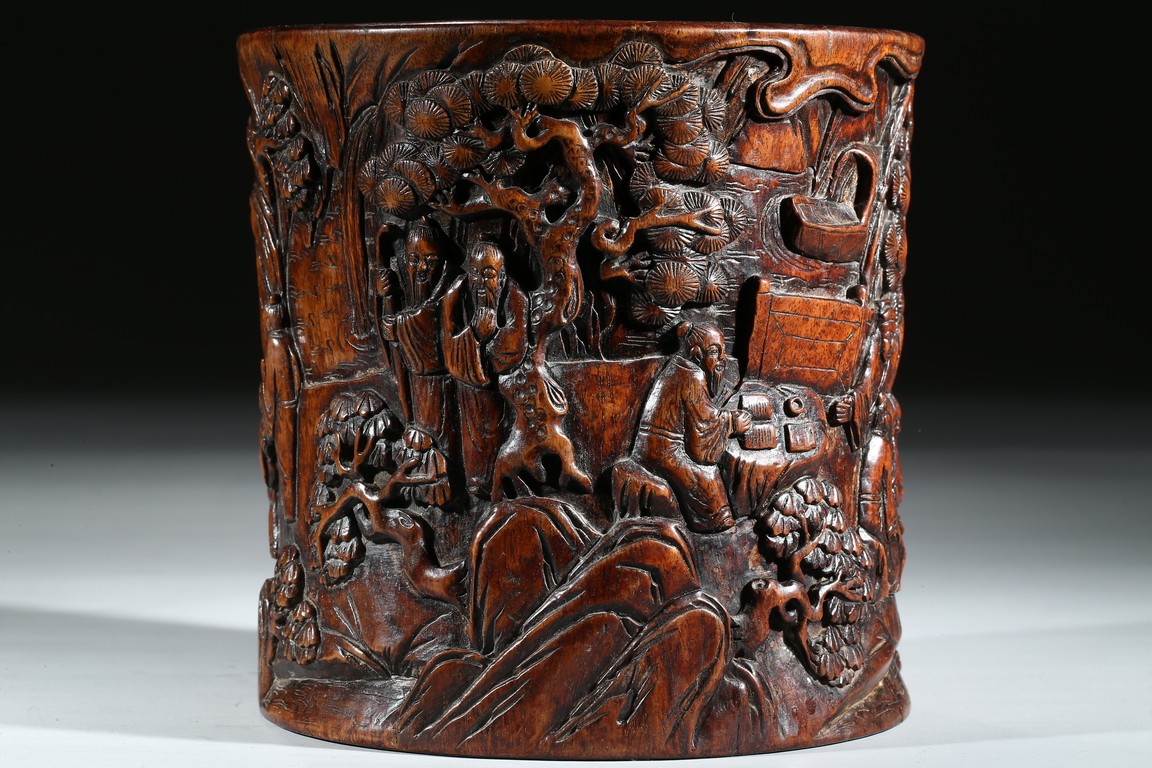 Provenance: Property from a private collection, San Francisco 此拍品花梨木浮雕山水人物筆筒,取花梨木為之,包漿厚重,浮雕松樹、文人墨客、伴讀童子、桌椅、圍欄、山石構成文人山水畫場景。古樸拙雅,構圖巧妙,富有筆情墨趣。 來源:三藩市私人藏家收藏