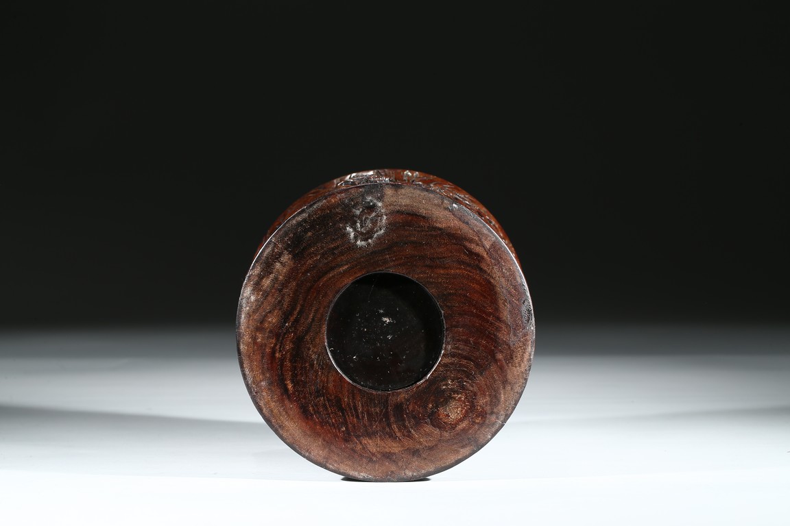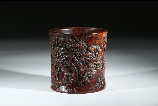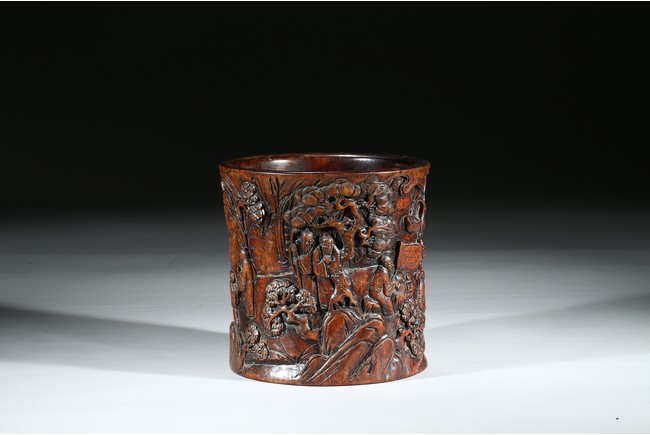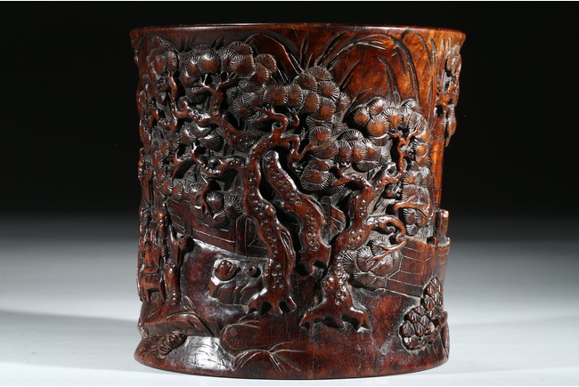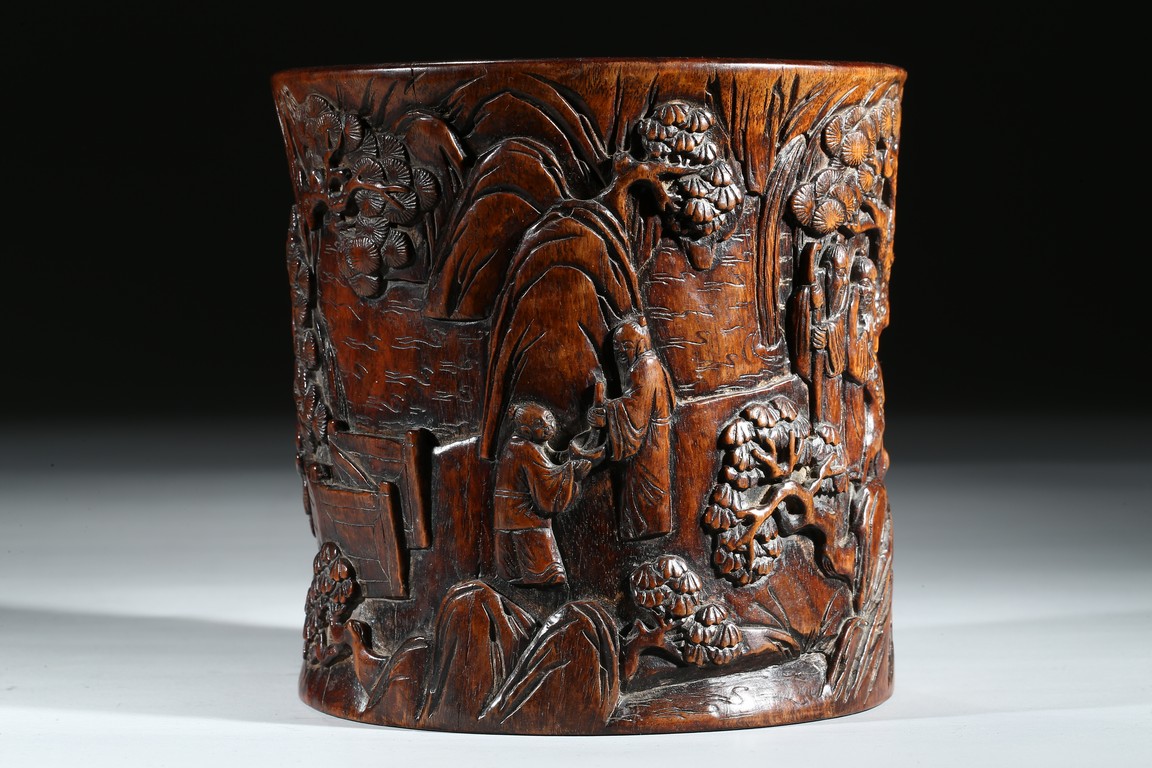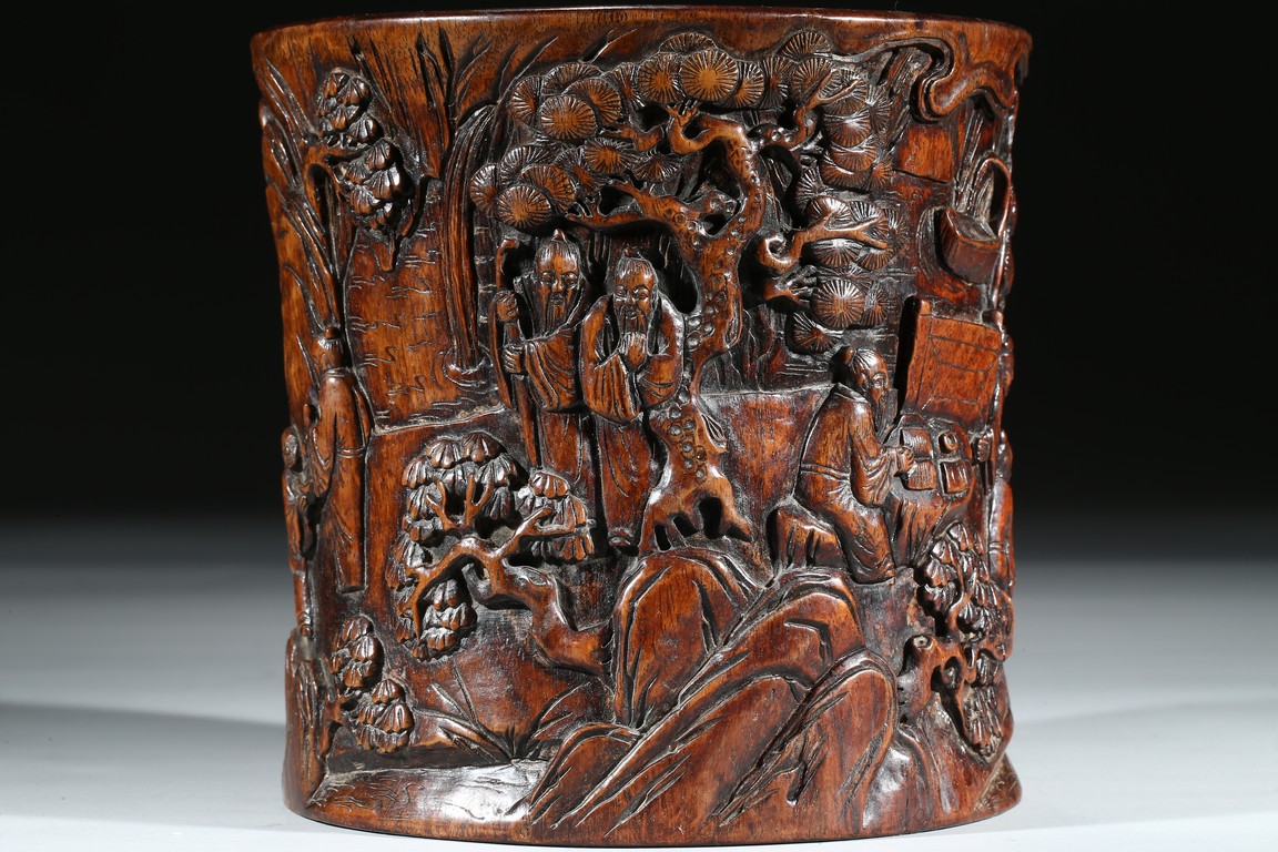 Provenance: Property from a private collection, San Francisco 此拍品花梨木浮雕山水人物筆筒,取花梨木為之,包漿厚重,浮雕松樹、文人墨客、伴讀童子、桌椅、圍欄、山石構成文人山水畫場景。古樸拙雅,構圖巧妙,富有筆情墨趣。 來源:三藩市私人藏家收藏