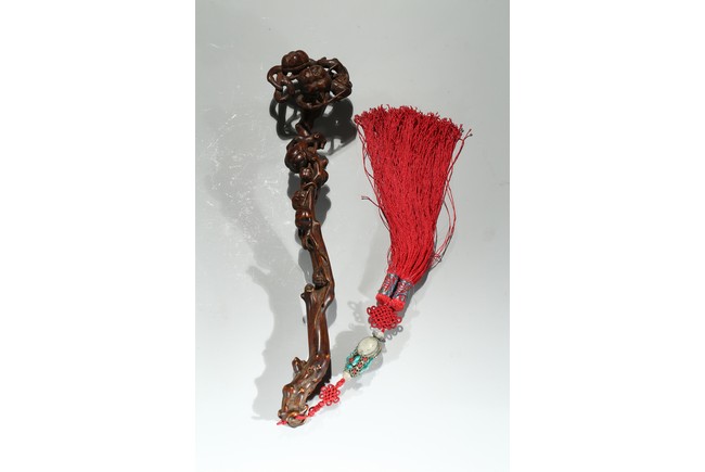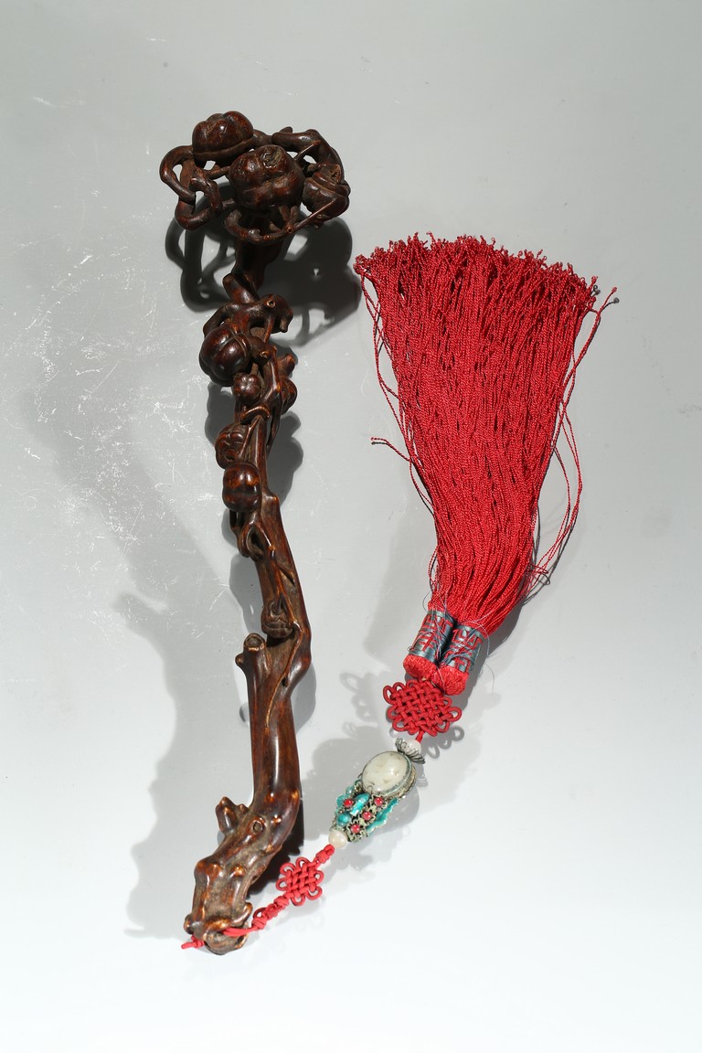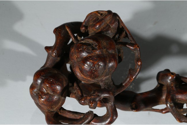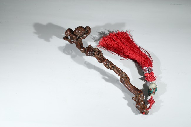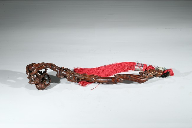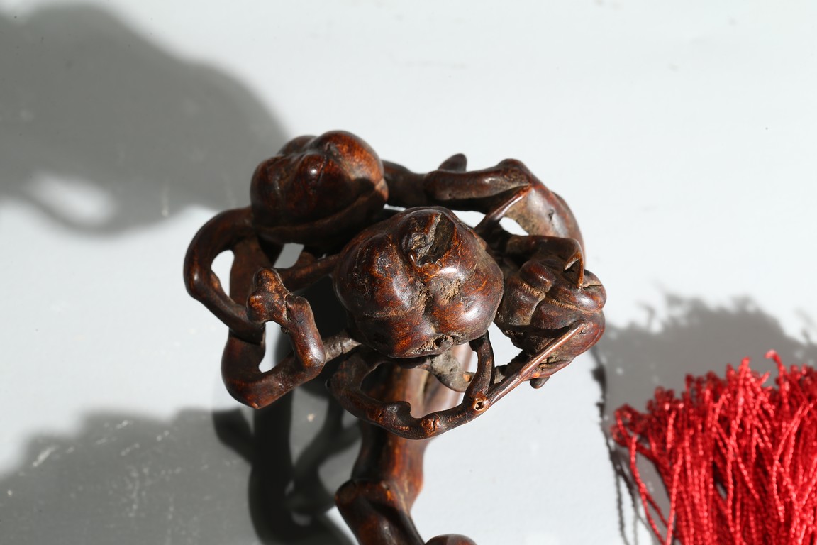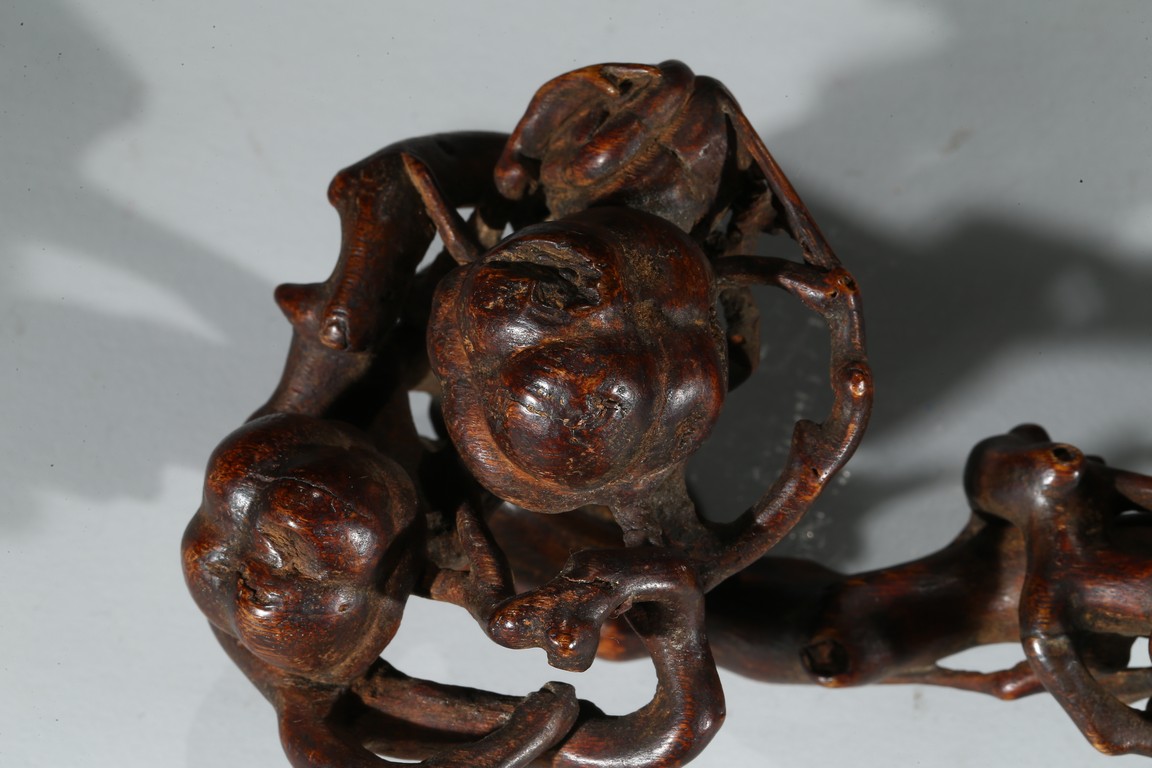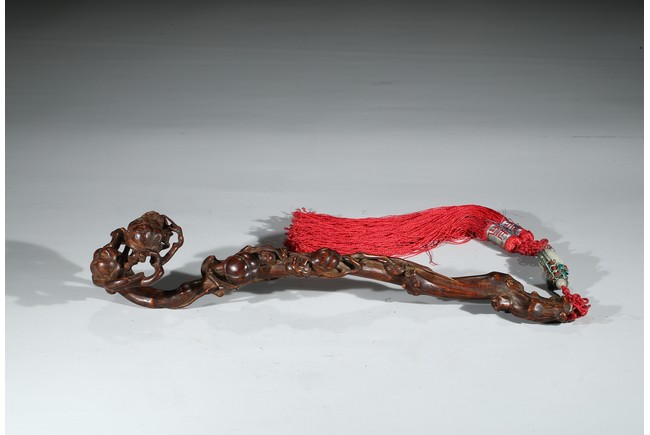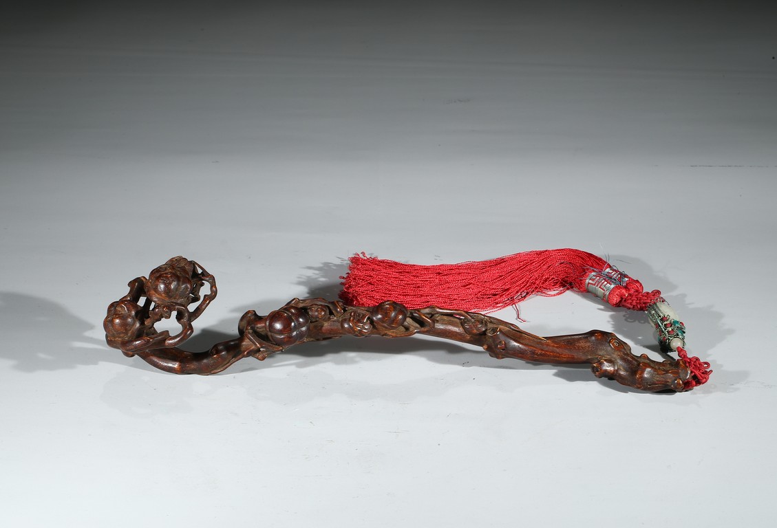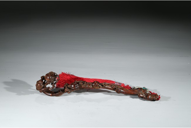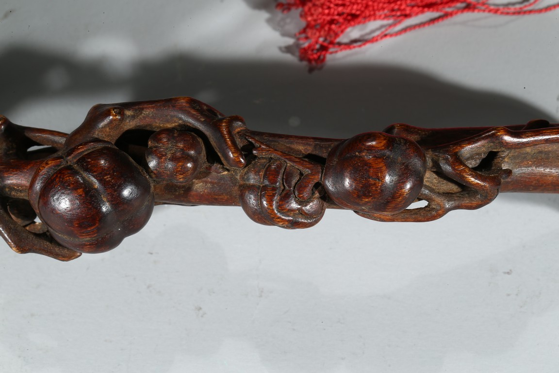 此件沉香如意選料上乘,香脂凝結厚重,雖經曆數百年,摩挲中仍散發出幽幽淡香。如意長條狀,頭拱起。由首至尾通體滿雕壽桃,雕刻細膩,形象寫實,線條流暢,寓意吉祥。