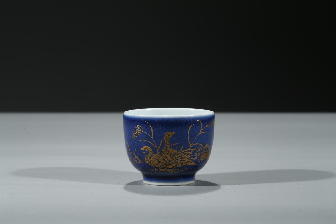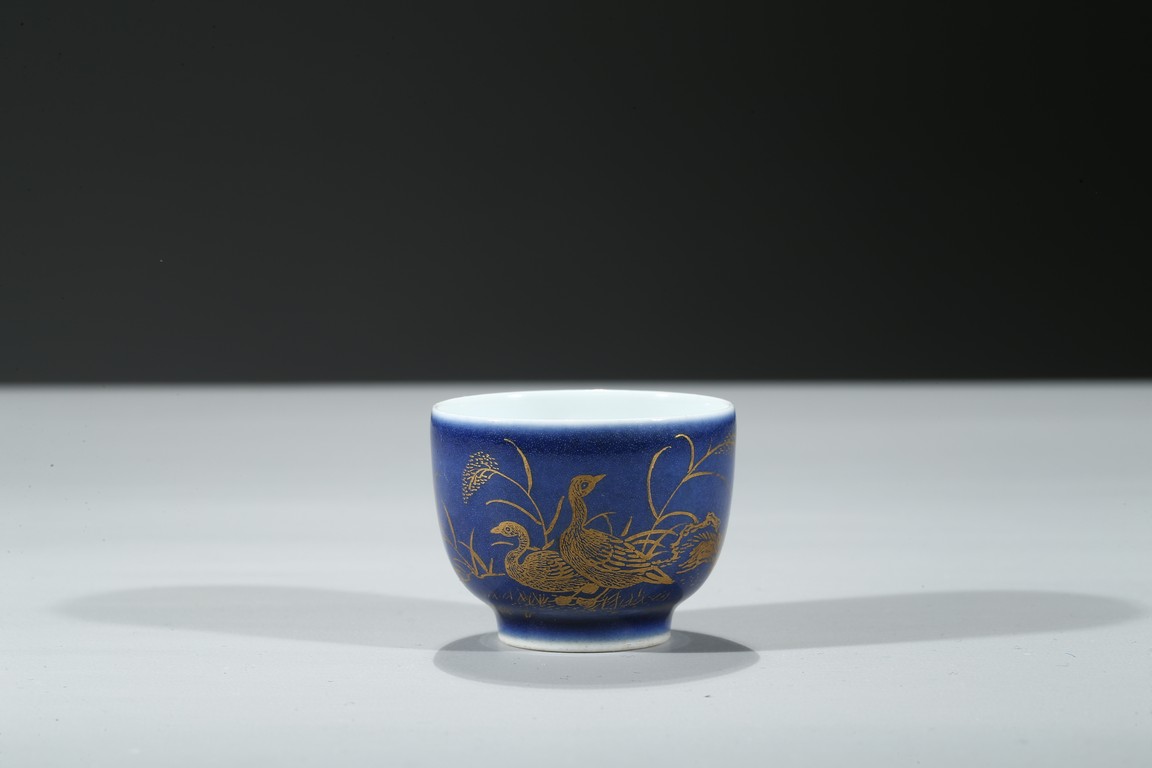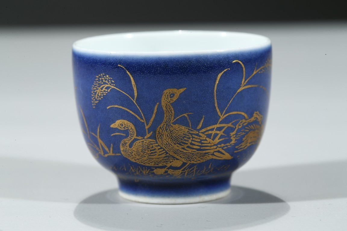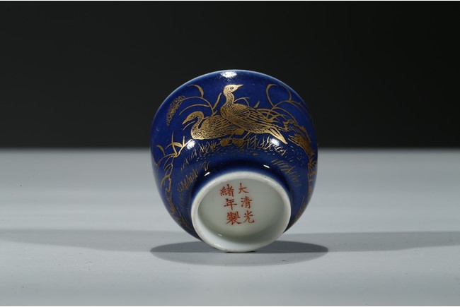Potted with deep sides rising from a short foot, finely decorated in gilt to depict geese and water lilies and reeds, all reserved on blue glaze ground, the base inscribed with six character Guangxu mark. Qing Dynasty period.