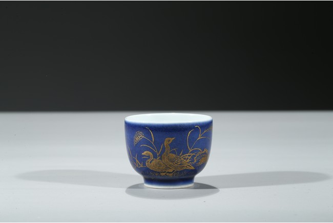 直口,直腹,腹部下收,圈足。通體飾祭藍釉,描金繪蘆雁,畫工精緻細膩,栩栩如生,蘆葦隨風搖擺,富於動感。“大清光緒年制”款識。