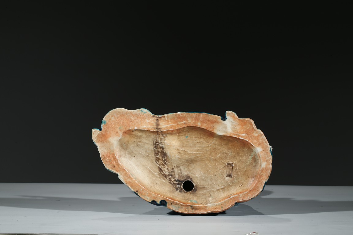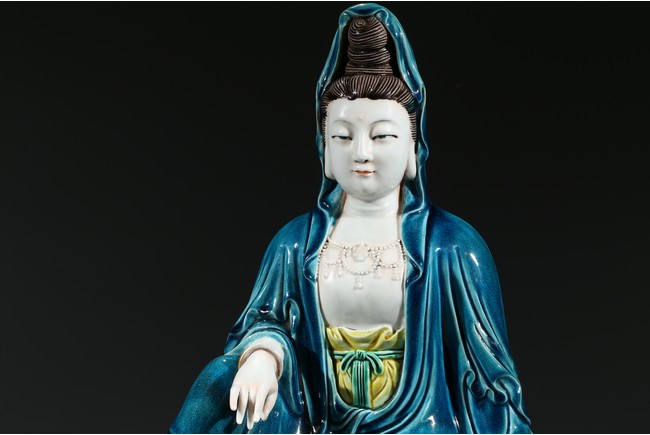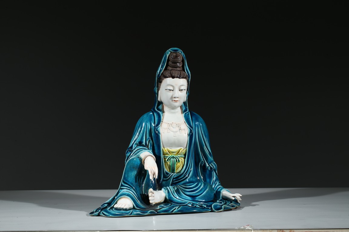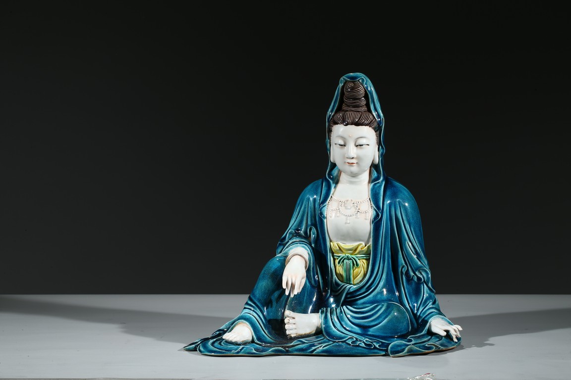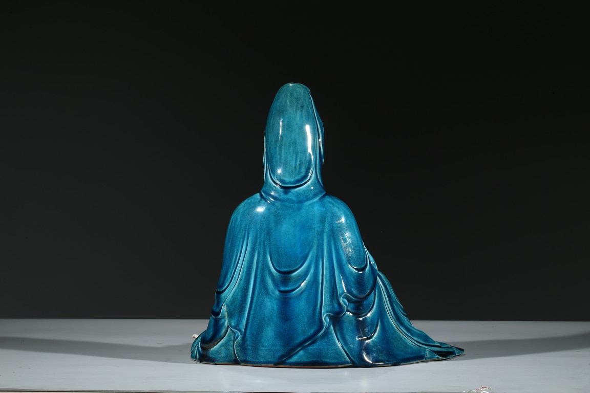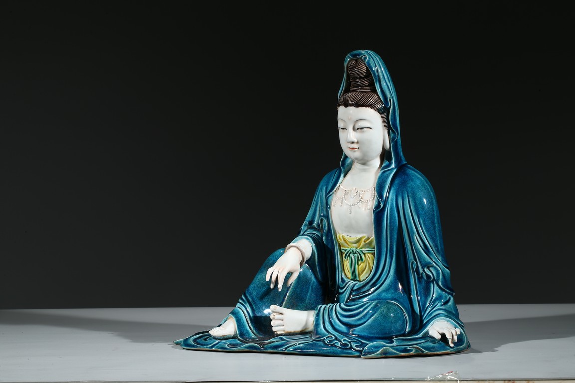Modelled with right arm rested on the raised right knee, wearing a peacock blue glazed robe open at the chest to show bead necklace, the face with serene expression, the hair piled up into a high chignon in veil. Base impressed with four character mark.