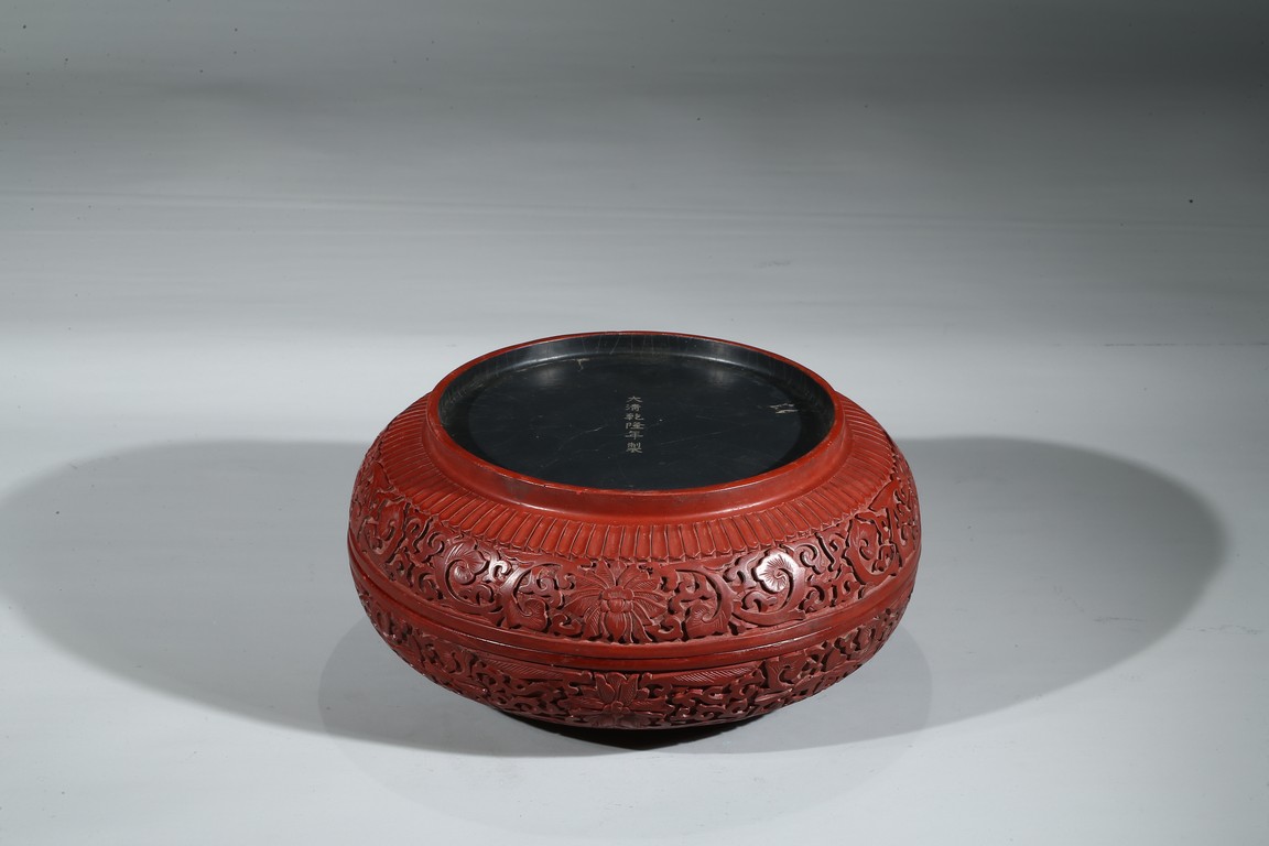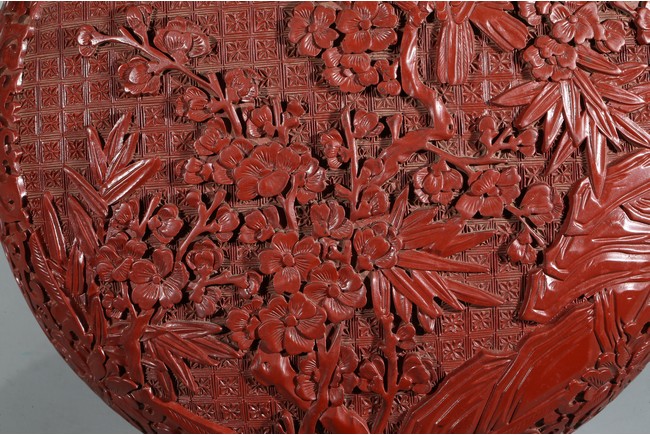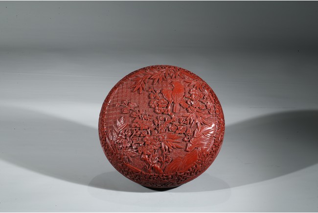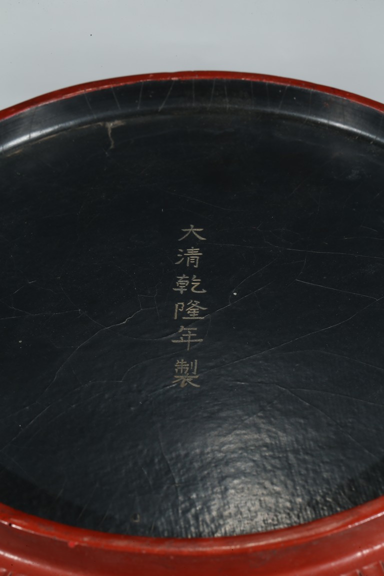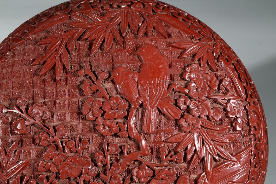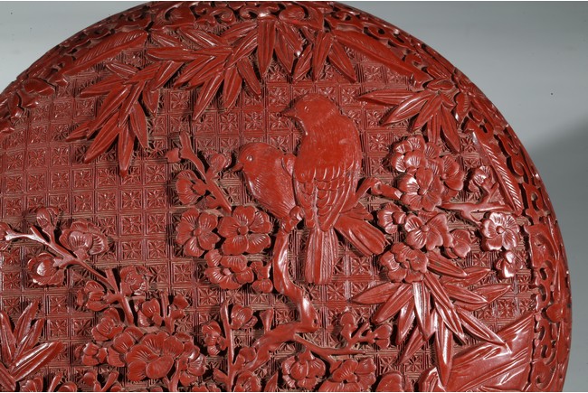 蓋盒為圓形,子母口,器底下凹成圈足,造型周正,樣式美觀。通體髹朱漆,漆色紅潤。蓋面以米字格紋為地,上雕有喜鵲登梅紋樣,花朵層次豐富,枝葉彎曲自如,葉隨花轉;花鳥俯仰相間,環繞不斷,構圖錯落有致。寓意吉祥、喜慶。近足處“大清乾隆年製”款識。整器花鳥布展秩序井然,花形圓滿,葉片居間烘托,物像清晰分明,生氣盎然。刀法俐落,起伏細膩,打磨圓潤,刻畫流暢,充分顯示了乾隆的官造水平。