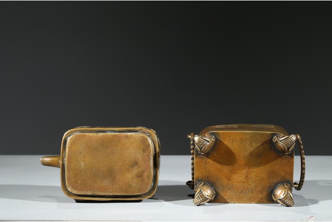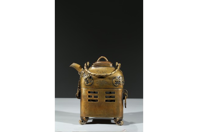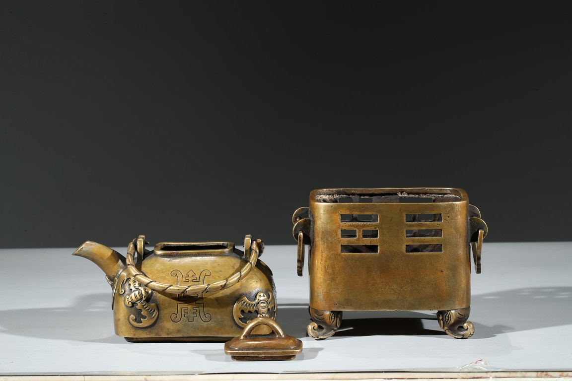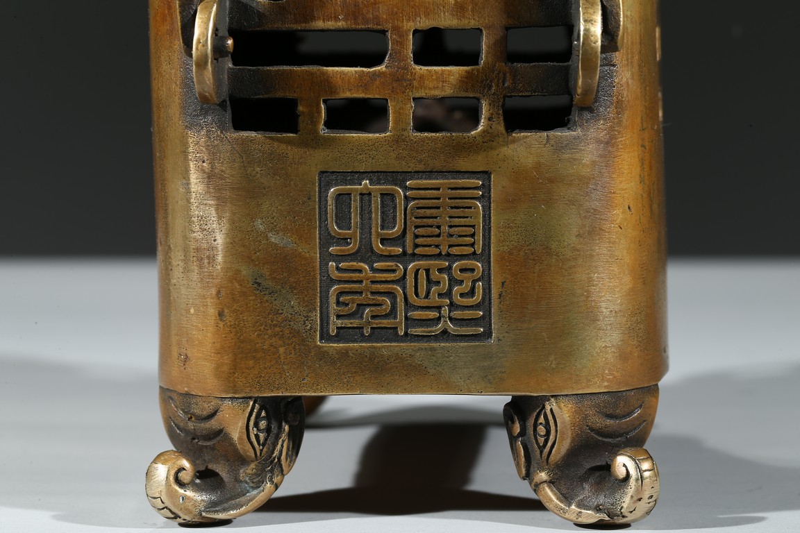 Supported on four elephant head feet, body with openwork bagua motif flanked by two ring handles, the upper section decorated with bat and shou, fitted with cover. Qing Dynasty period.