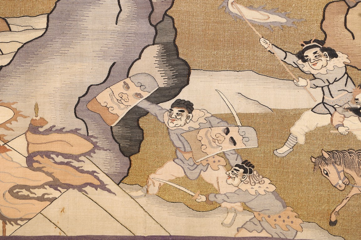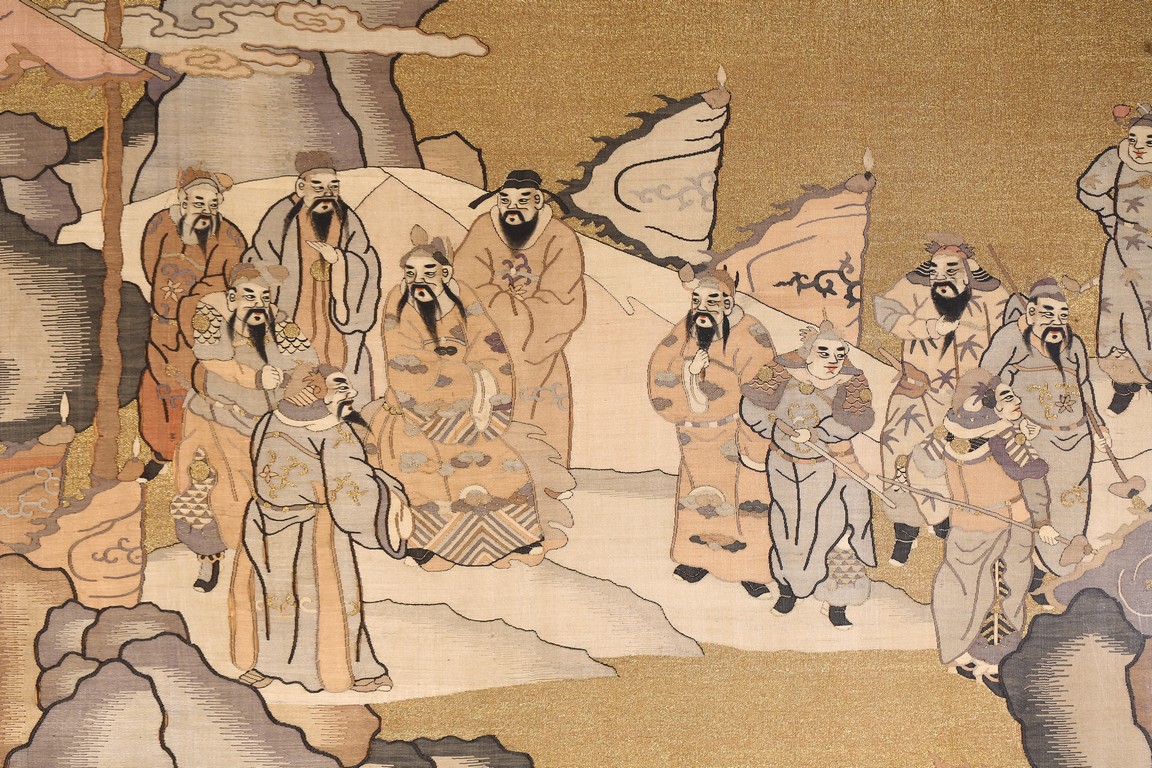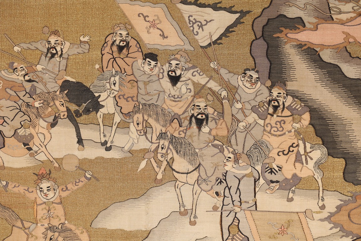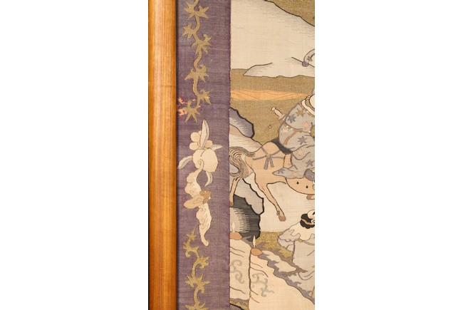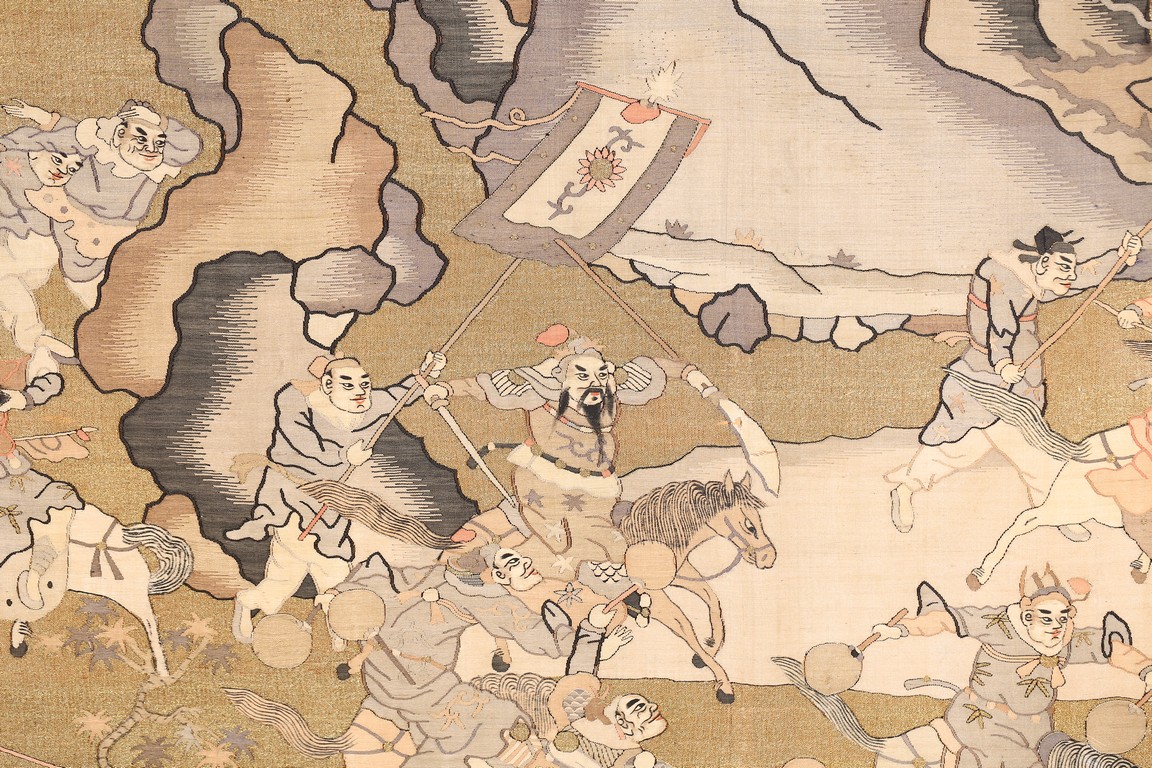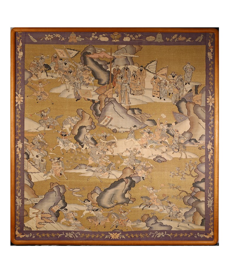 This large panel features many finely woven silk warrior figures depicted in active battle with scenes of armed warriors on their horses, flag bearers, and officials observing from rock outcroppings. The background is woven with gold-wrapped threads, giving the entire ground a beautiful, shimmering gold effect in light. It has a grey silk kesi border consisting of flowers and precious objects. The aesthetically simple, solid wood frame is crafted with rounded edges and corners. Qing Dynasty period.