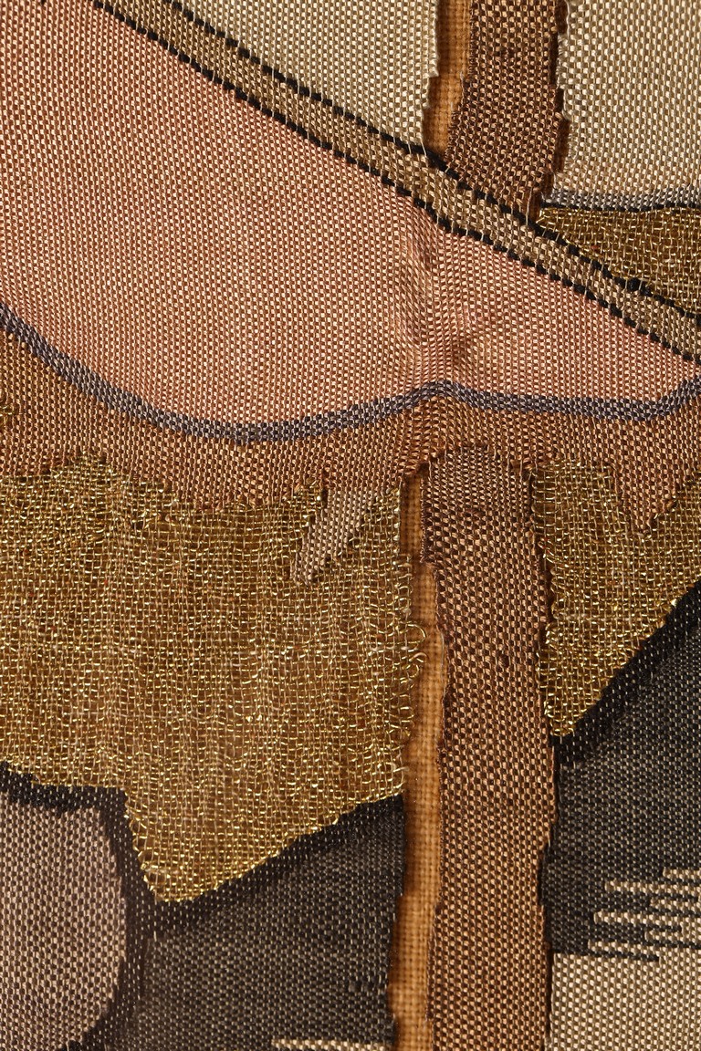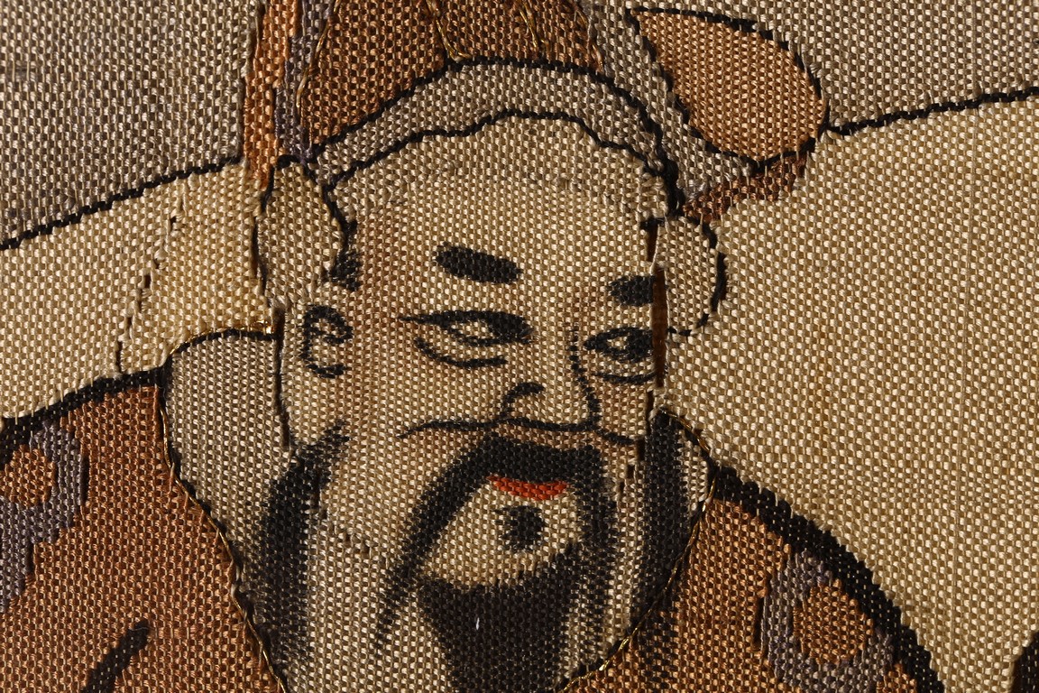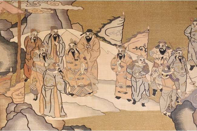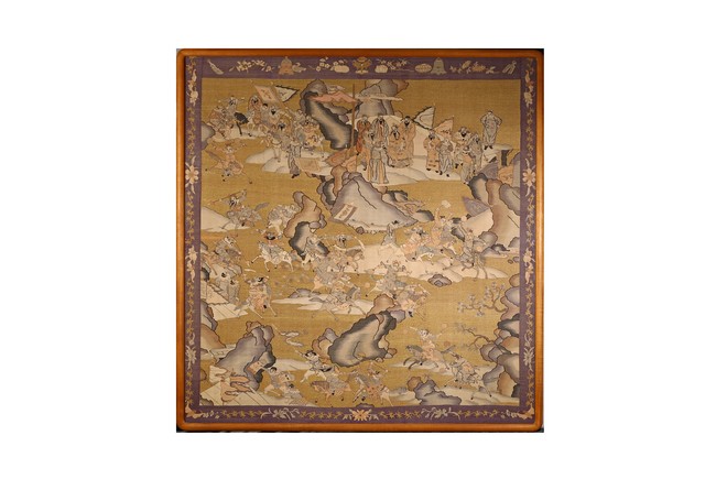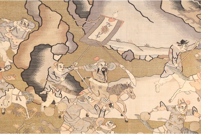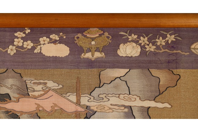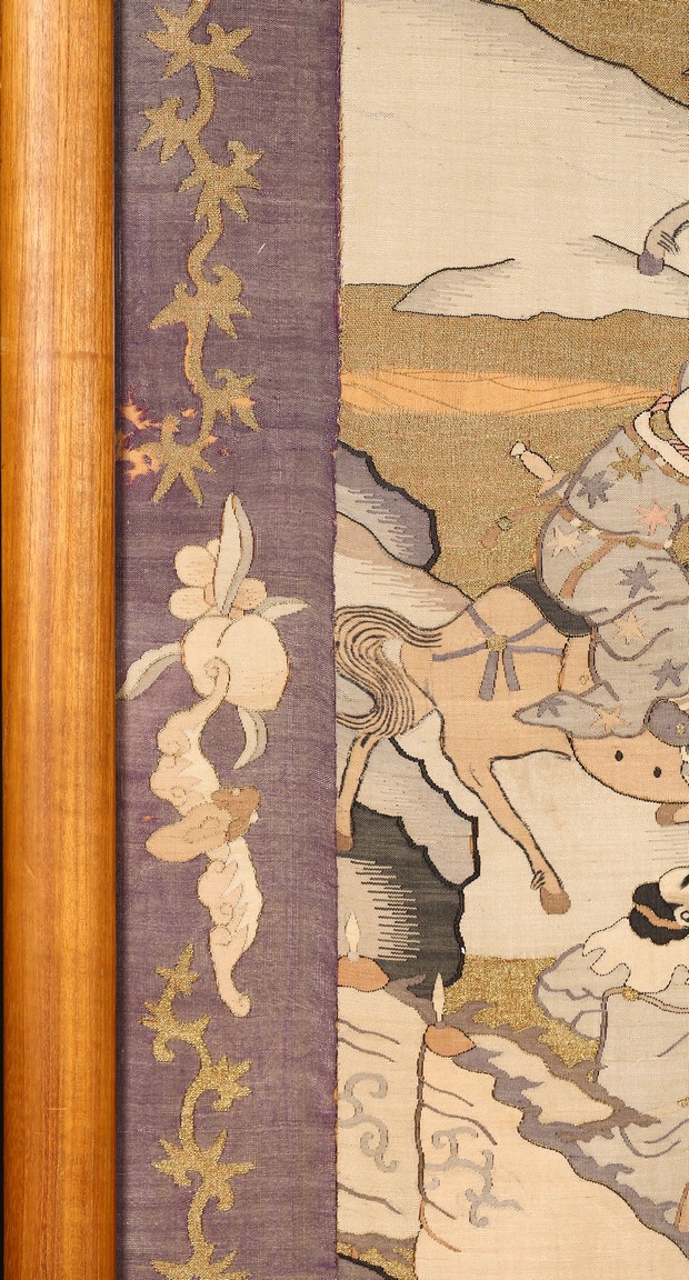 This large panel features many finely woven silk warrior figures depicted in active battle with scenes of armed warriors on their horses, flag bearers, and officials observing from rock outcroppings. The background is woven with gold-wrapped threads, giving the entire ground a beautiful, shimmering gold effect in light. It has a grey silk kesi border consisting of flowers and precious objects. The aesthetically simple, solid wood frame is crafted with rounded edges and corners. Qing Dynasty period.