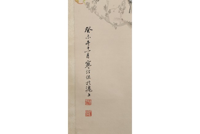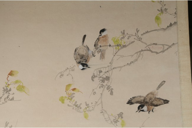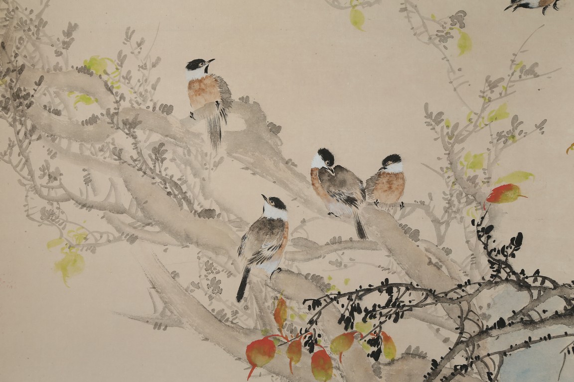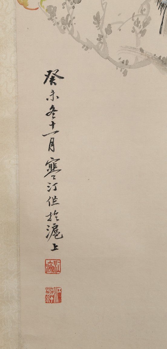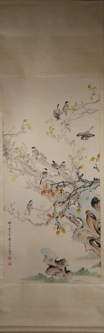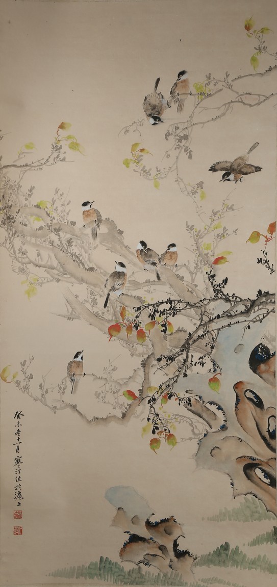 Ink and color on paper. Birds and flowers. Hanging scroll. Inscribed and signed Handing, with two seals of the artist.