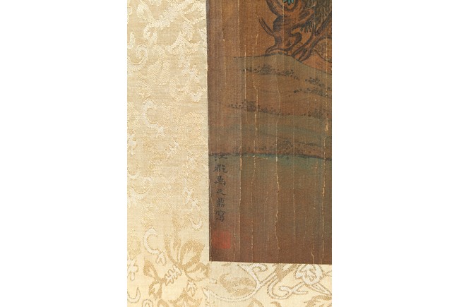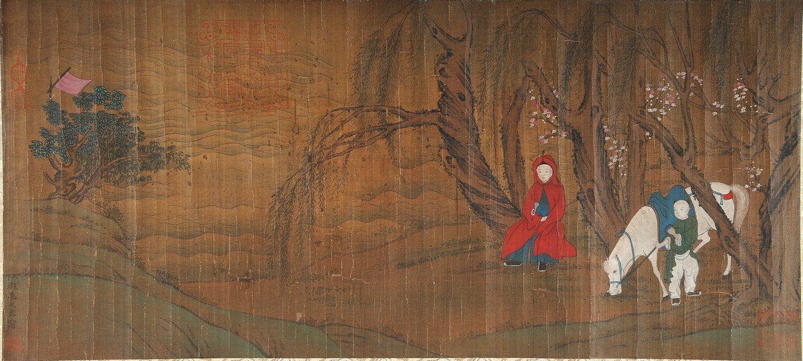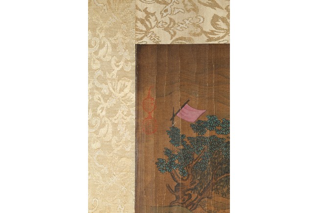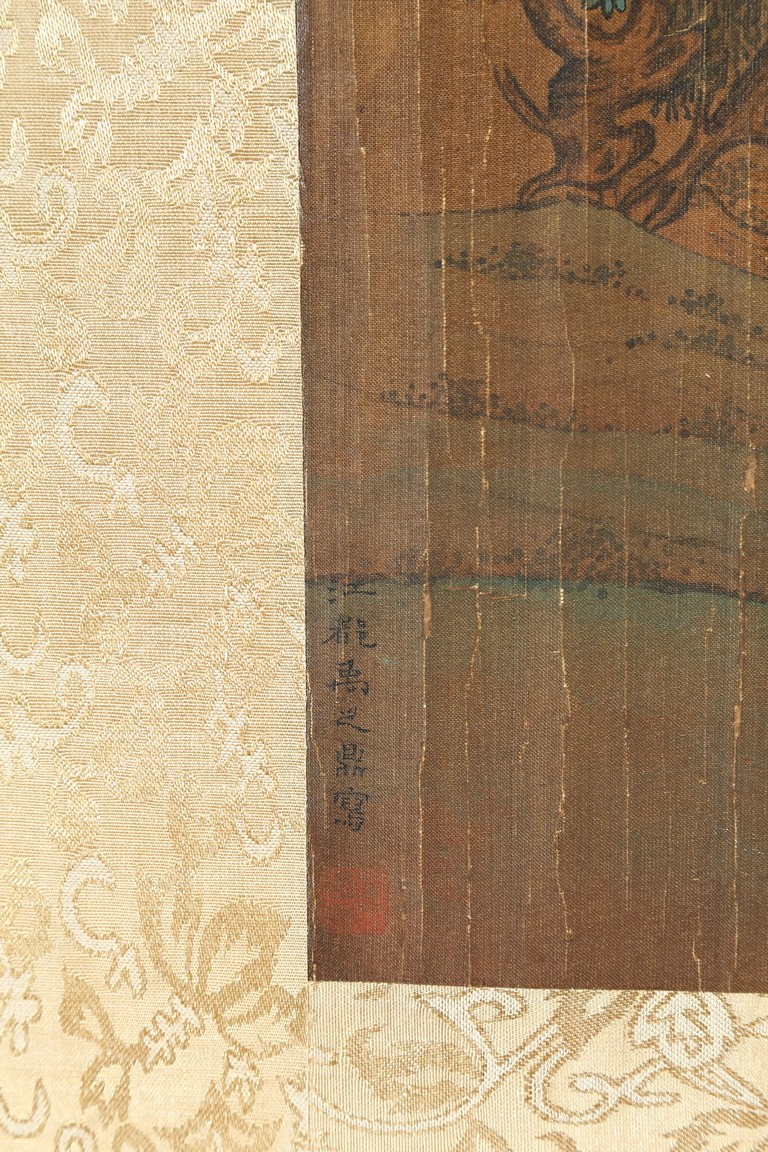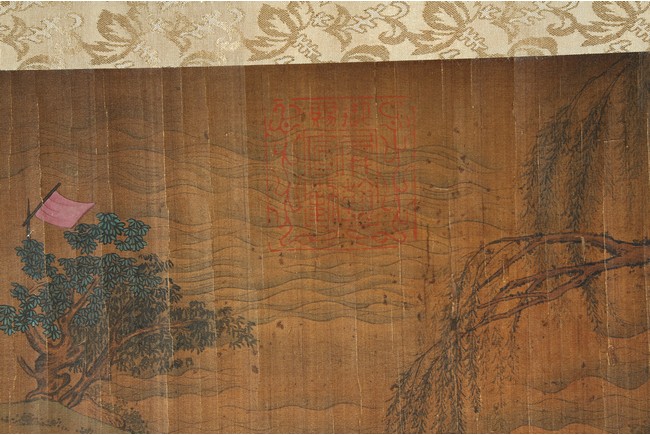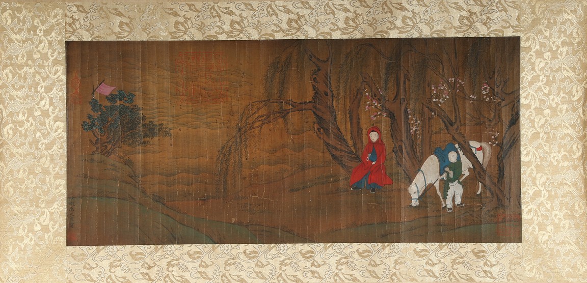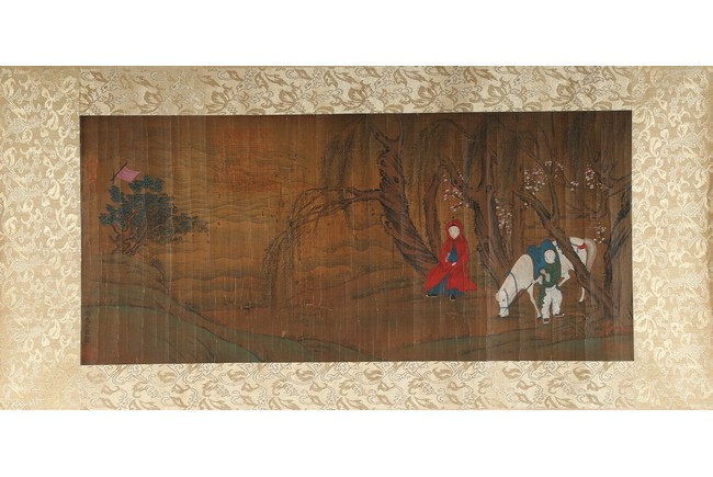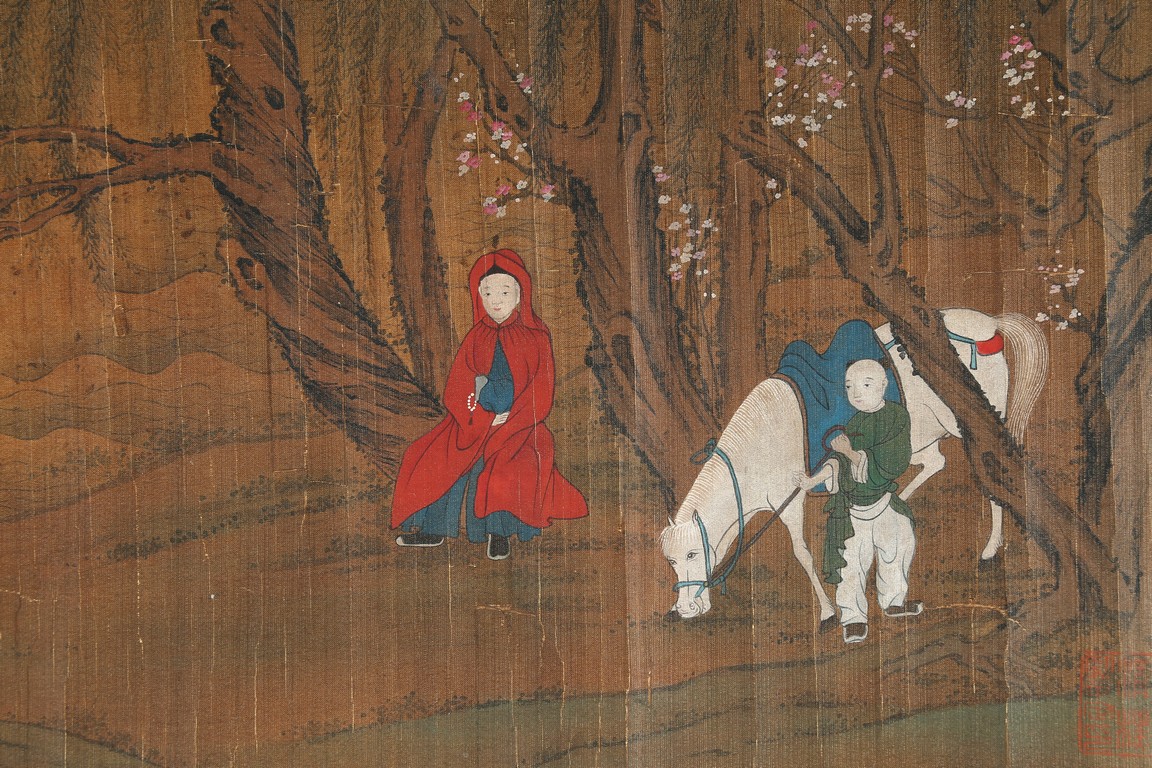 Ink and color on silk. Landscape and figure. Framed. Signed Yu Zhiding and with four seal marks of the artist and collector.