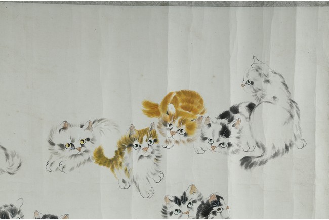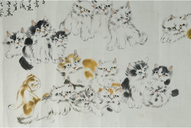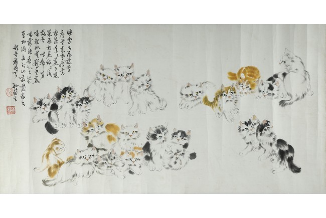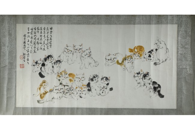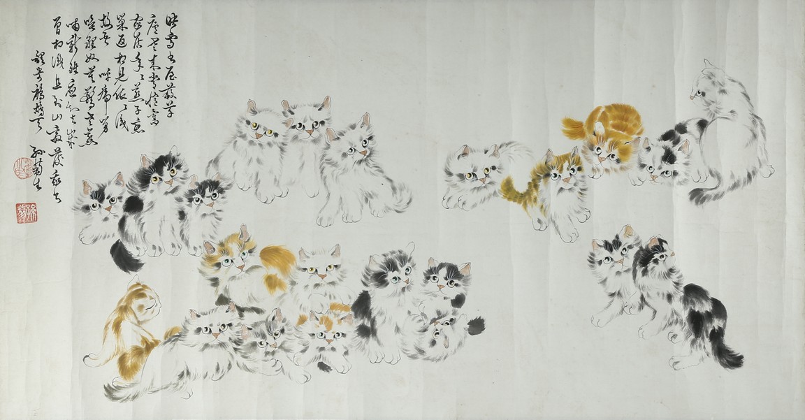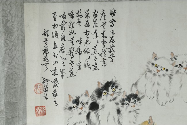 Ink and color on paper. Cats. Mounted on paper. Inscribed and signed Sun Jusheng with two seals of the artist.