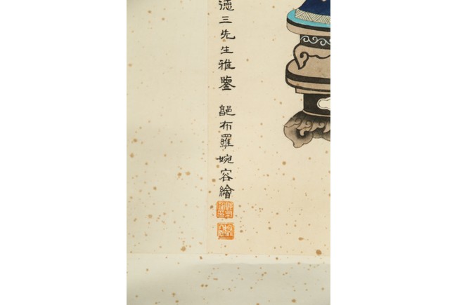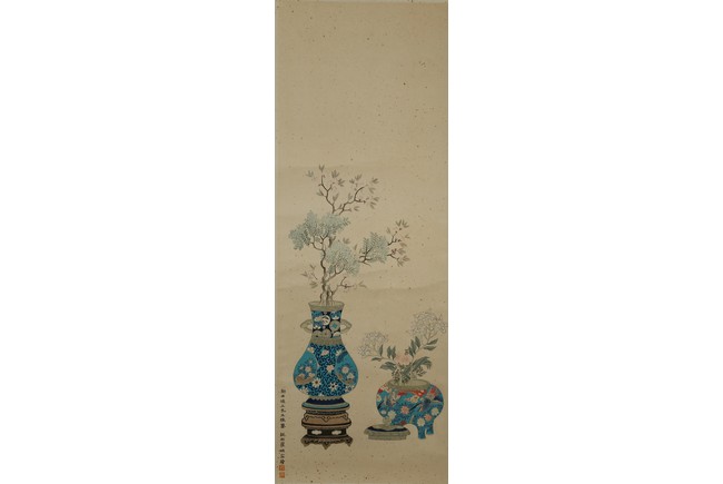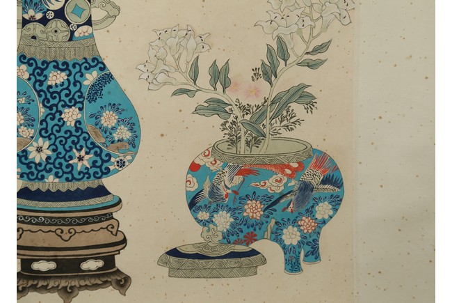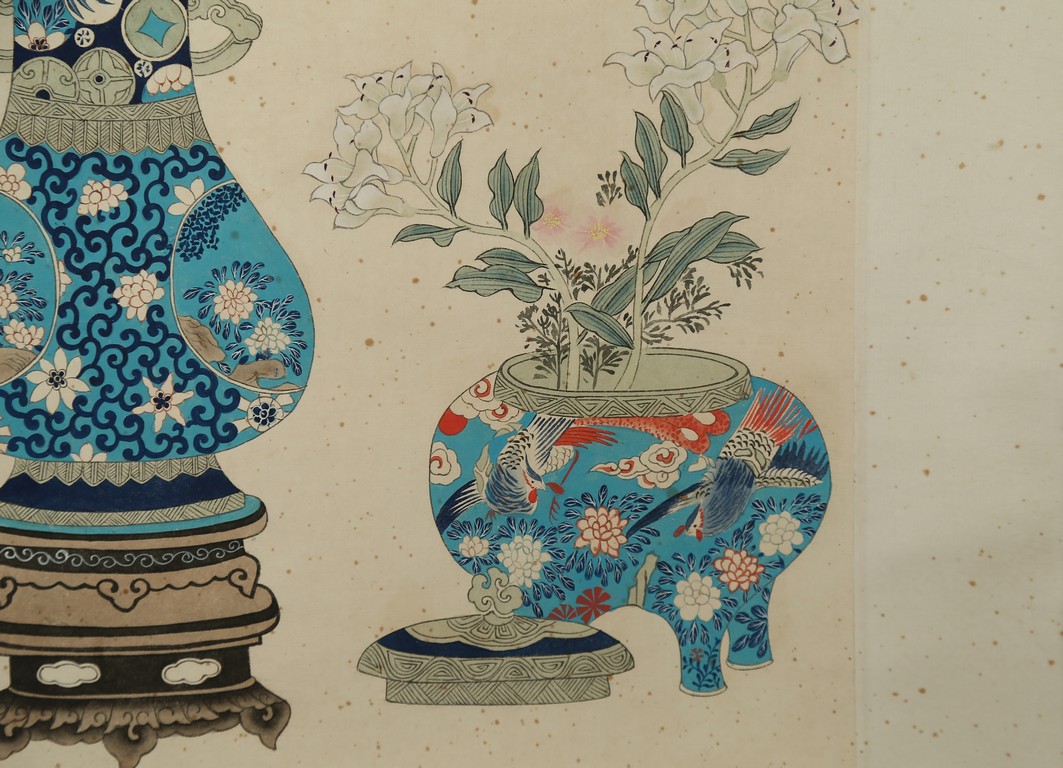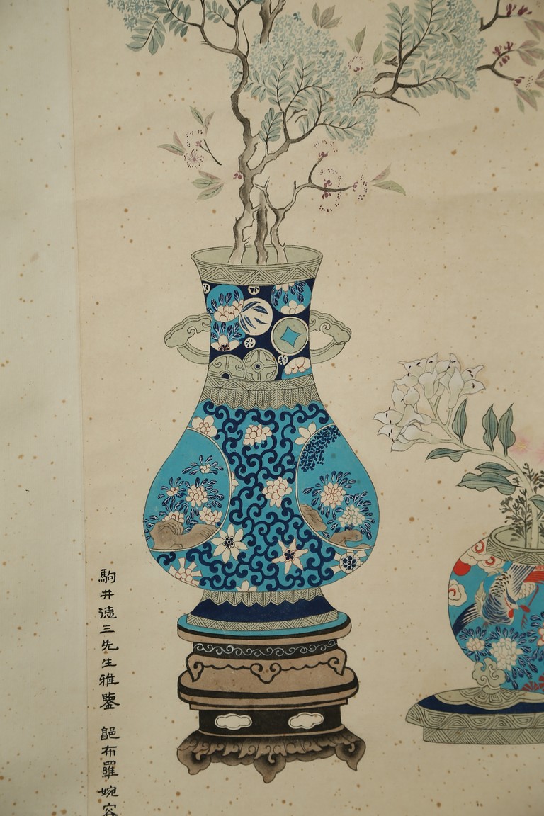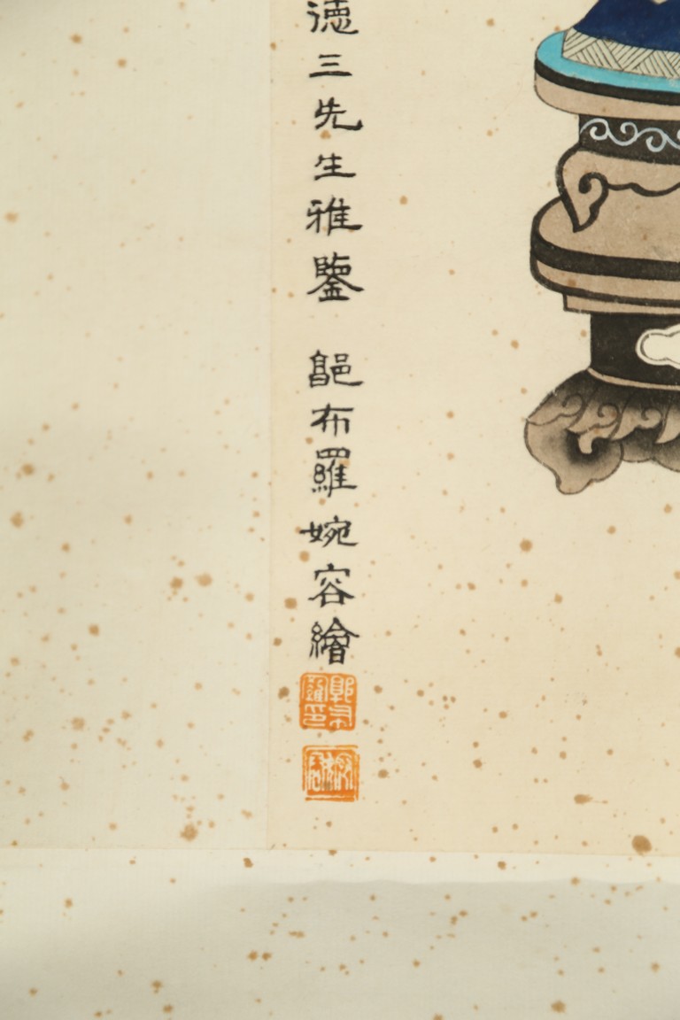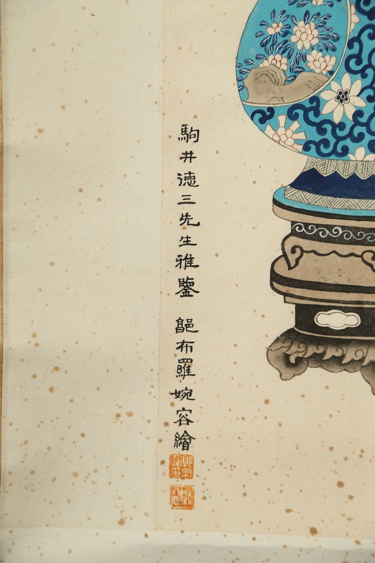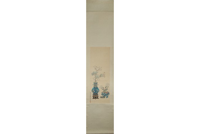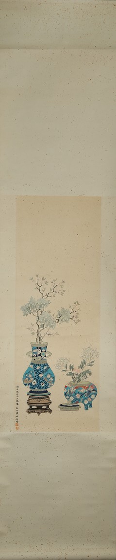 Ink and color on paper painting. Bogu Vases. Hanging scroll. Signed Wan Rong and with two seals of the artist.