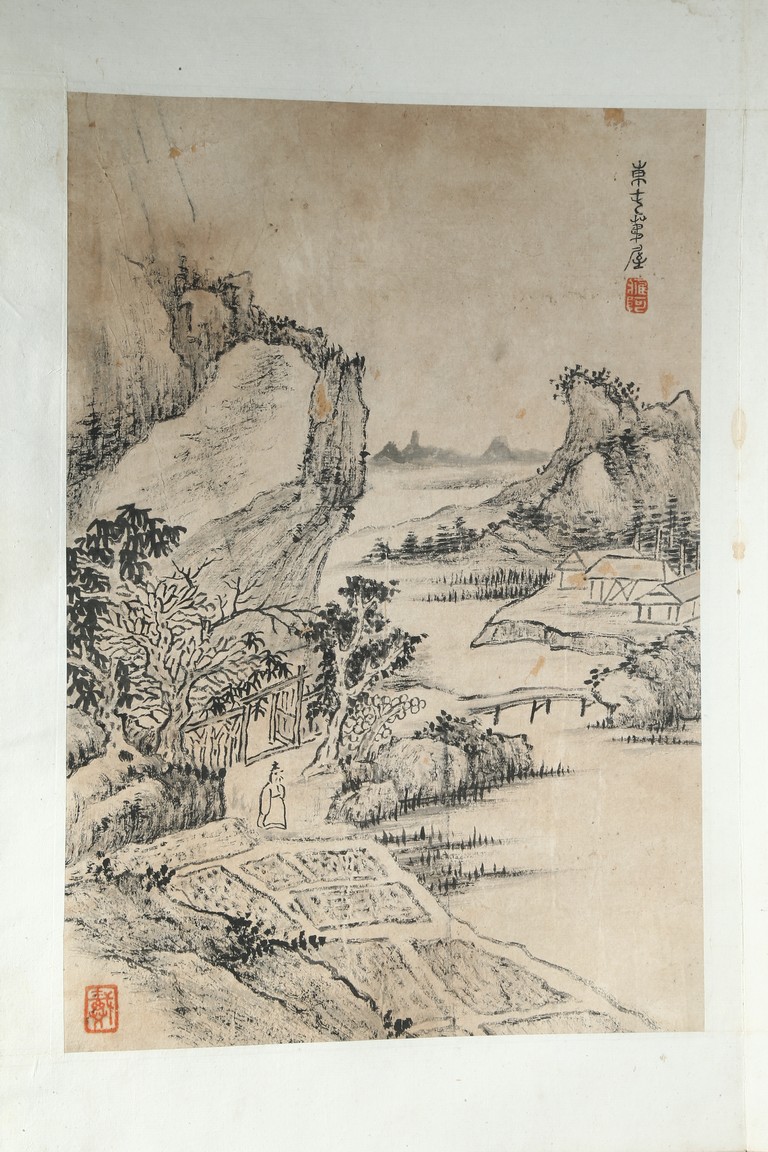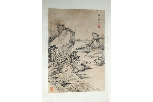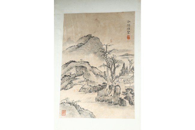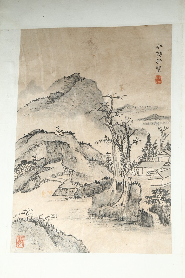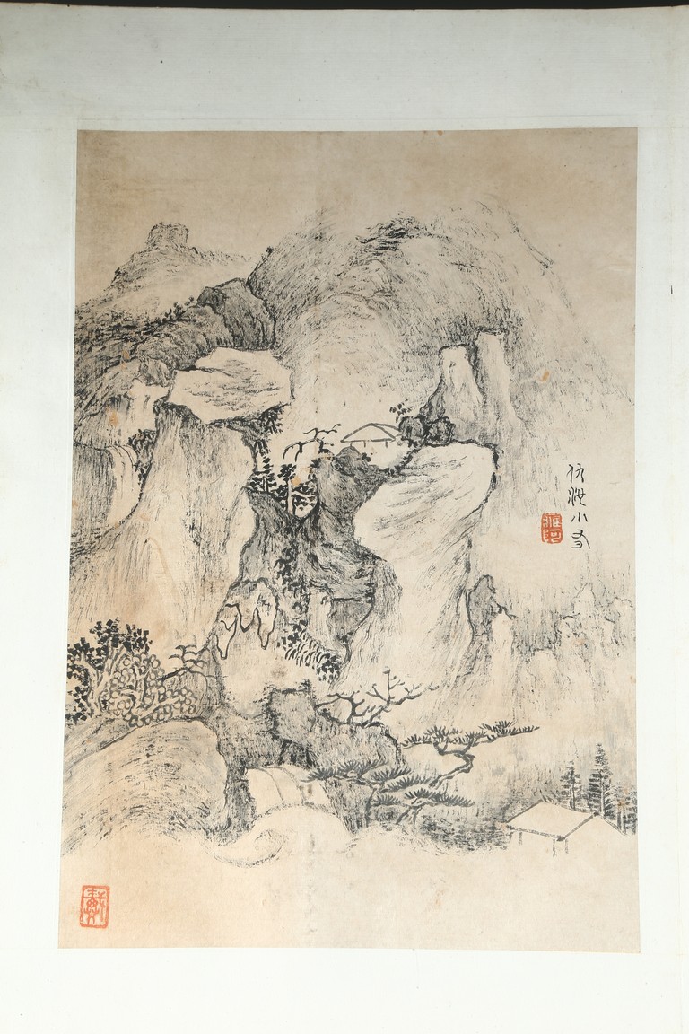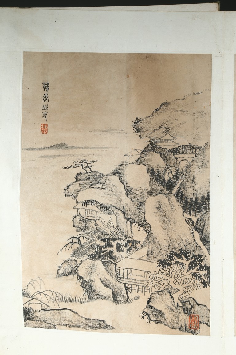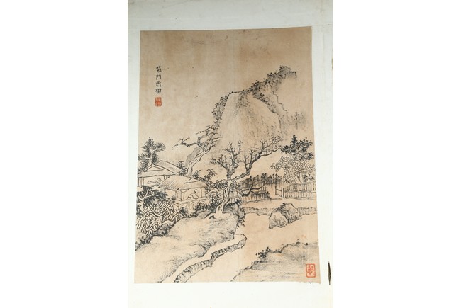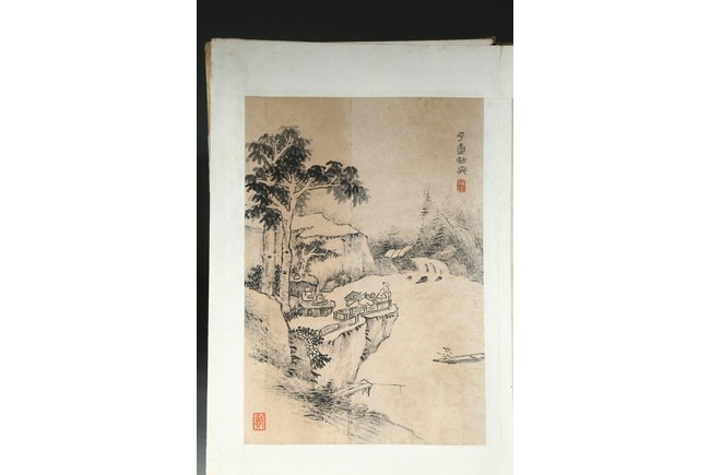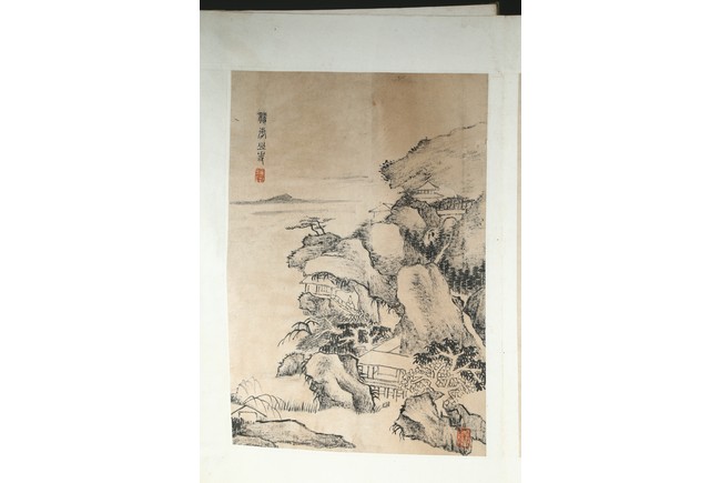 Ink on paper. Landscape and running script. Ten-leaf album painting. Signed by Dai Benxiao and with four seals of the artist.