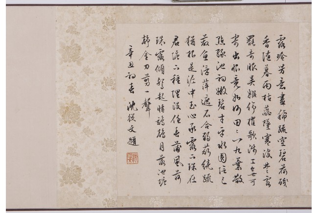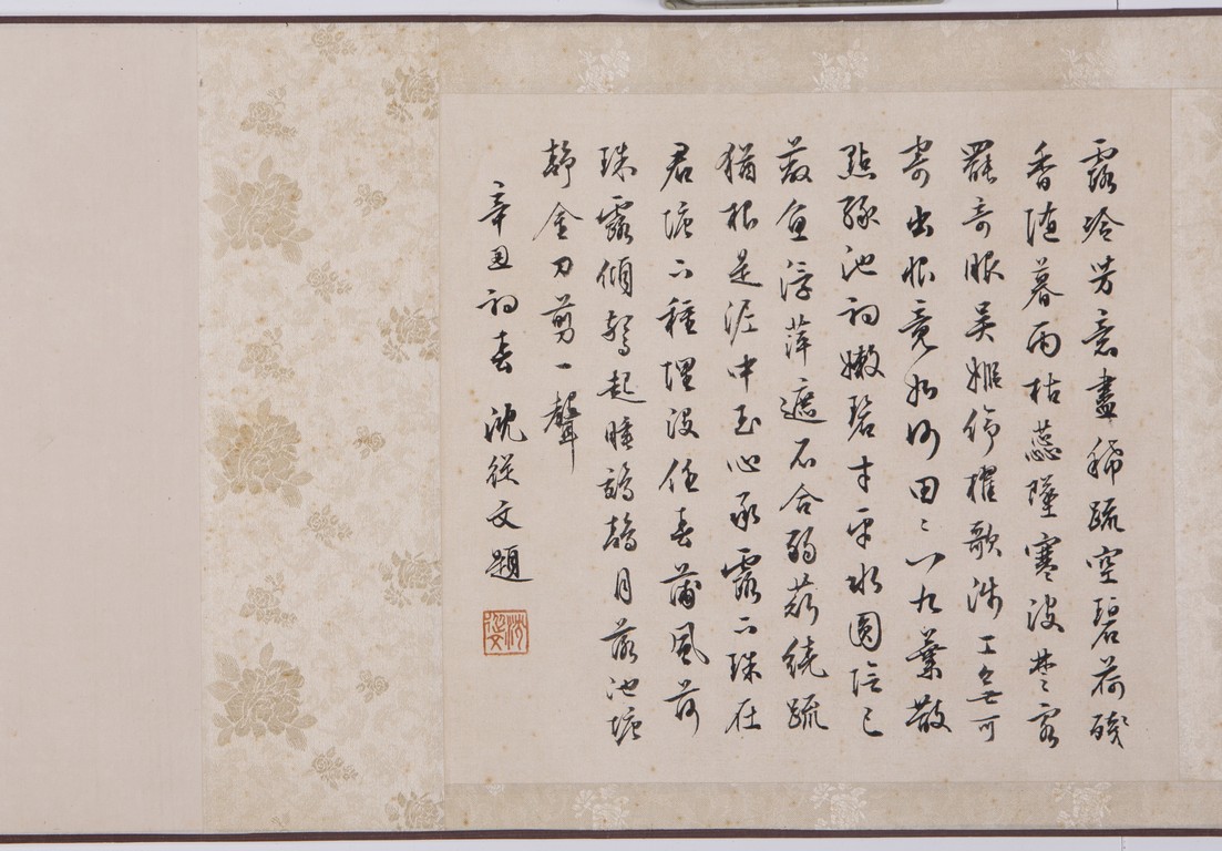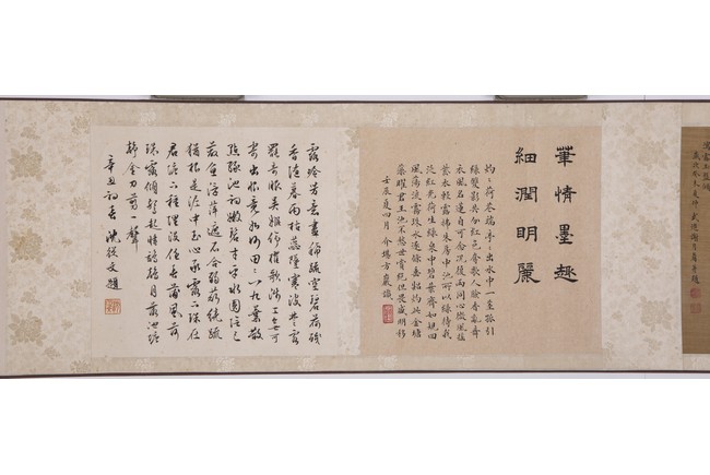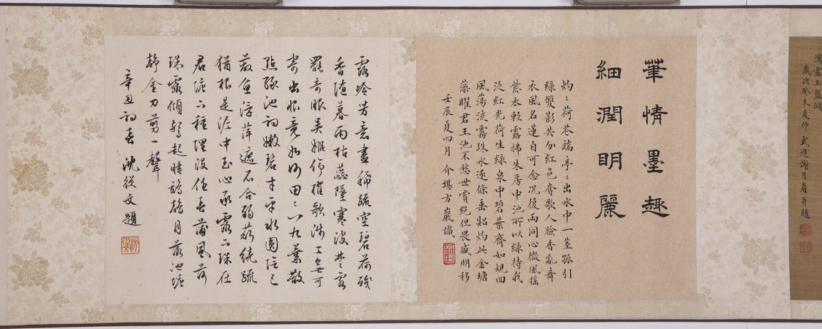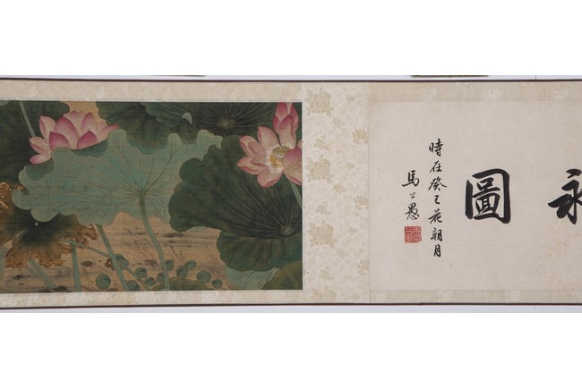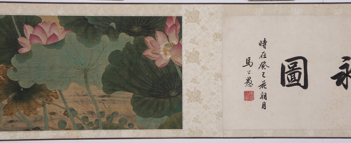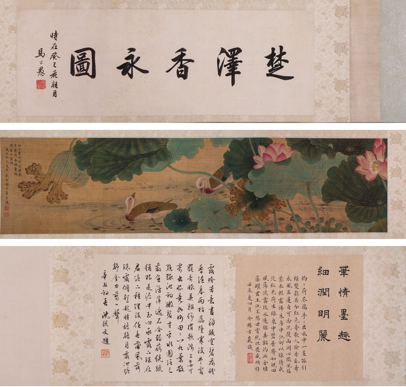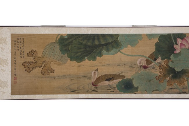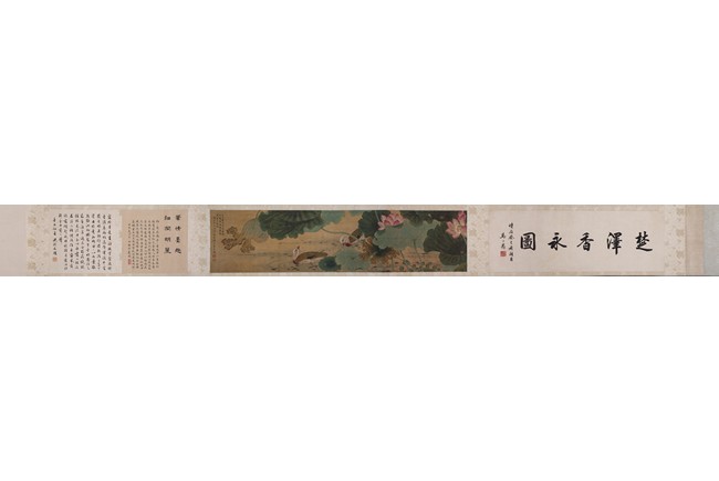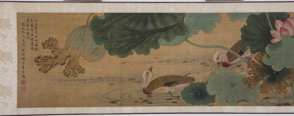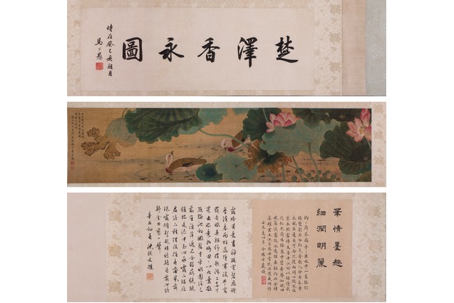 Ink and color on silk painting. Lotus and mandarin duck. Handscroll. Signed by Xie Yuenmei with two seals of the artist. Inscribed by Ma Gongyu, Fang Kanyan and Shen Congwen with one seal of the artist each.