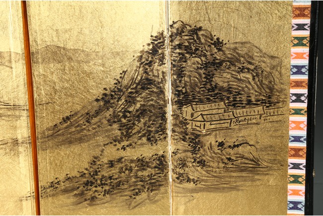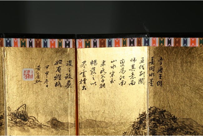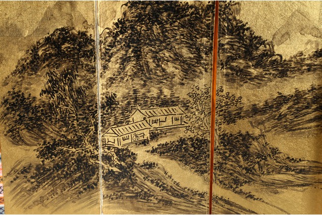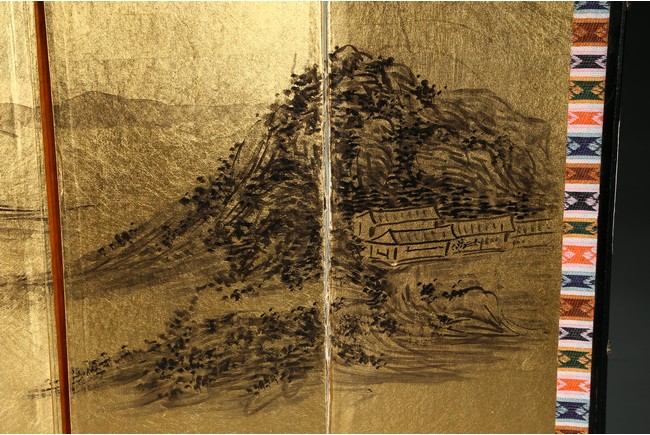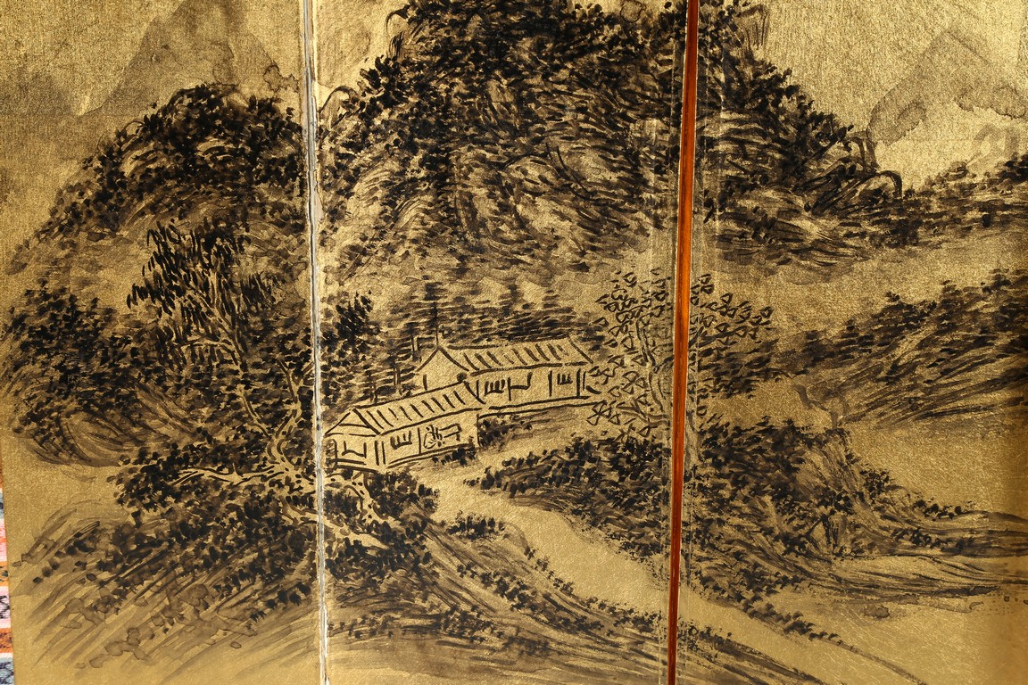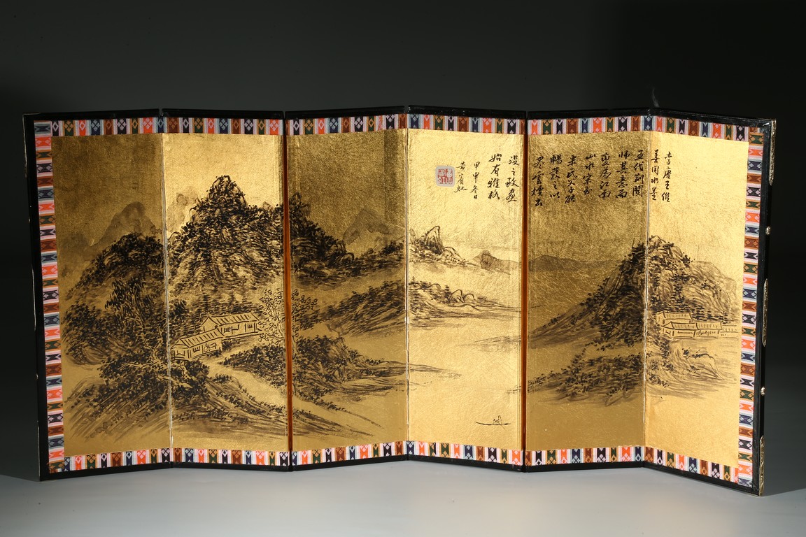 Ink and color on gold paper. Six-fold. Landscape. Inscribed and signed Huang binhong and with one seal of the artist.
