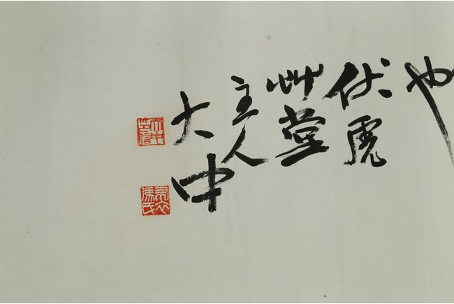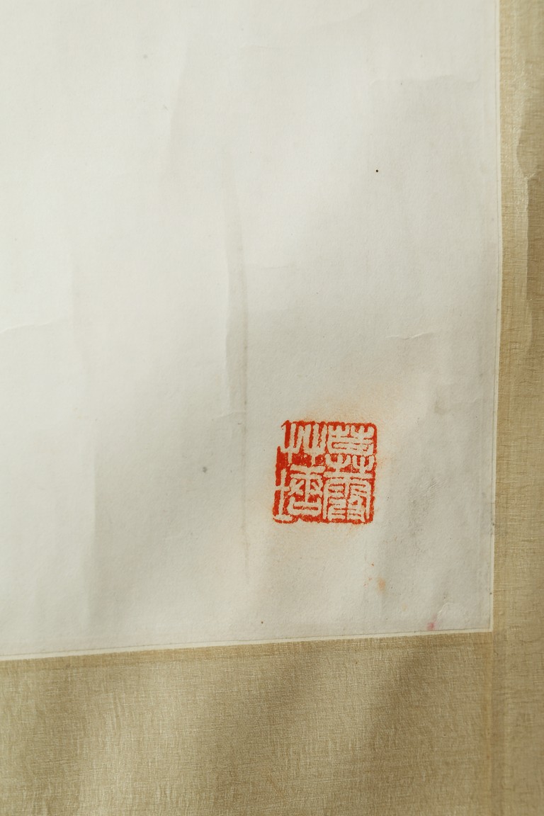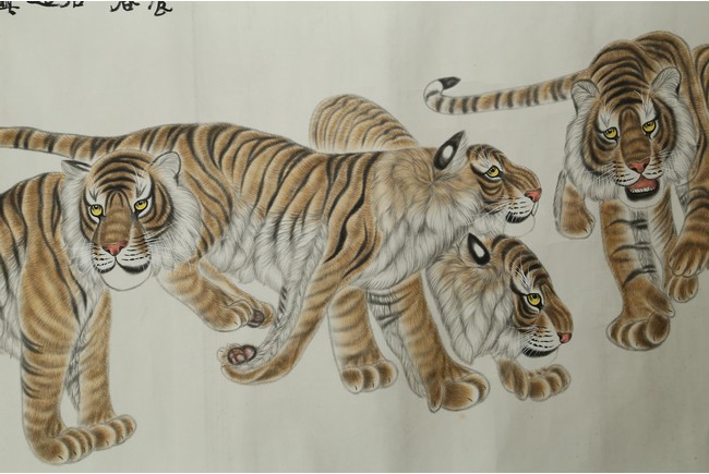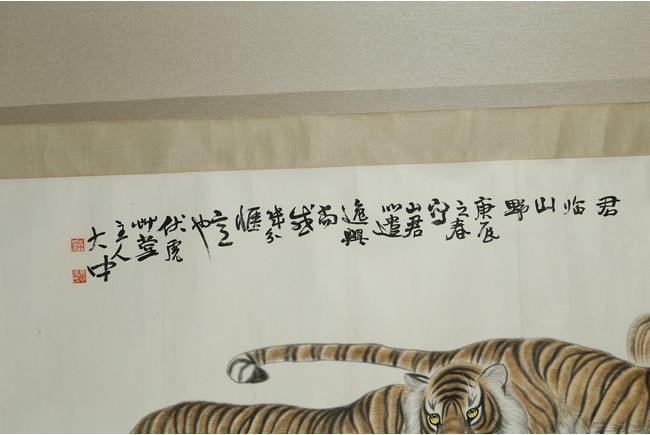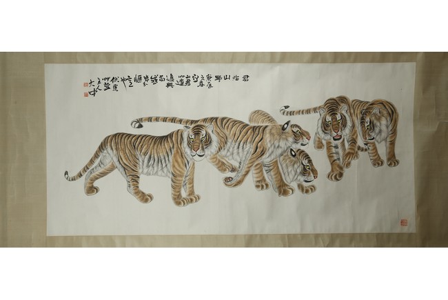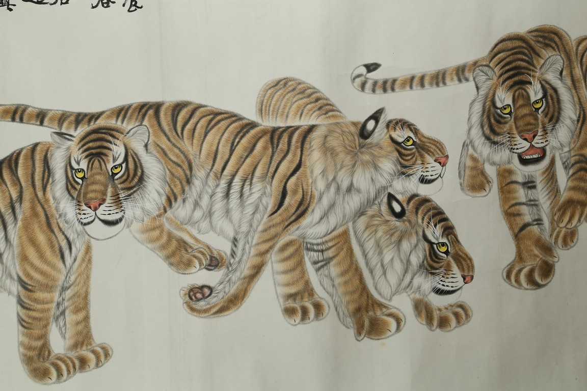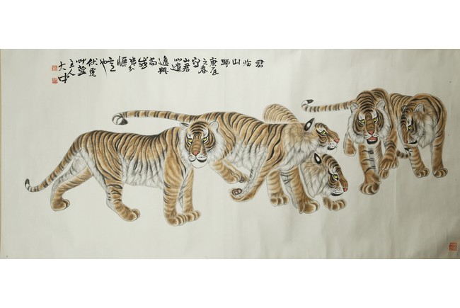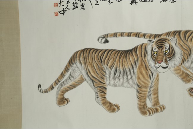 Ink and color on paper painting. Tigers. Scroll. Signed Dazhong and with three seals of the artist.
