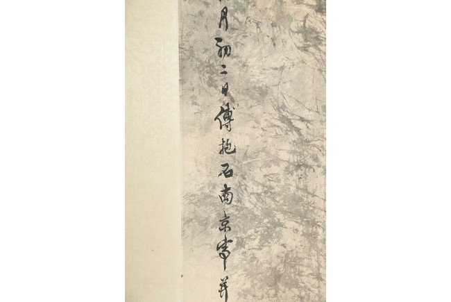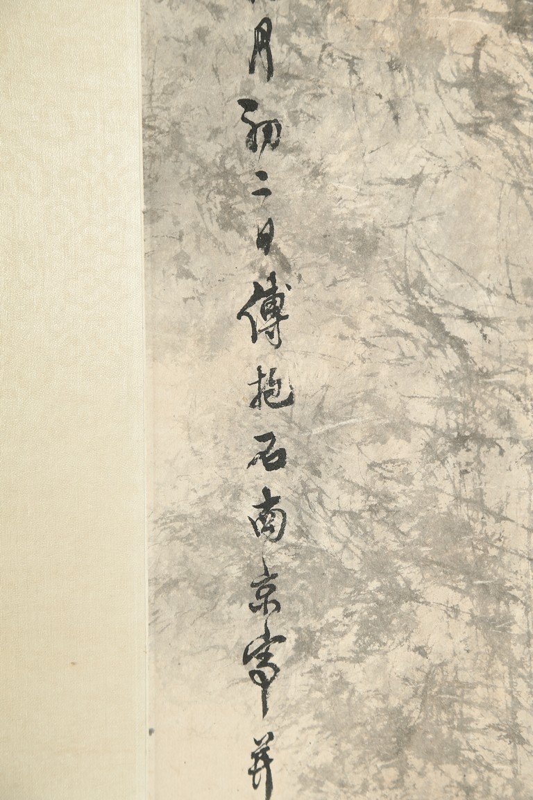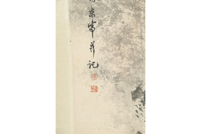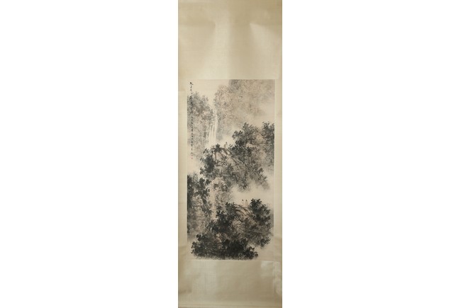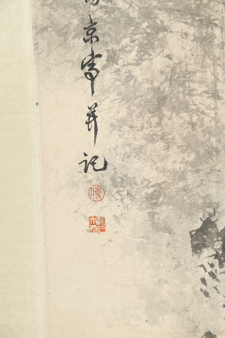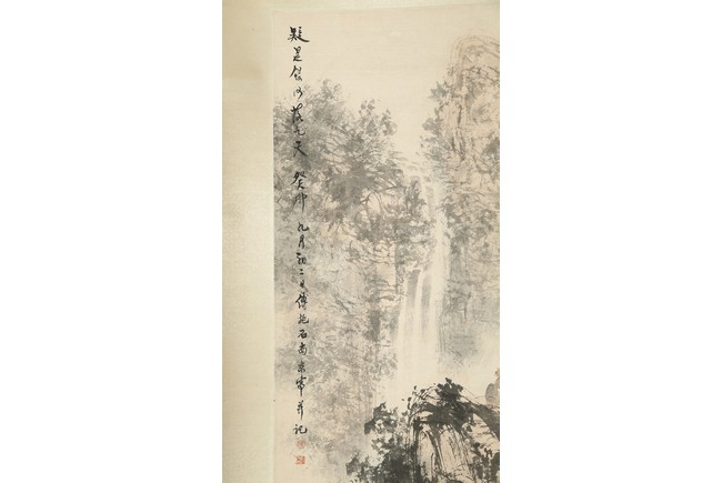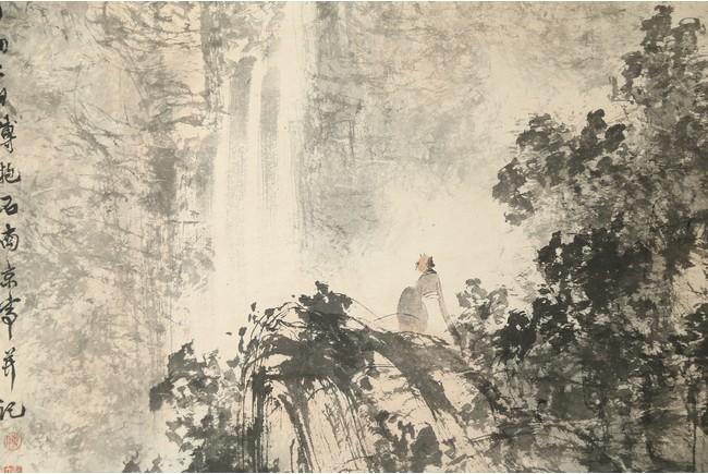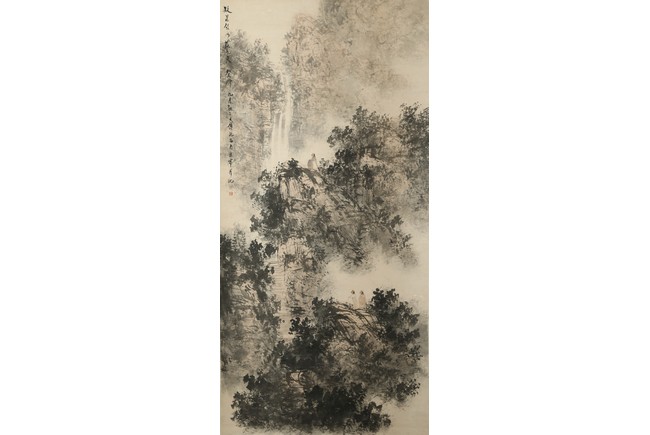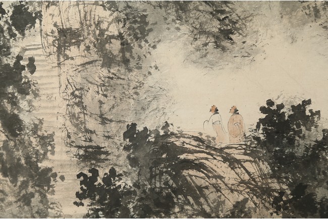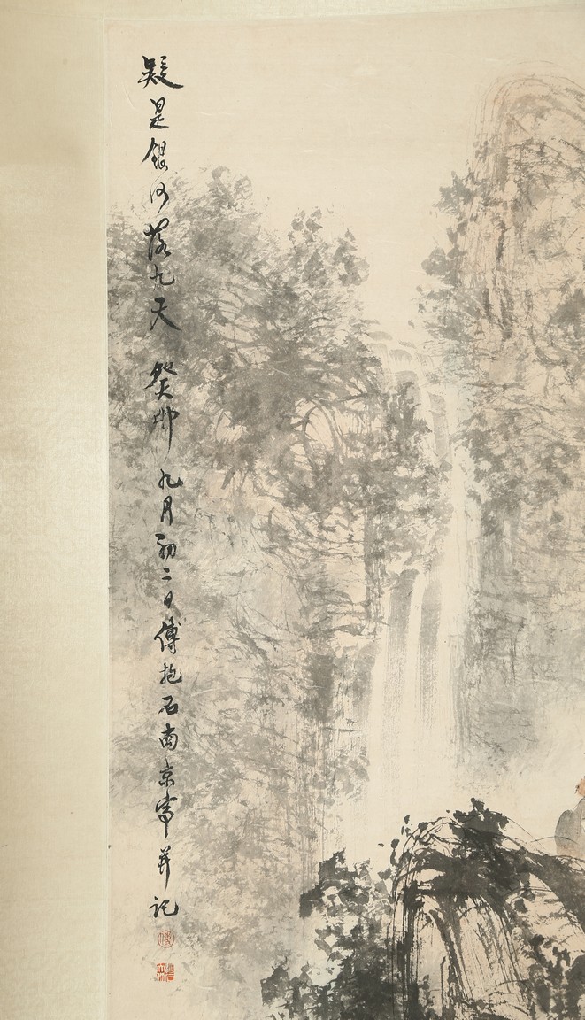 Ink and color on paper painting. Landscape and figures. Hanging scroll. Signed Fu Baoshi and with two seals of the artist.