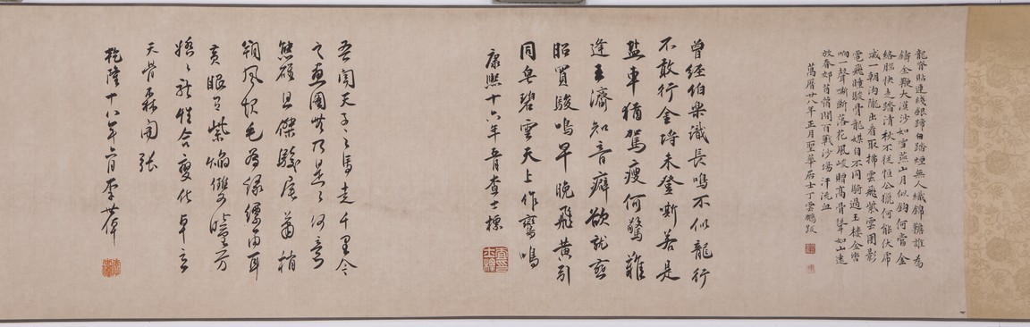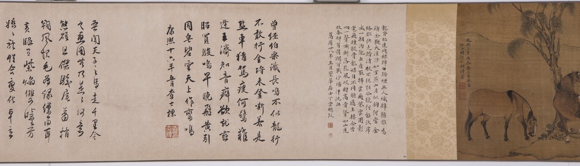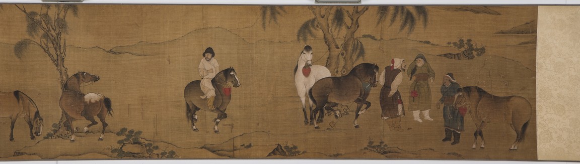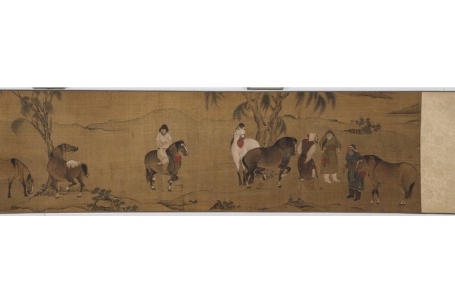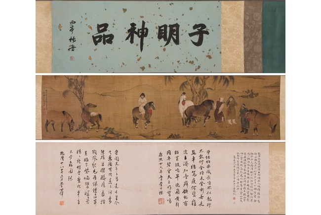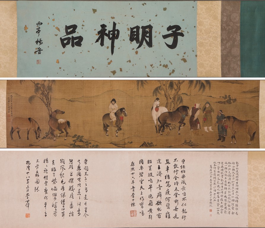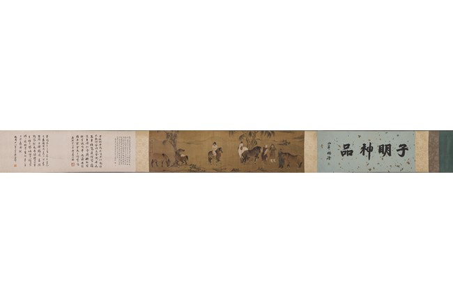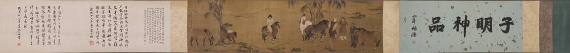 Ink and color on silk painting. Six horses and figures. Handscroll. Painting signed Ren Ziming and with two seals of the artist. Frontispiece signed Yang Jin. Annotations signed Ding Yunpeng, Zha Shibiao, and Li Shiwei.